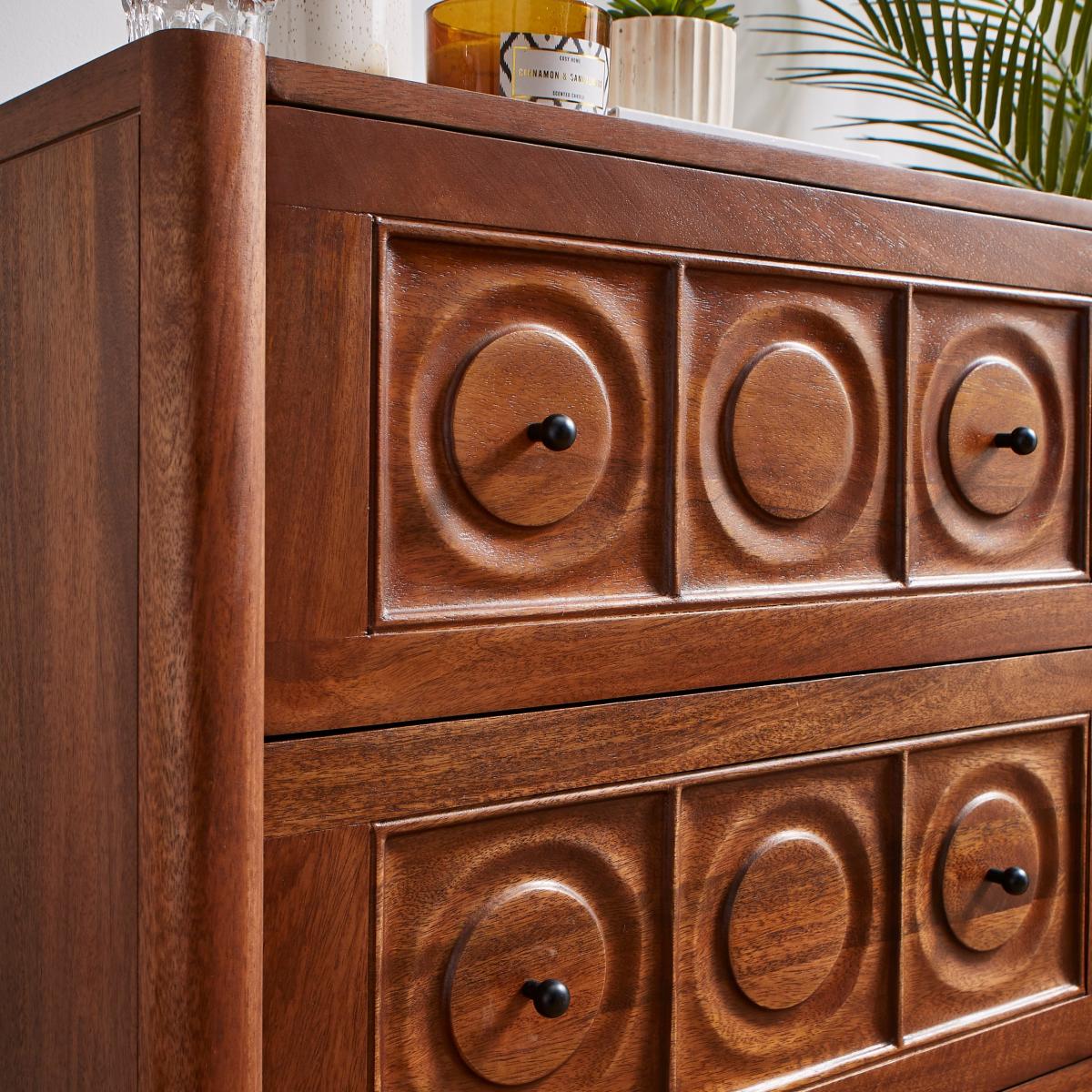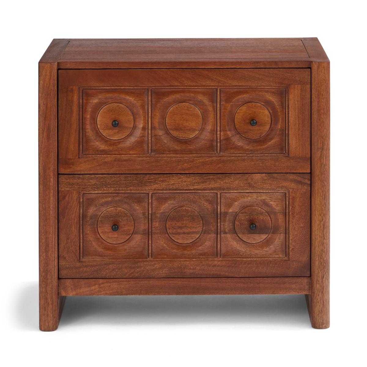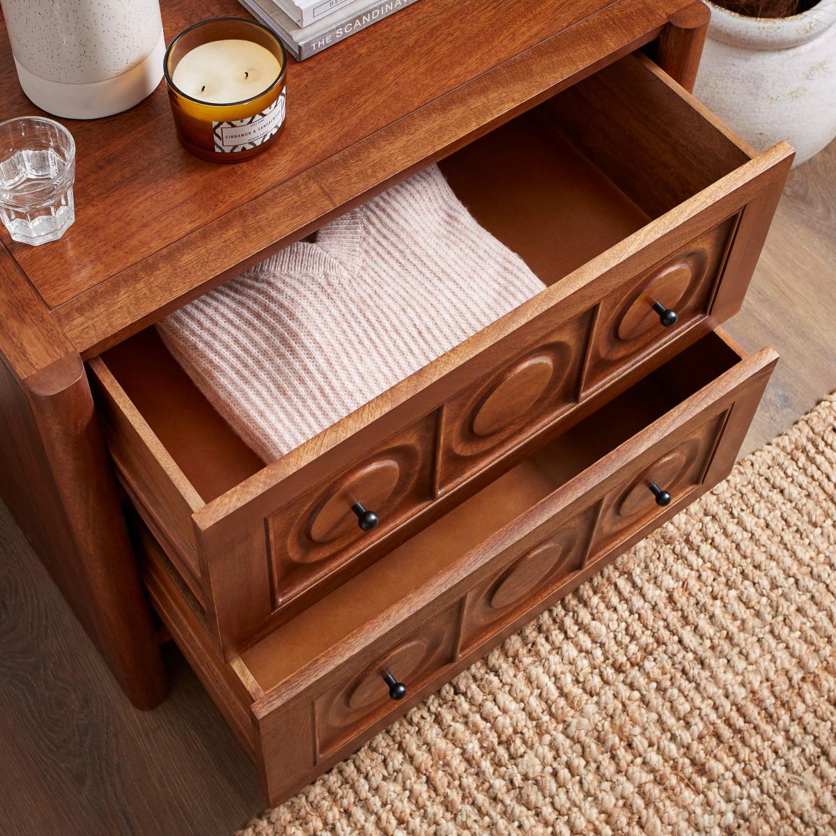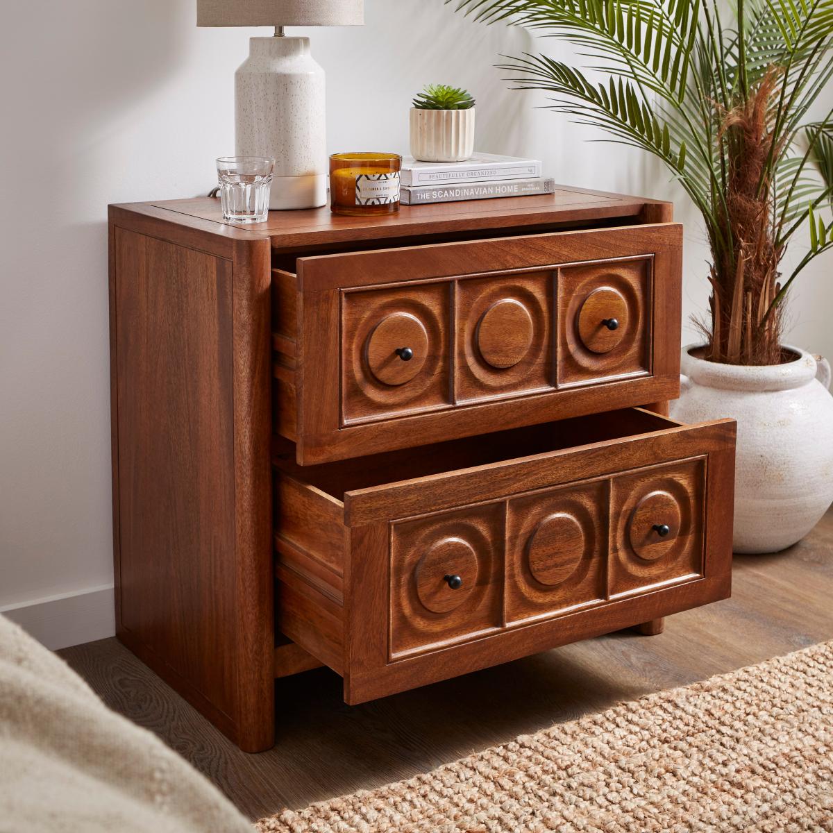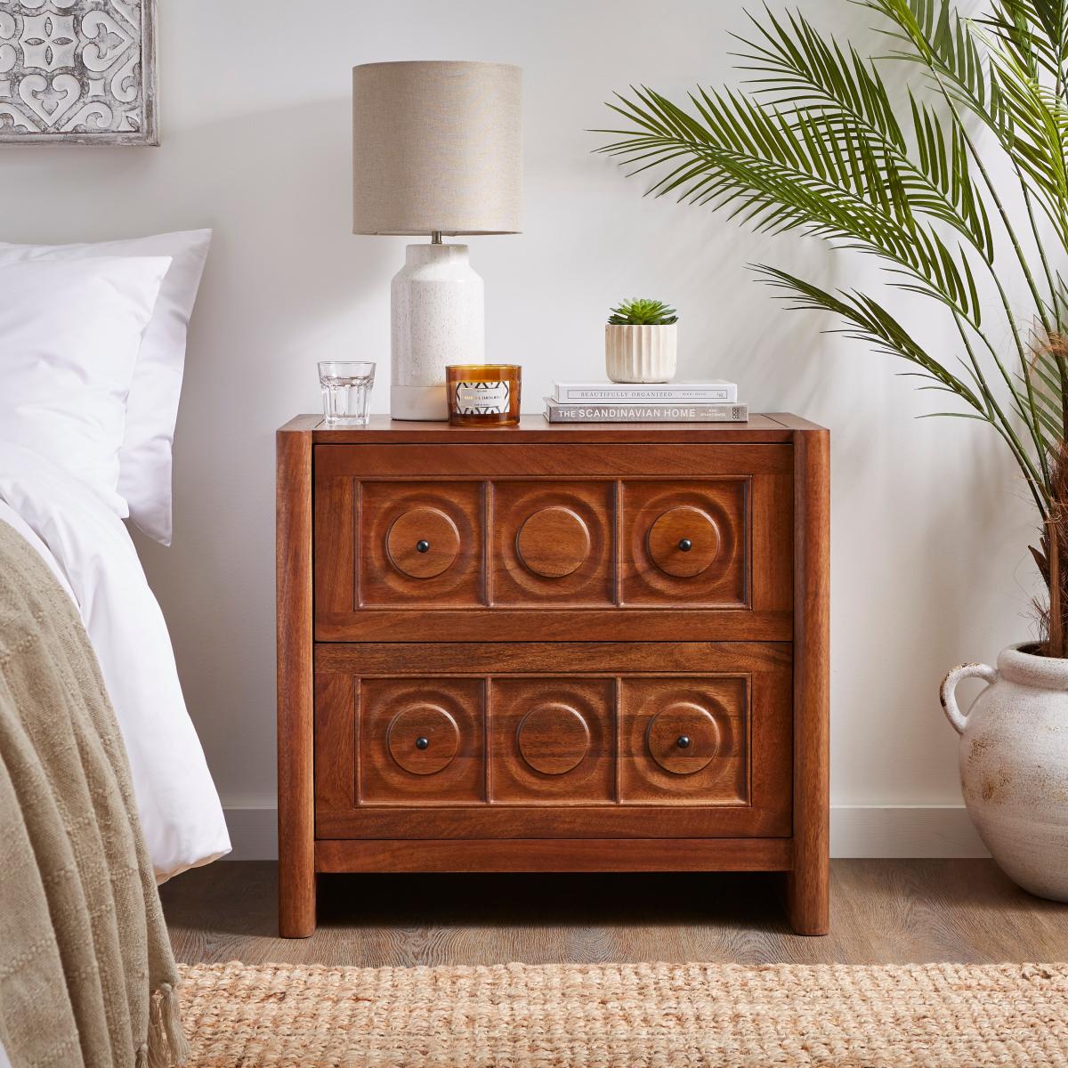 Dunelm Exclusive - Designed and Developed by Dunelm* Made from Mango Wood; Dense material with a warm, golden-brown shade and interlocking grain pattern. * Modern style Blending functionality with natural beauty, this bedside unit is a stunning addition to any bedroom. Crafted from solid mango wood, with a carved detail front, it showcases the rich textures and unique grain patterns that make each piece truly one of a kind. With two spacious drawers, it offers generous storage for your bedside essentials, all while maintaining a sleek and minimalist aesthetic. The natural warmth and character of mango wood gives this unit organic charm, adding a touch of rustic elegance that enhances any bedroom décor. Delivered fully assembled and placed in the room of your choice, it’s ready to enhance your space from the moment it arrives. The Theodore collection is also available in more pieces, designed to complement any room in your home.