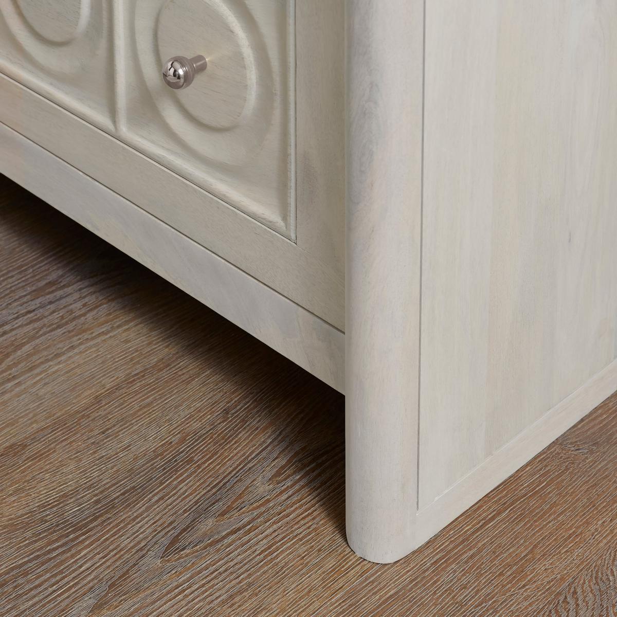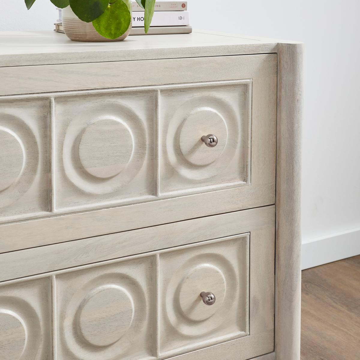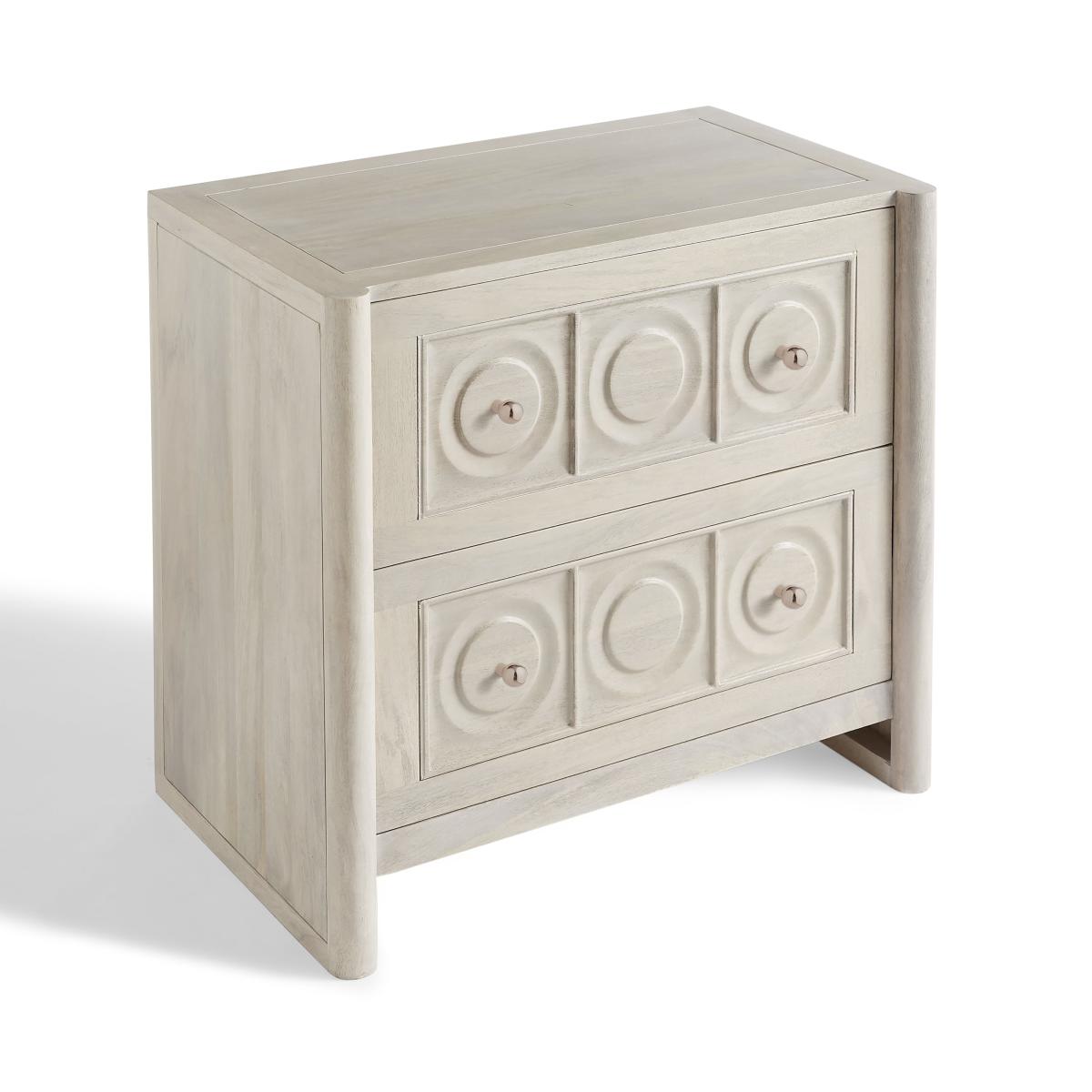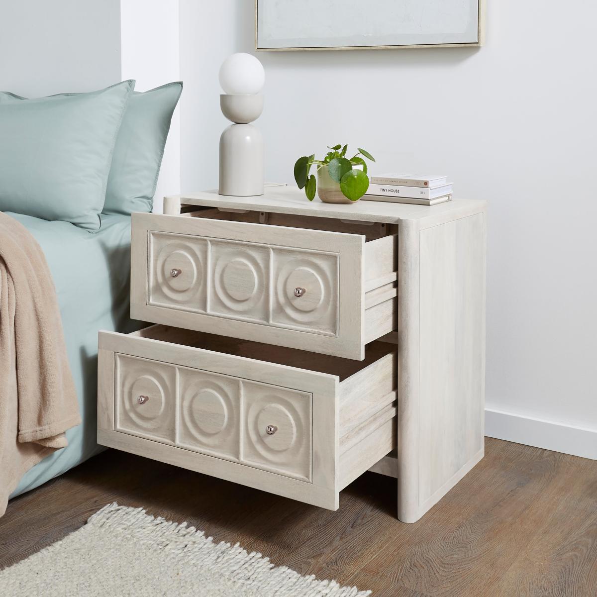 Dunelm Exclusive - Designed and Developed by Dunelm* Made from Mango Wood; Dense material with a warm, golden-brown shade and interlocking grain pattern. * Modern style Blending functionality with natural beauty, this bedside unit is a stunning addition to any bedroom. Crafted from solid mango wood, with a carved detail front, it showcases the rich textures and unique grain patterns that make each piece truly one of a kind. With two spacious drawers, it offers generous storage for your bedside essentials, all while maintaining a sleek and minimalist aesthetic. The natural warmth and character of mango wood gives this unit organic charm, adding a touch of rustic elegance that enhances any bedroom décor. Delivered fully assembled and placed in the room of your choice, it’s ready to enhance your space from the moment it arrives. The Theodore collection is also available in more pieces, designed to complement any room in your home.