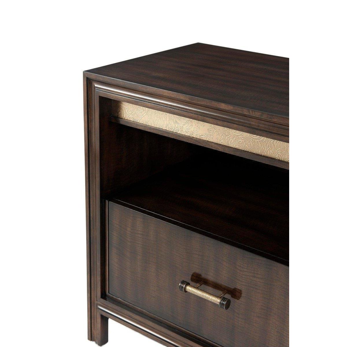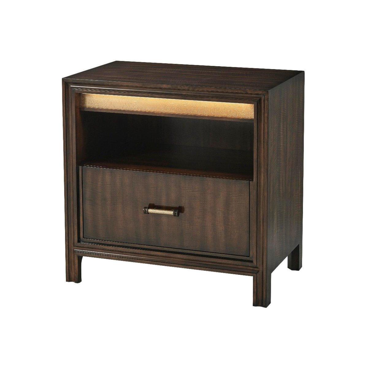 A figured anagre veneered and etched brass nightstand, the rectangular top above a recessed illuminated etched brass frieze panel, above an open shelf and one deep self closing drawer with an etched brass and wooden baton handle, all within a moulded frame, on similar legs.