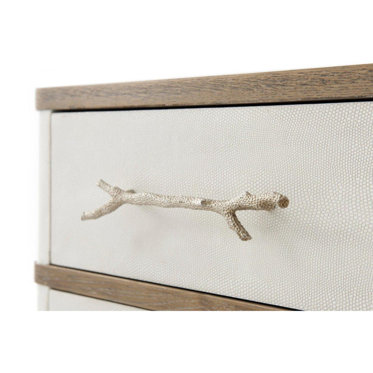 Nightstand or chest figured ofram veneer & solid oak cerused mangrove finish komodo embossed leather panelled three drawers with new champagne finish textured coral cast handles soft closing drawer runners. This item must be installed by a licensed contractor with the wall anchoring Anti-Tip kit provided.