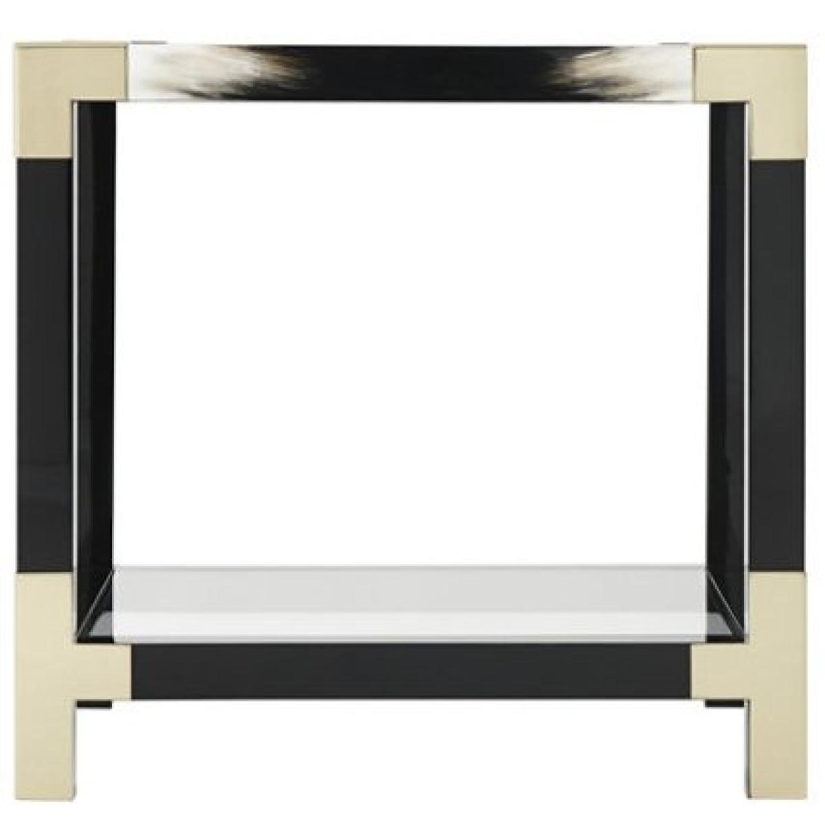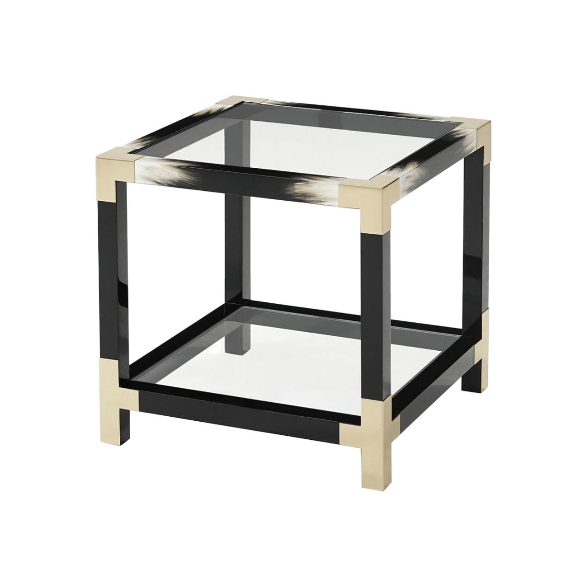 A black lacquered and faux horn accent table, the square glass inset top with brass edged corners, on square legs joined by stretchers and an inset glass undertier.