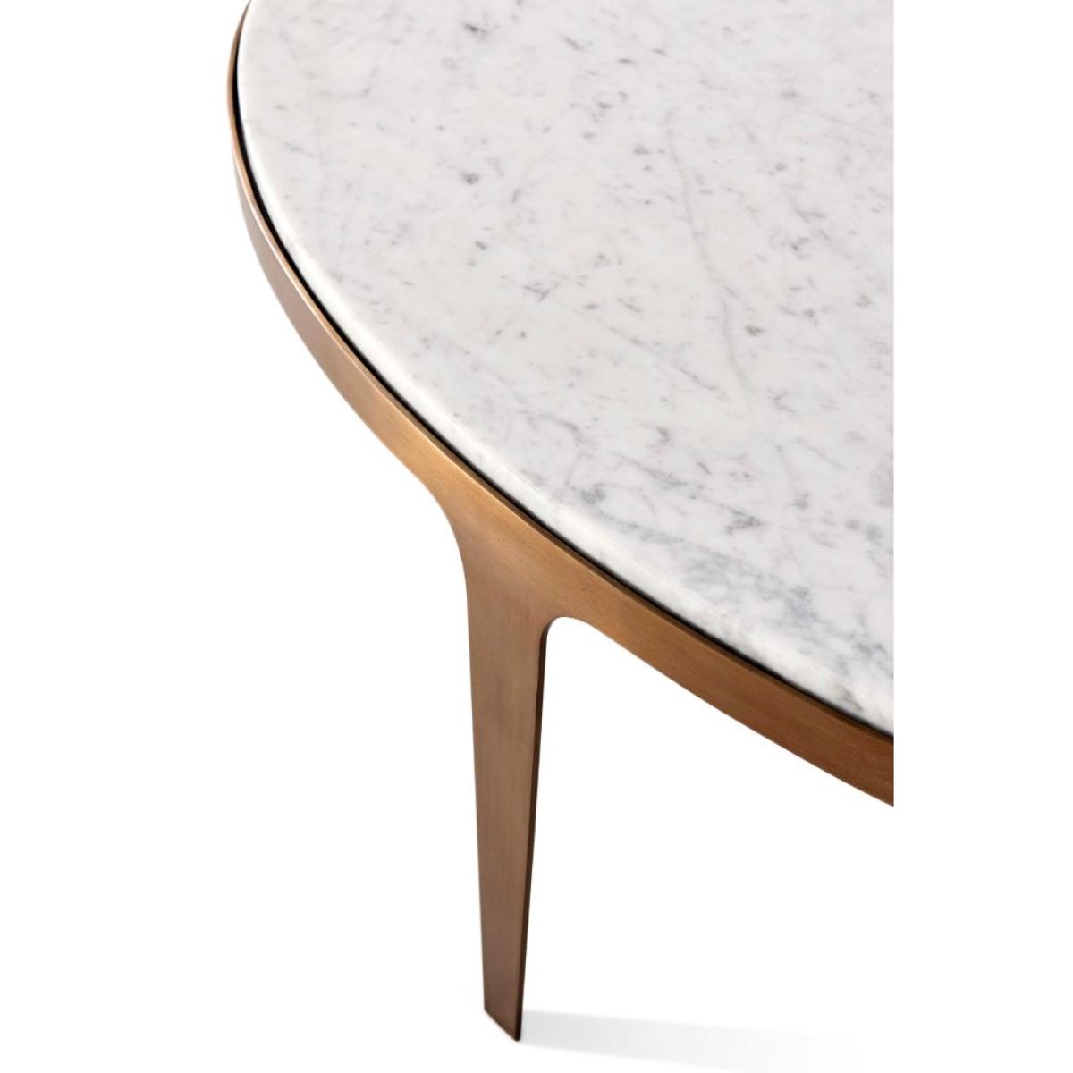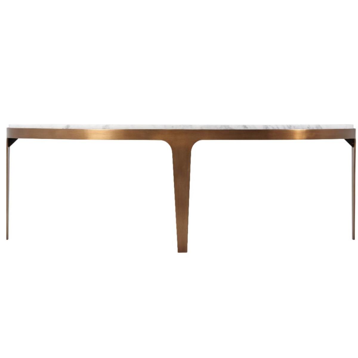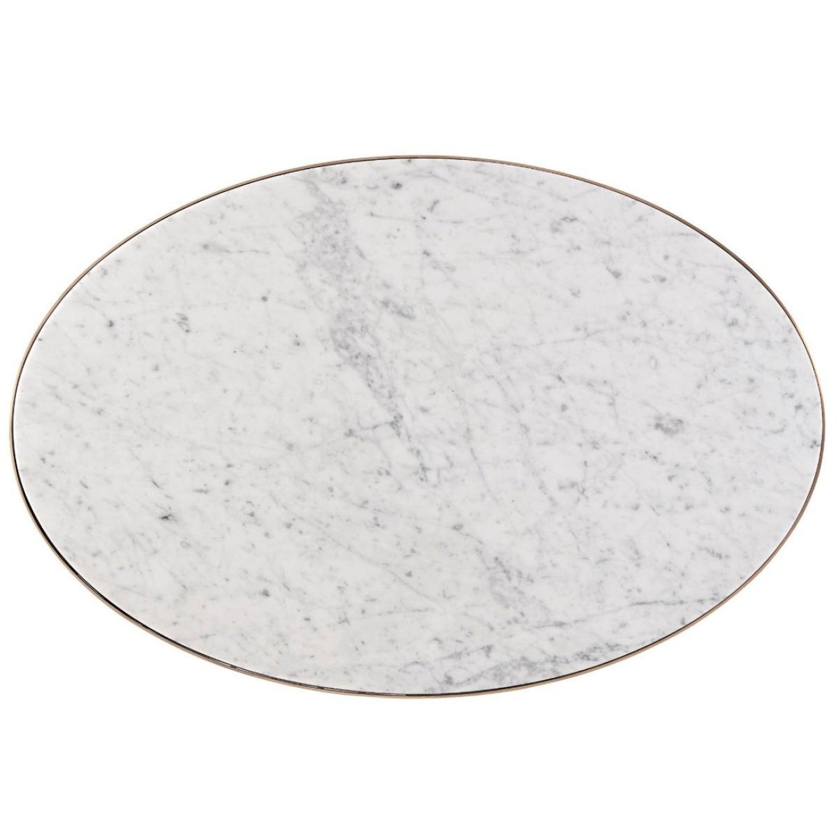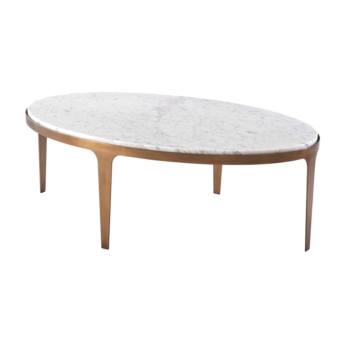 Coffee table. oval bianco carrara marble inset top. Brushed brass finish metal base.