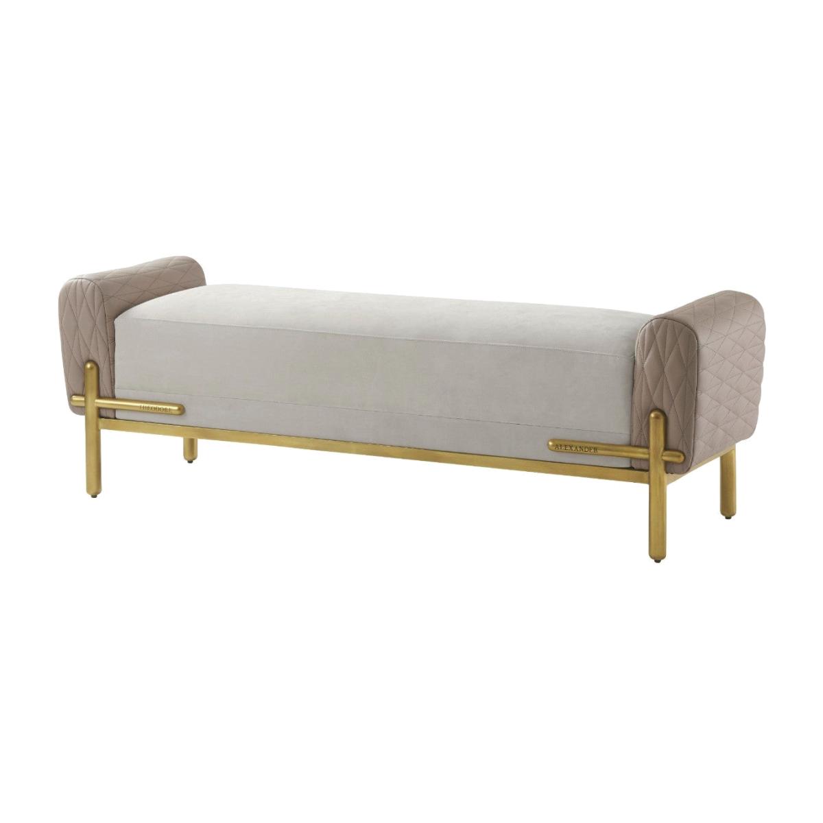 Iconic bench upholstered in tuber (LE0400) and rosepine (LE0387) leathers. It features a boxed seat with domed top and geometrically quilted arms and sits on a raised icon bronze finish base with proud baton legs and strap details.