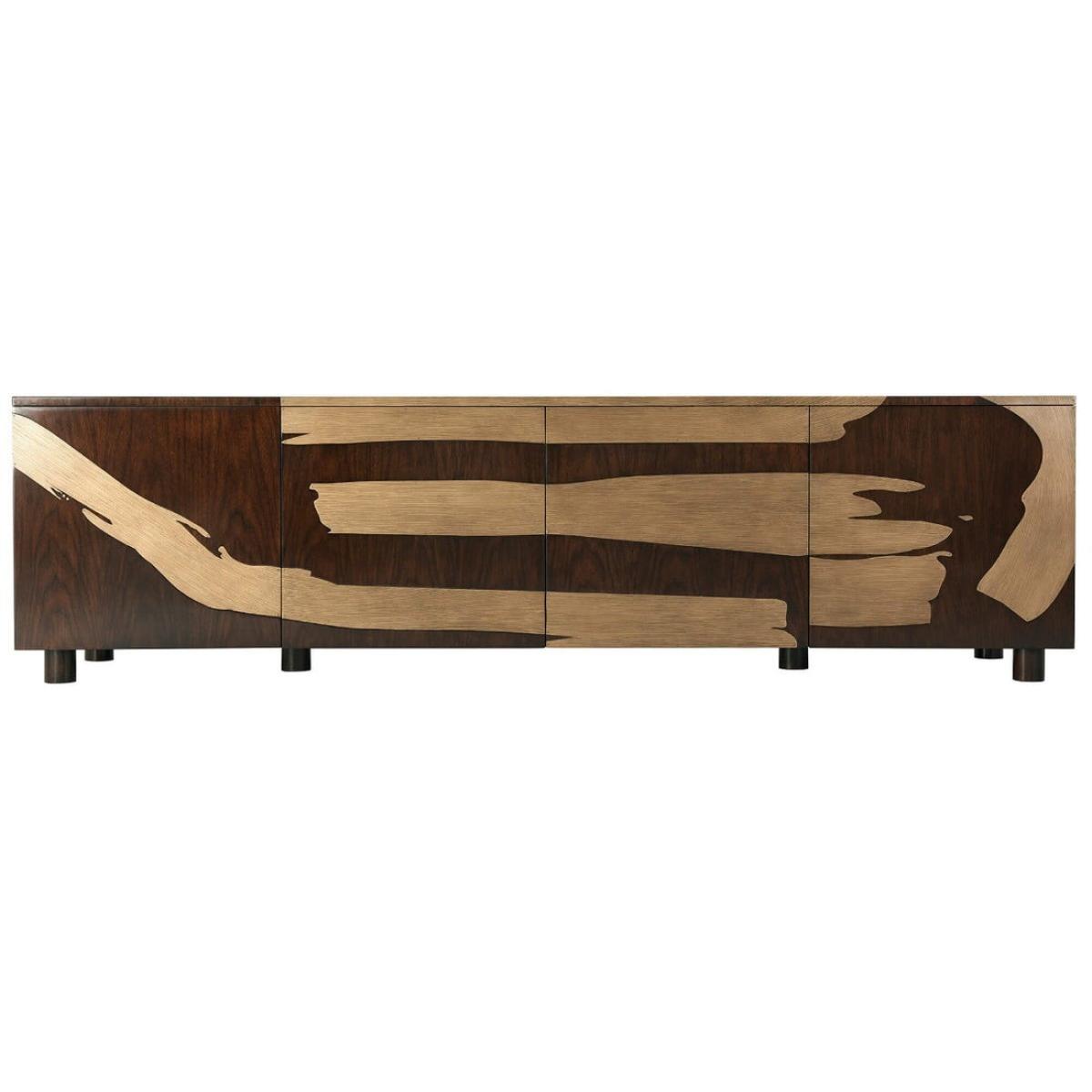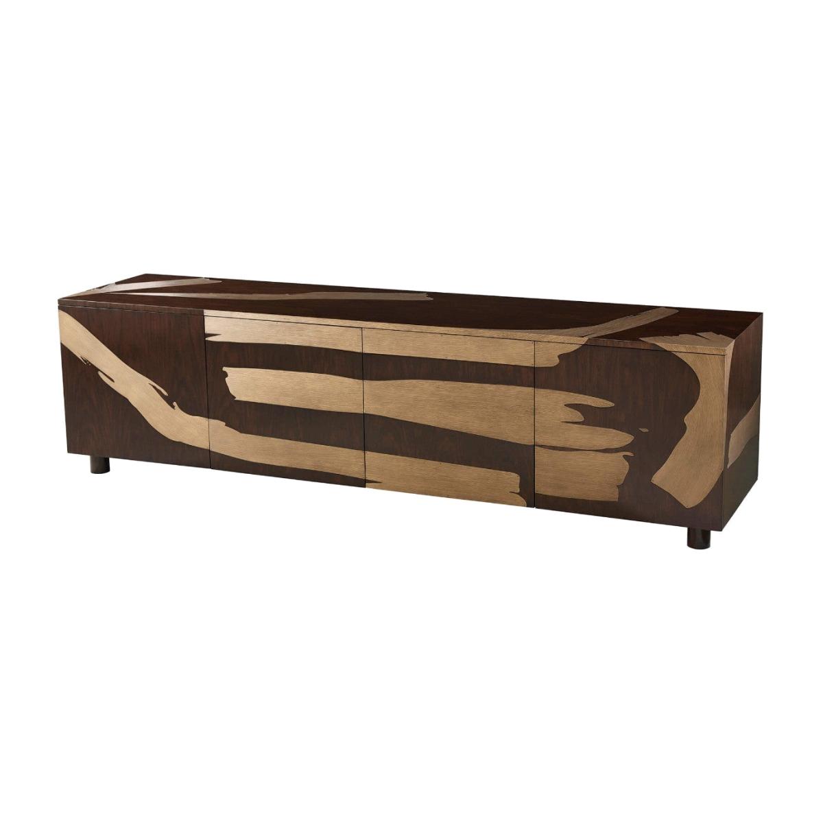 I love this piece for its bold, graphic finish that adds visual interest to any room. It works particularly well in contemporary or eclectic interiors, where its distinctive design can be highlighted with minimalist accessories or contrasting textures. Practical styling tips include pairing it with sleek metallic or monochrome accessories to keep the look refined, and using it as a focal point in a living room with neutral tones. Its large surface area lends itself to pairing with over-sized artwork or decorative objects on top, while the internal storage is perfect for keeping electronic devices or media neatly out of sight to maintain a clean, organised space.