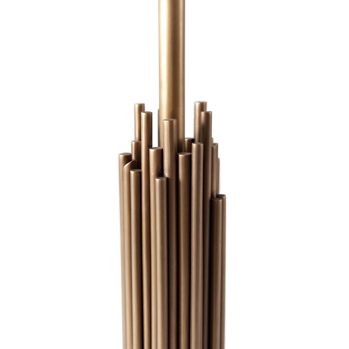 Table lamp. Matte brass clustered offset rods. Mounted on a white marble plinth base. Cylinder shade with brass finial.
