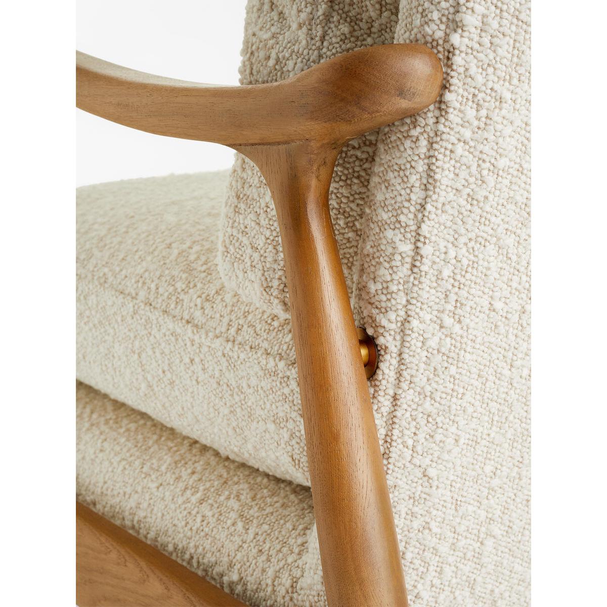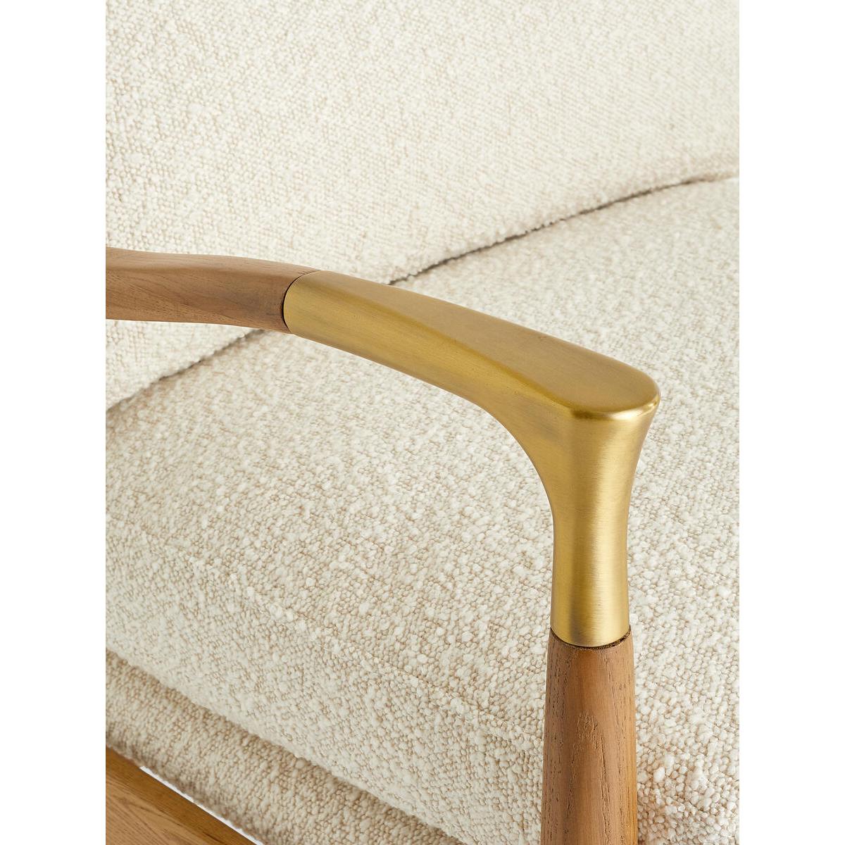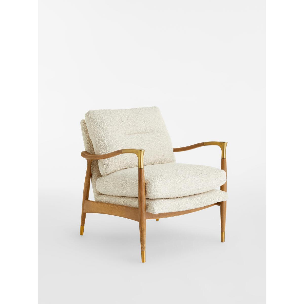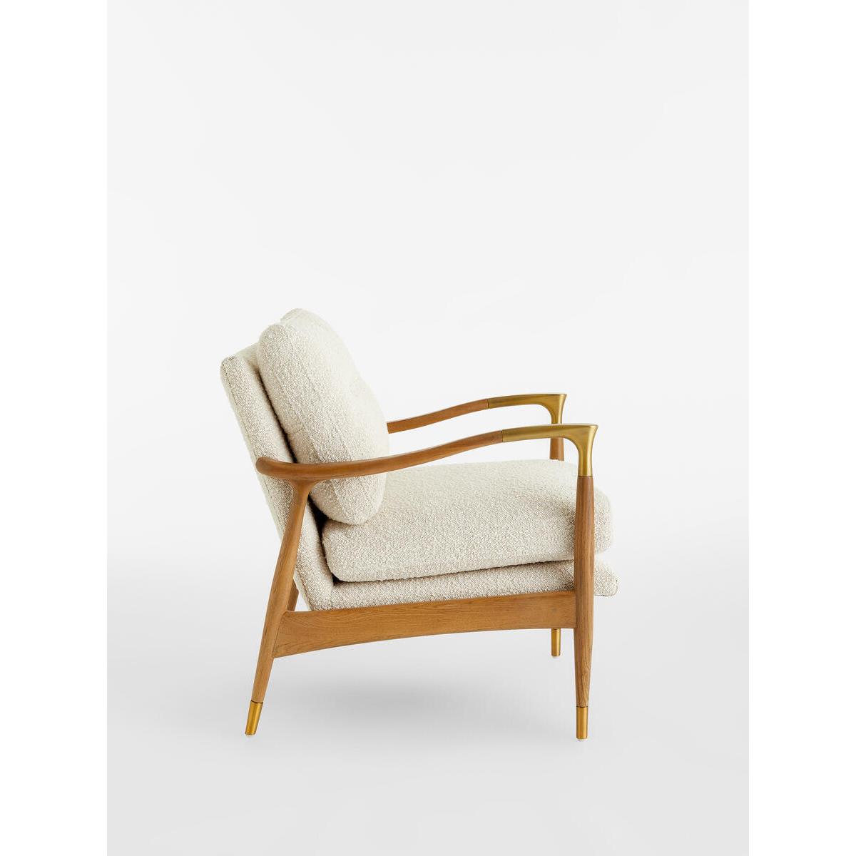 Taking cues from mid-century designs at Soho House Greek Street,our Theodore chair adds a fresh focal point to any living space. Ithas a comfortable, deep-sit shape with down and feather-wrappedfoam cushions upholstered in boucle. The tapered oak wood frame andbrass detailing on the arms complement the clean lines. Handcrafted solid oak frame. Cast brass-detailed arms. Upholstered in boucle. Feather and down-wrapped foam cushions.