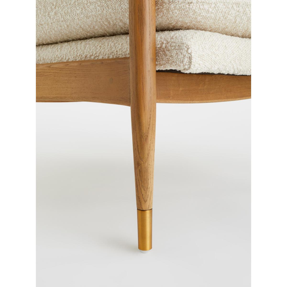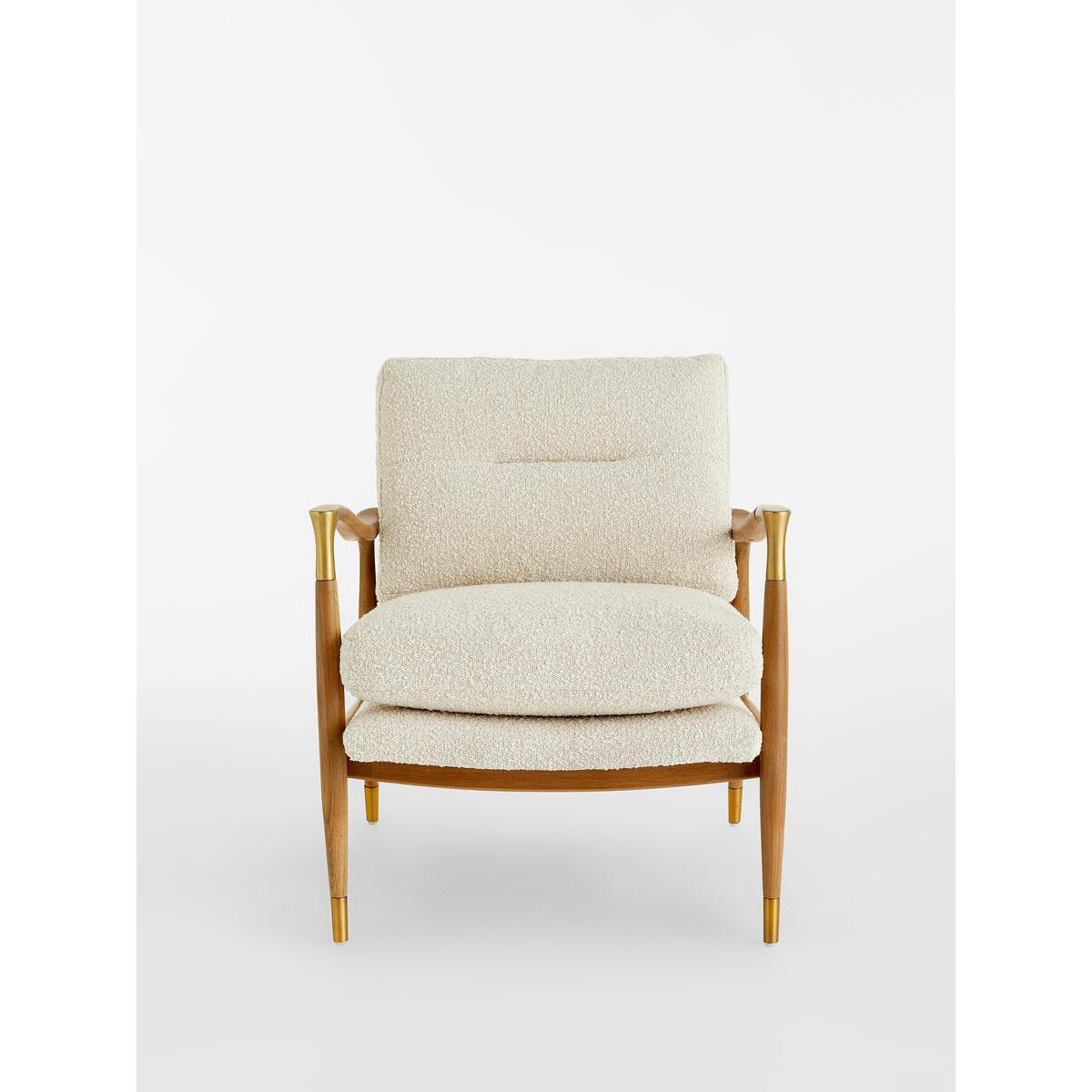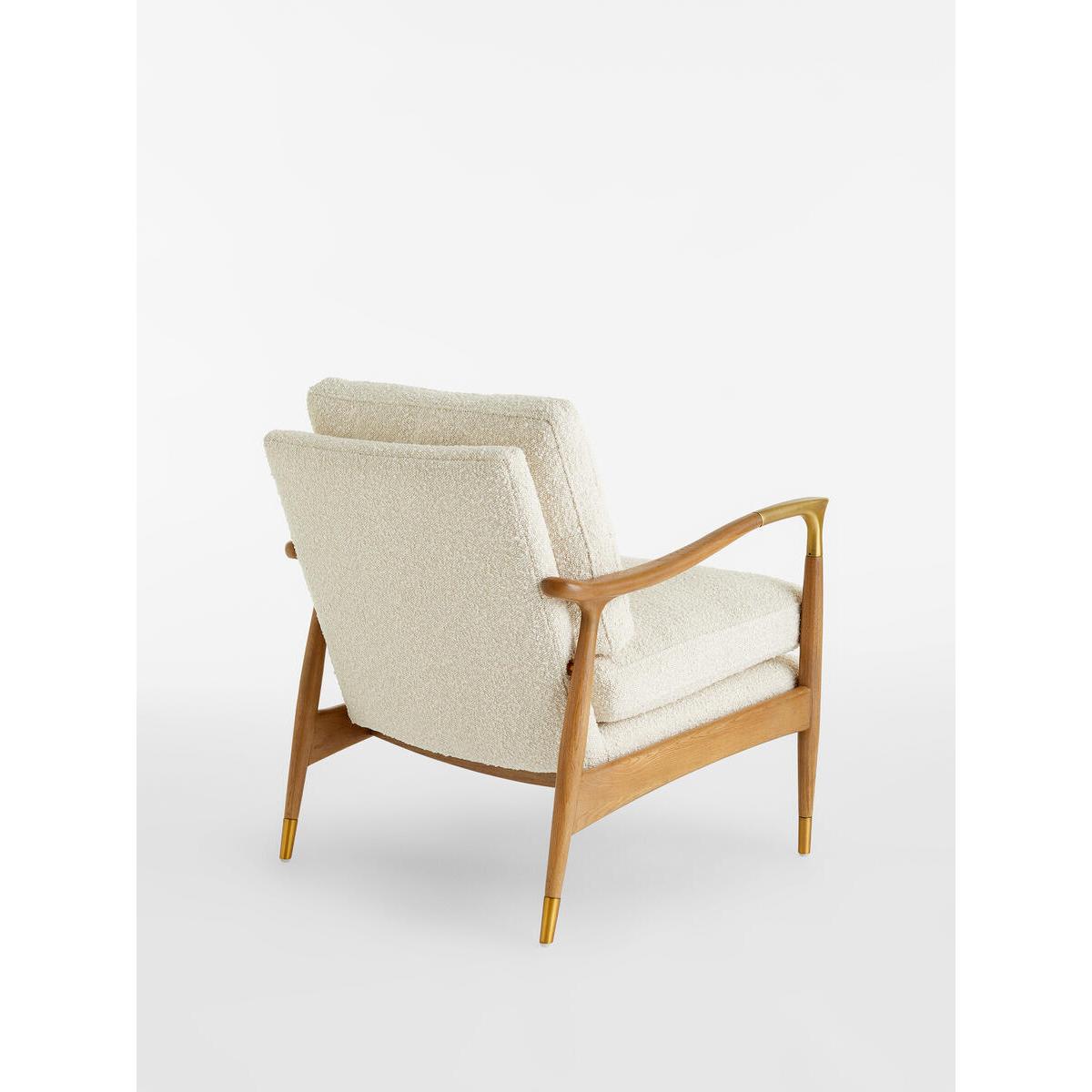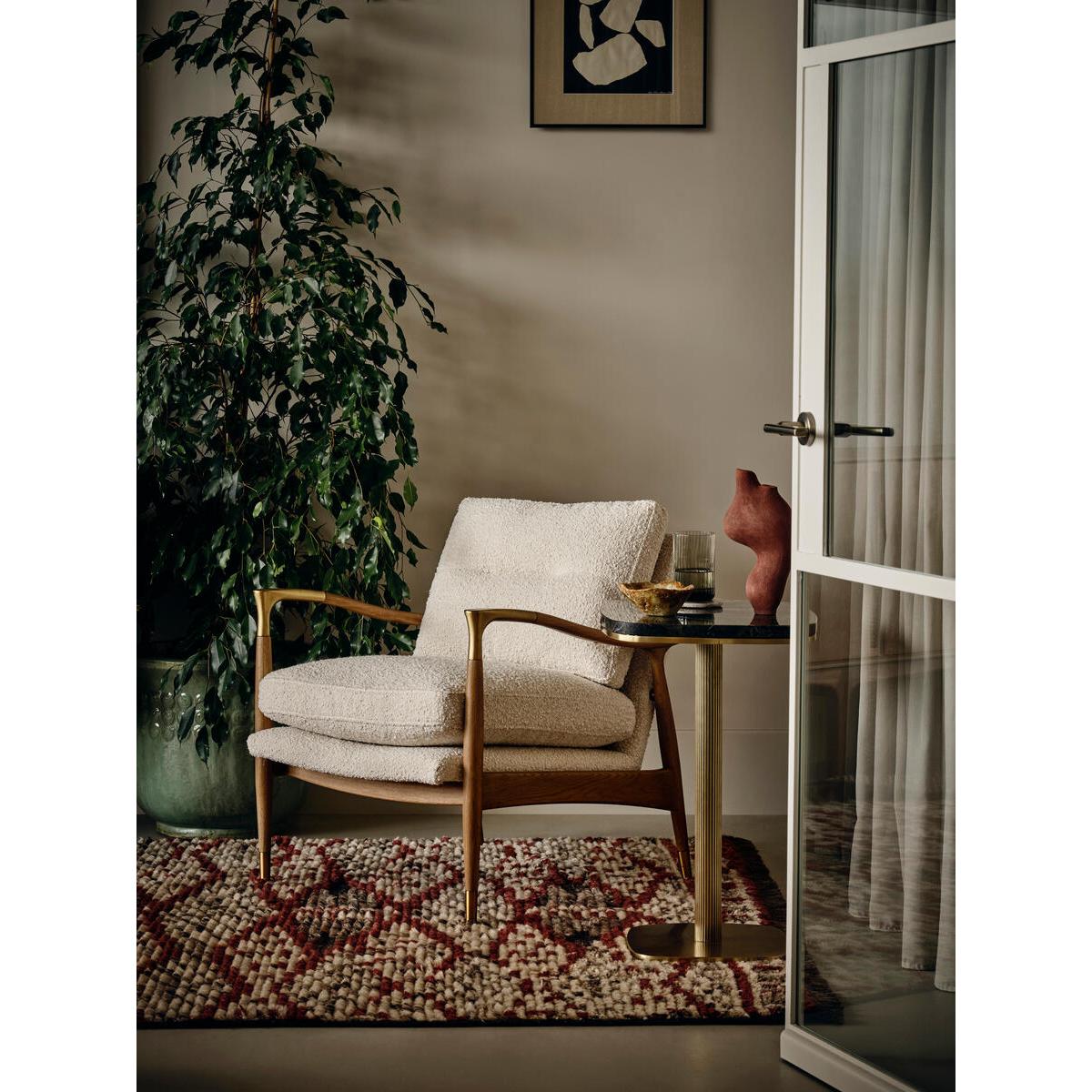 Taking cues from mid-century designs at Soho House Greek Street,our Theodore chair adds a fresh focal point to any living space. Ithas a comfortable, deep-sit shape with down and feather-wrappedfoam cushions upholstered in boucle. The tapered oak wood frame andbrass detailing on the arms complement the clean lines. Handcrafted solid oak frame. Cast brass-detailed arms. Upholstered in boucle. Feather and down-wrapped foam cushions.