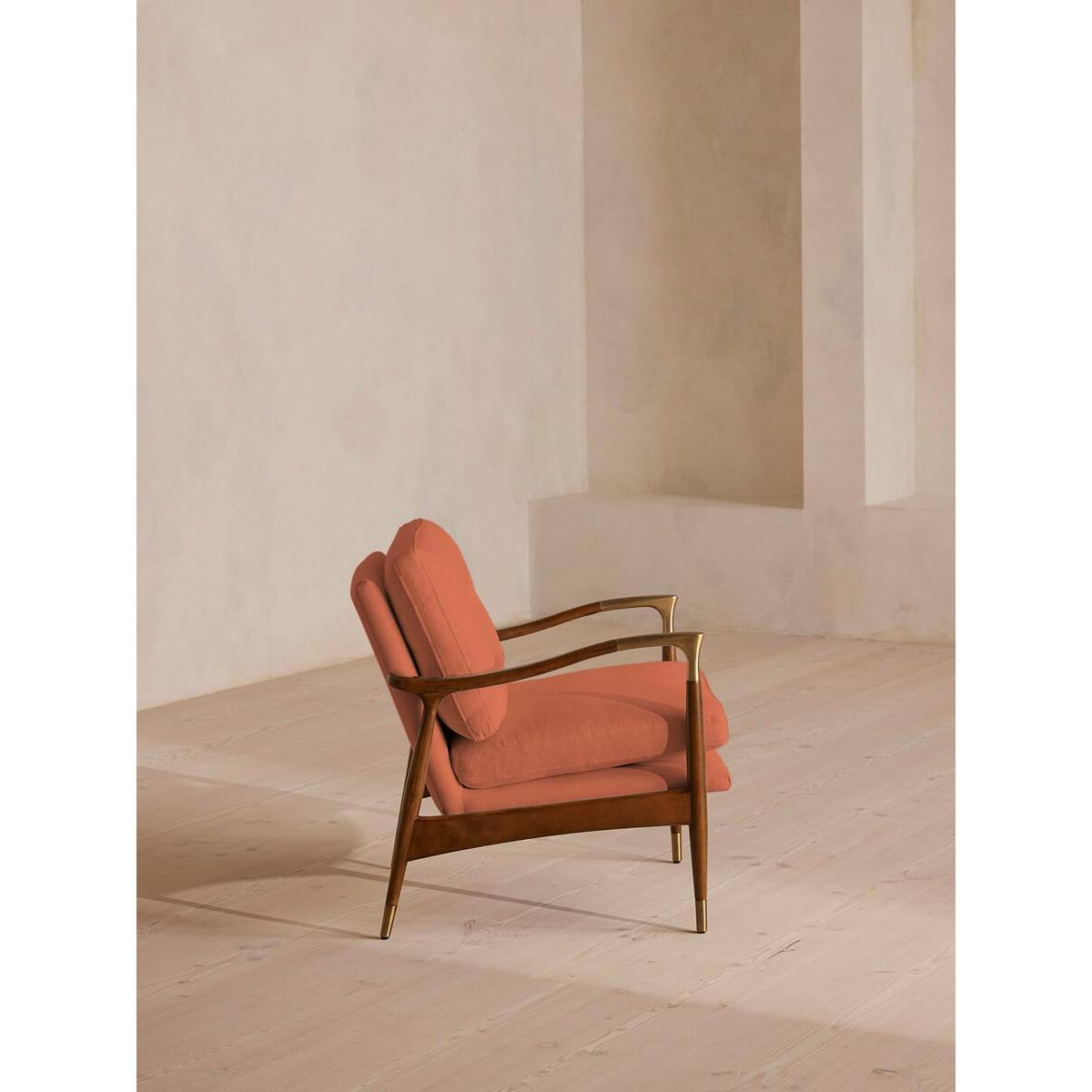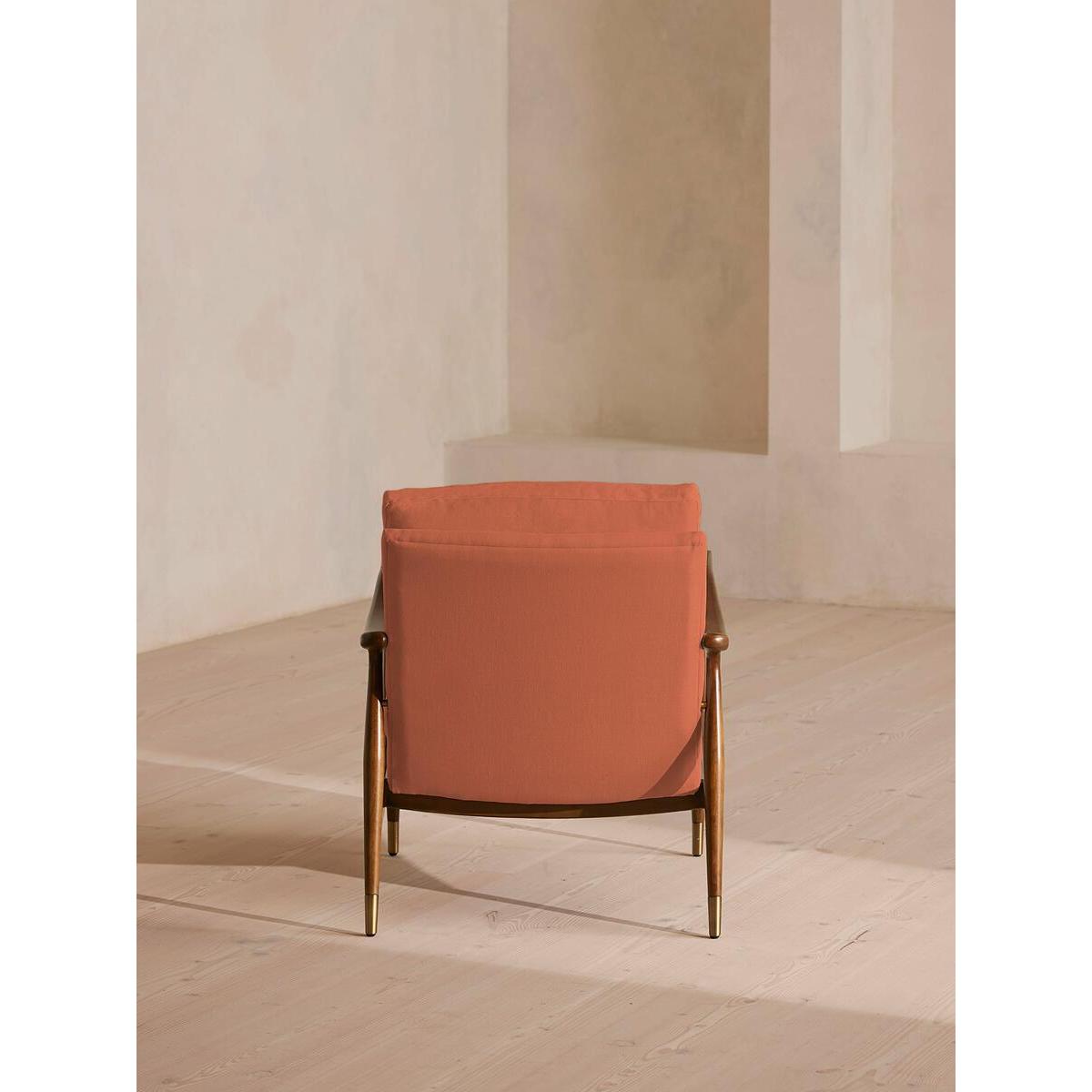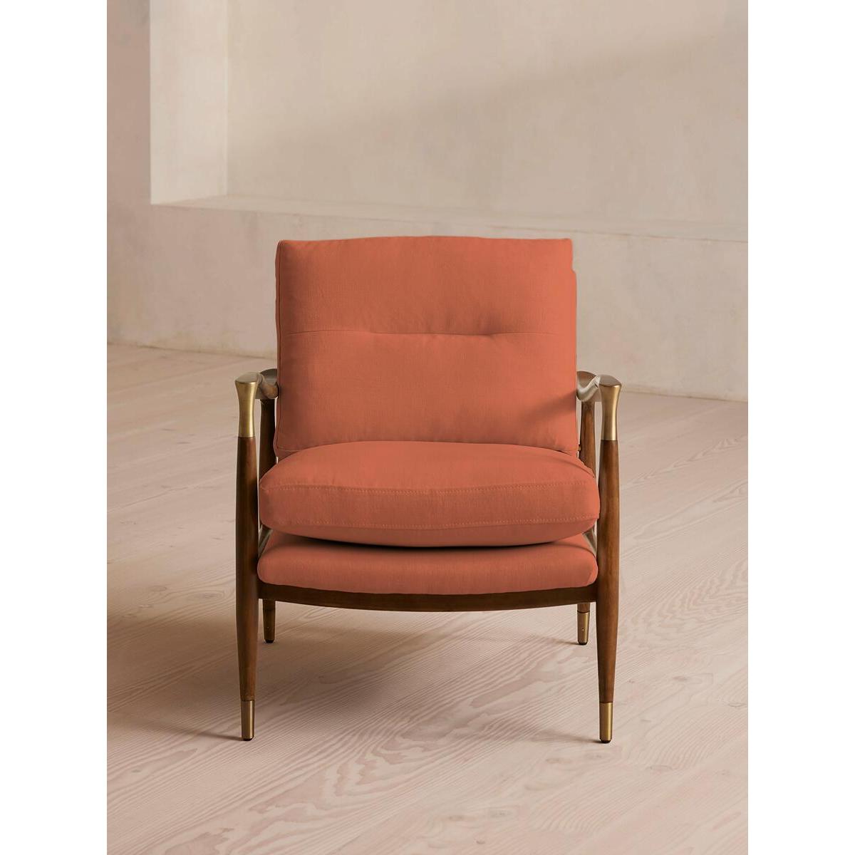 I’m a fan of this chair partly because its clean lines and warm antique-rose linen lift a room without shouting for attention. The slender walnut frame and subtle brass feet give it a mid-century edge, making it a versatile piece that sits comfortably in Scandi-inspired living rooms, pared-back studies or even a softly coloured bedroom corner. For styling, position it beside a slim side table and a standing lamp to create a relaxed reading nook. Layer on a pale linen throw or a geometric cushion in muted teal for contrast. Keep surrounding décor simple - think low-pile rugs, ceramic vases in natural tones and a couple of framed prints hung at eye level - to let the chair remain the focal point.