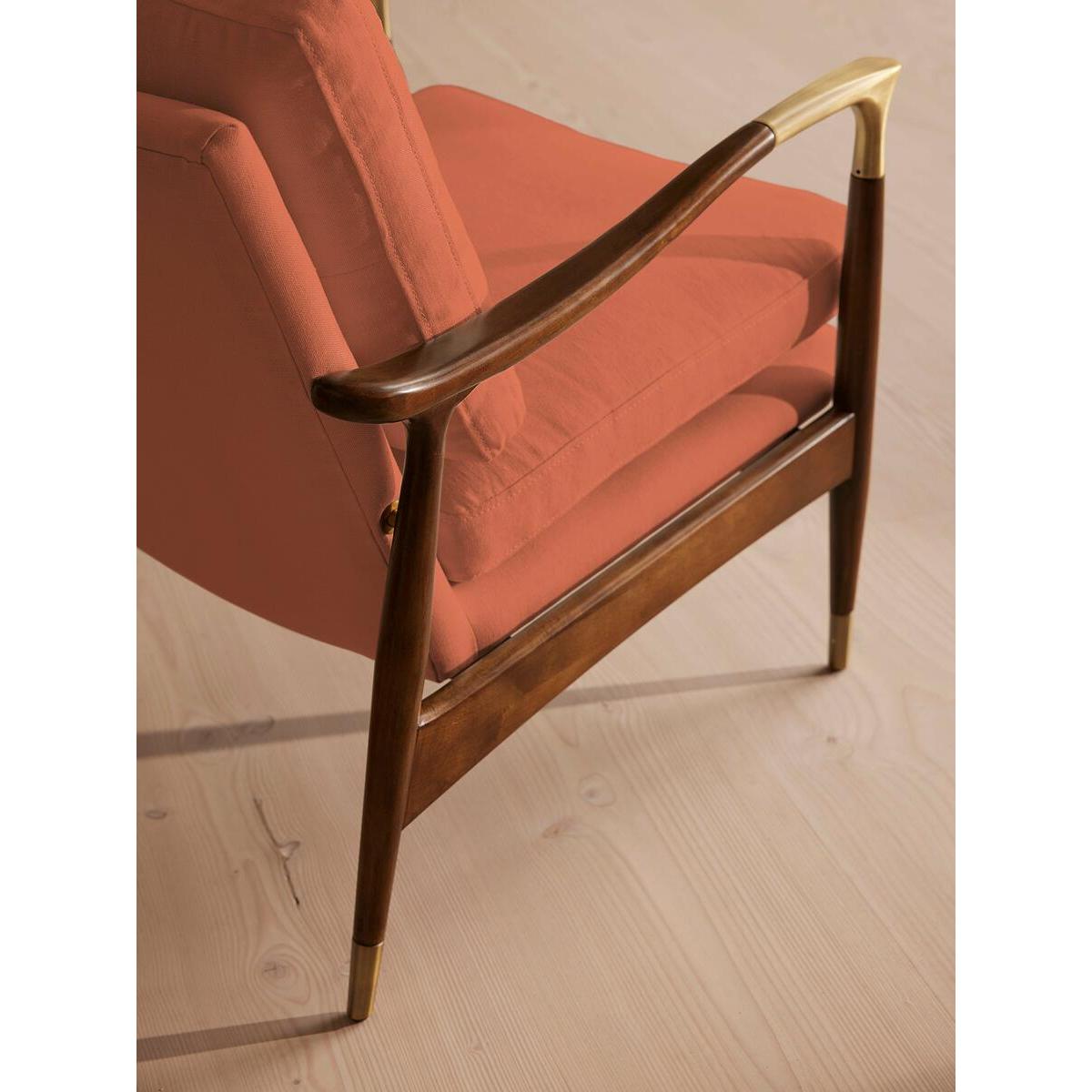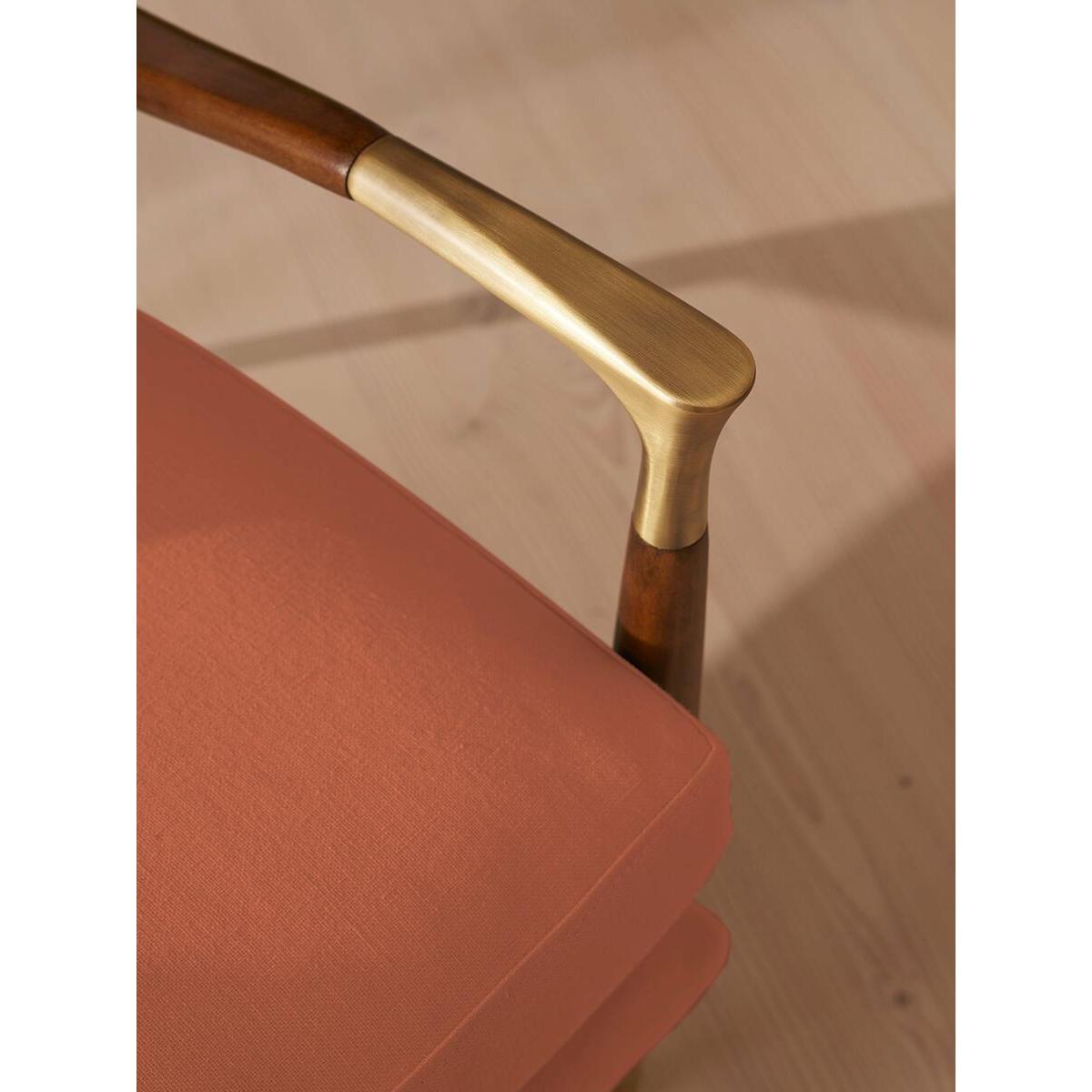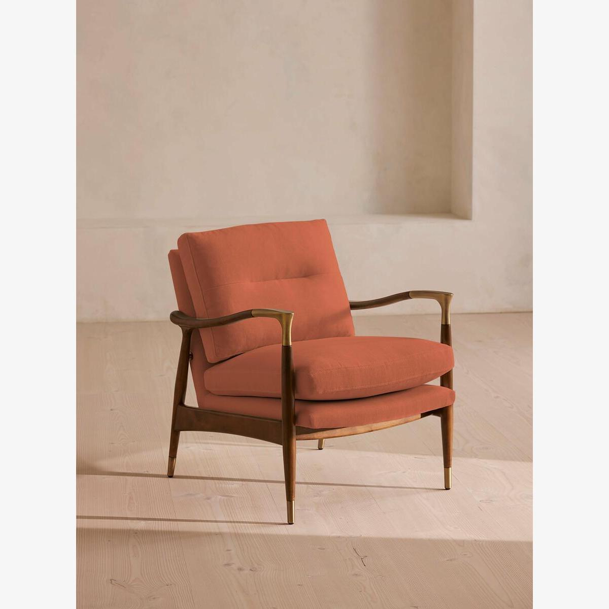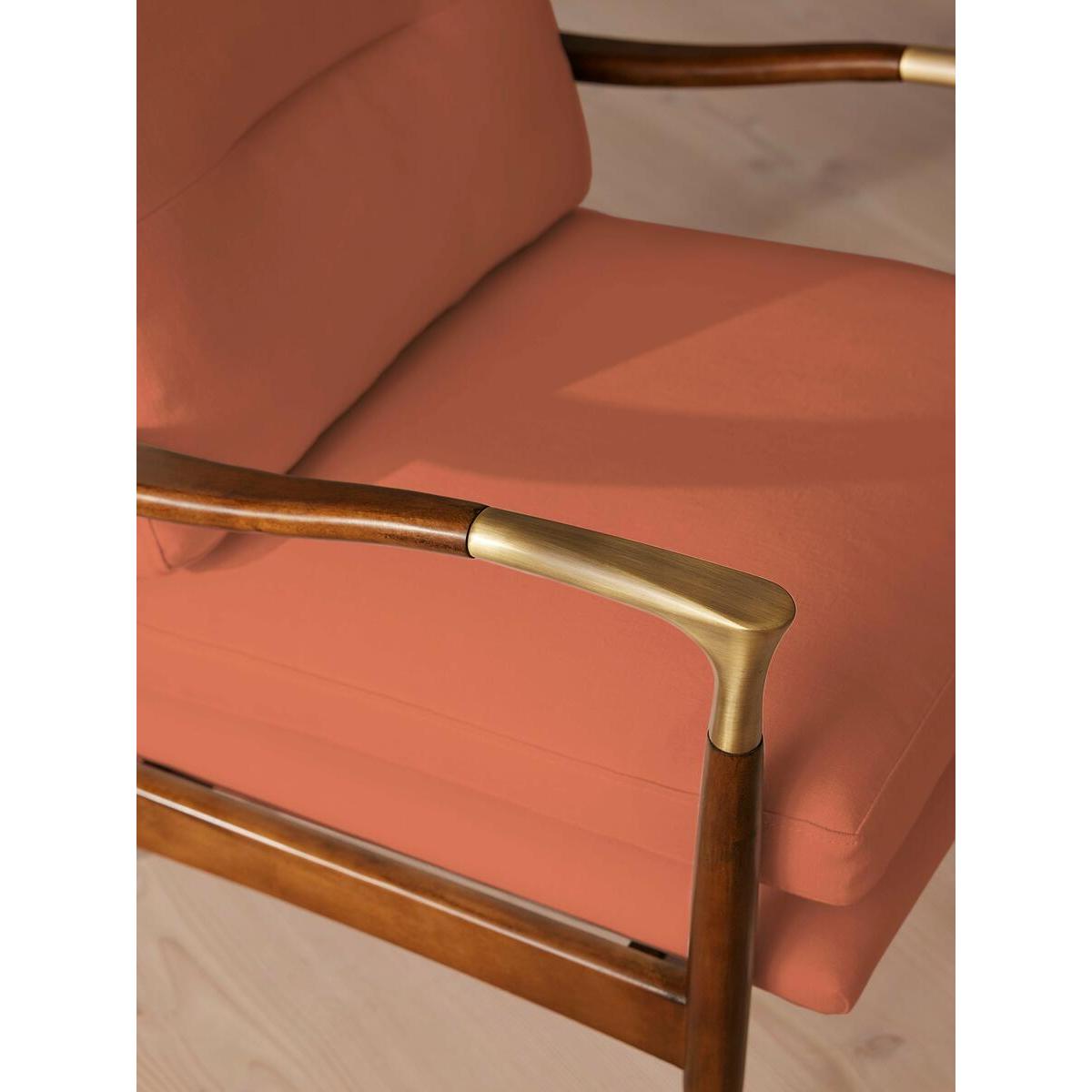 I’m a fan of this chair partly because its clean lines and warm antique-rose linen lift a room without shouting for attention. The slender walnut frame and subtle brass feet give it a mid-century edge, making it a versatile piece that sits comfortably in Scandi-inspired living rooms, pared-back studies or even a softly coloured bedroom corner. For styling, position it beside a slim side table and a standing lamp to create a relaxed reading nook. Layer on a pale linen throw or a geometric cushion in muted teal for contrast. Keep surrounding décor simple - think low-pile rugs, ceramic vases in natural tones and a couple of framed prints hung at eye level - to let the chair remain the focal point.