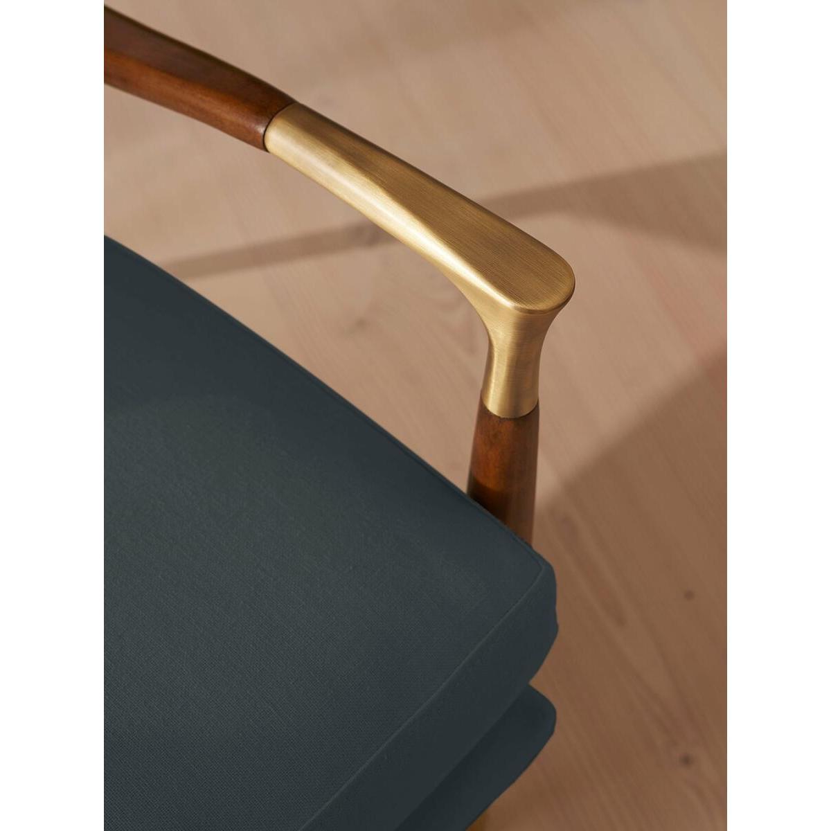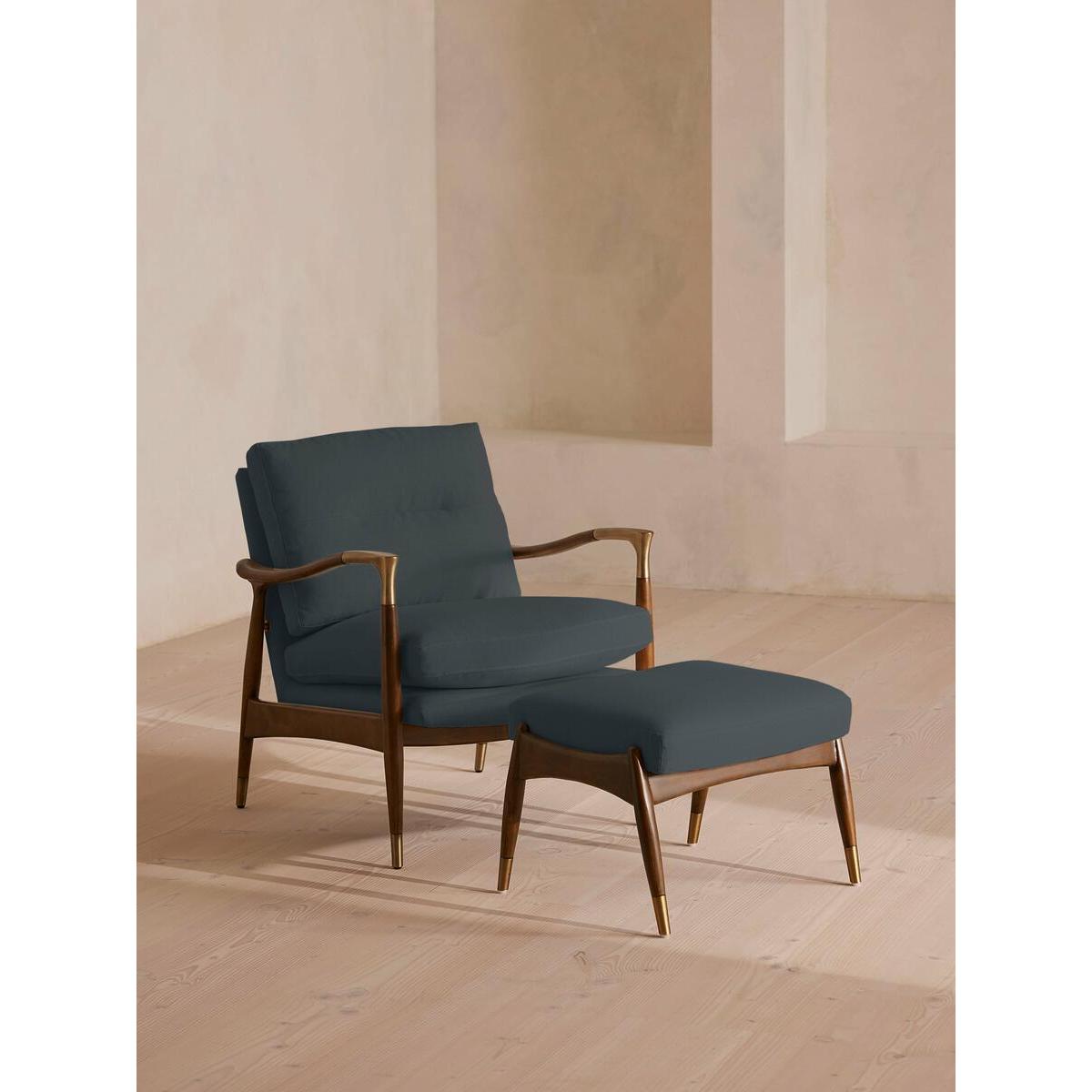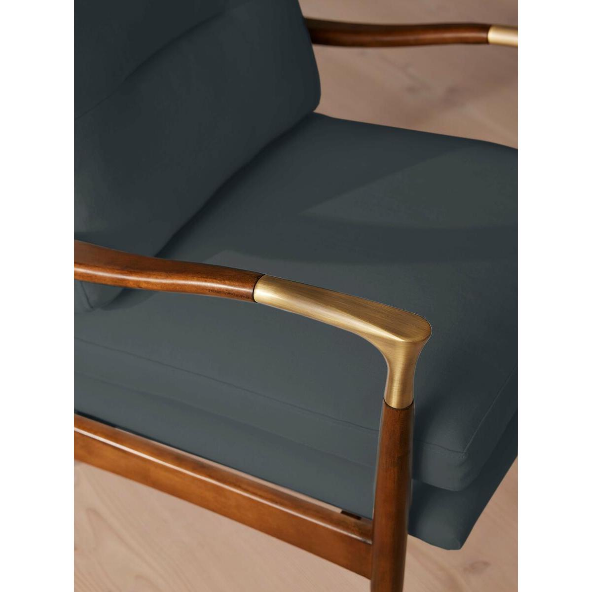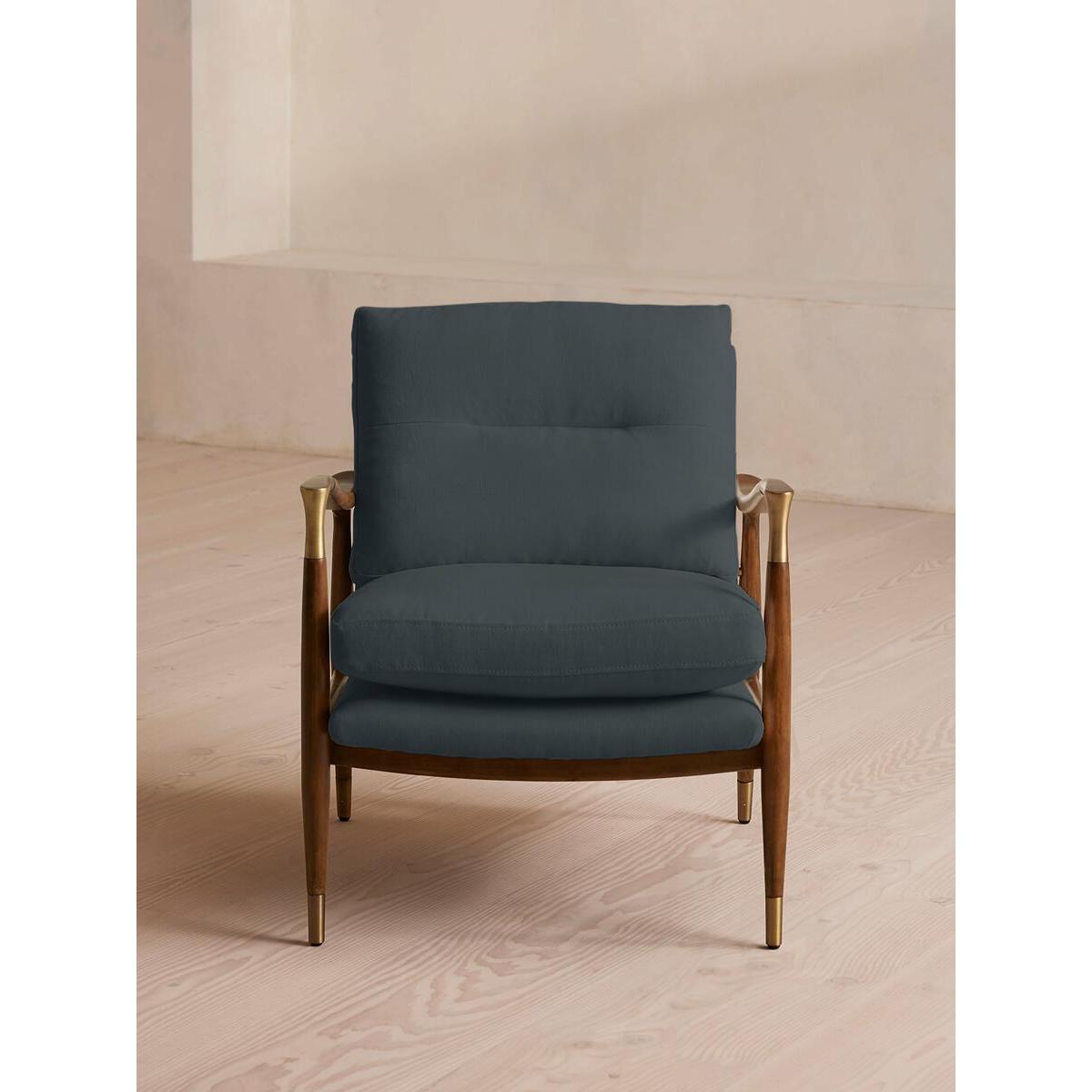 Taking cues from mid-century designs at Soho House 40 Greek Street, our Theodore armchair adds a focal point to any living space. The tapered wood frame is designed with a comfortable, deep-sit shape and brass cap details for a vintage feel. Down and feather-wrapped foam cushions in linen upholstery create further comfort for moments of relaxation. Handcrafted solid oak frame Cast brass-detailed arms Comfortable deep-sit shape Feather and down-wrapped foam cushions Linen upholstery Also available in other fabrics and colours Inspired by Soho House 40 Greek Street