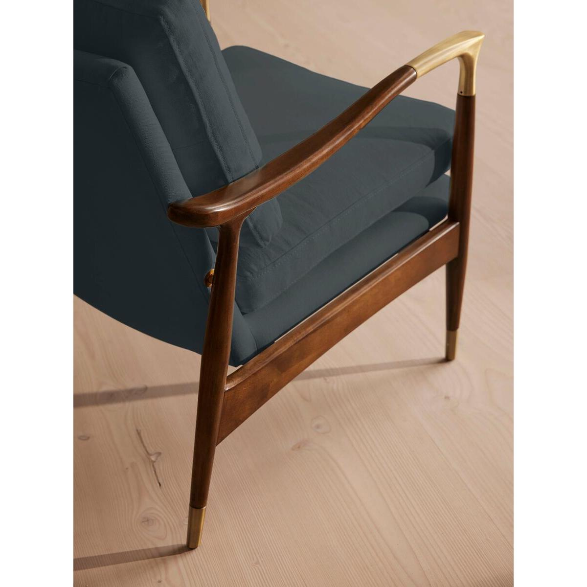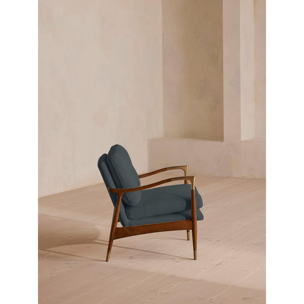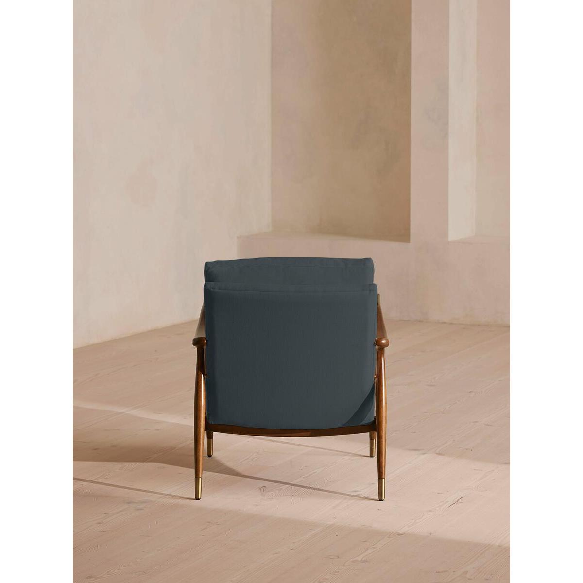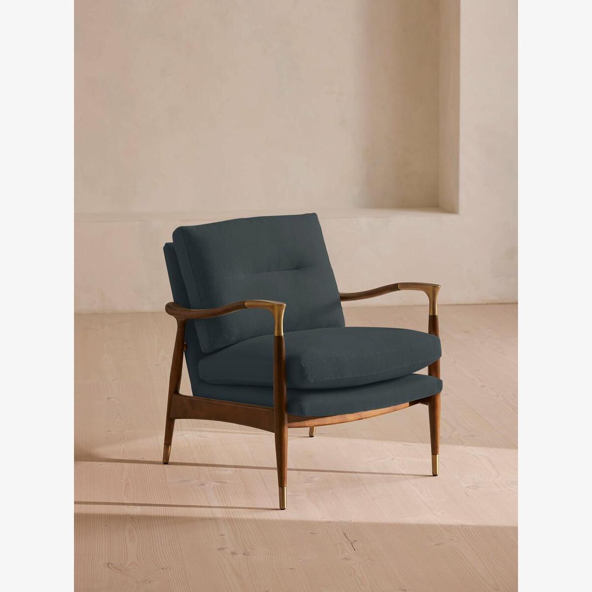 I’m a fan of this Theo armchair in Prussian blue linen because its clean lines and warm wood frame bridge mid-century and contemporary schemes with ease. The rich yet muted blue works beautifully against neutral walls or alongside jewel-toned accents, and the slim arms keep it feeling light rather than bulky. For styling, tuck it into a cosy reading corner with a low wooden side table and a brass or matte floor lamp. A simple textured throw or small lumbar cushion in cream or ochre will add comfort without cluttering the silhouette. It also pairs well with natural materials - think oak flooring or a sisal rug - to balance the linen’s softness.