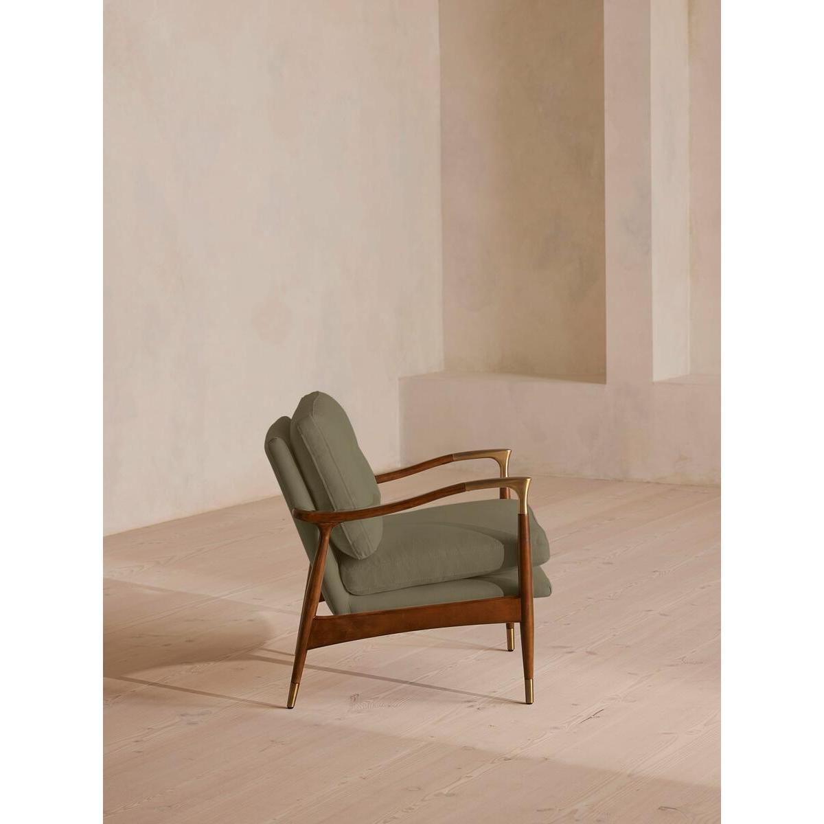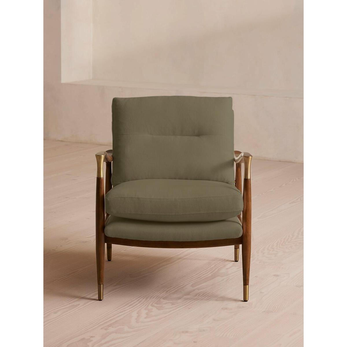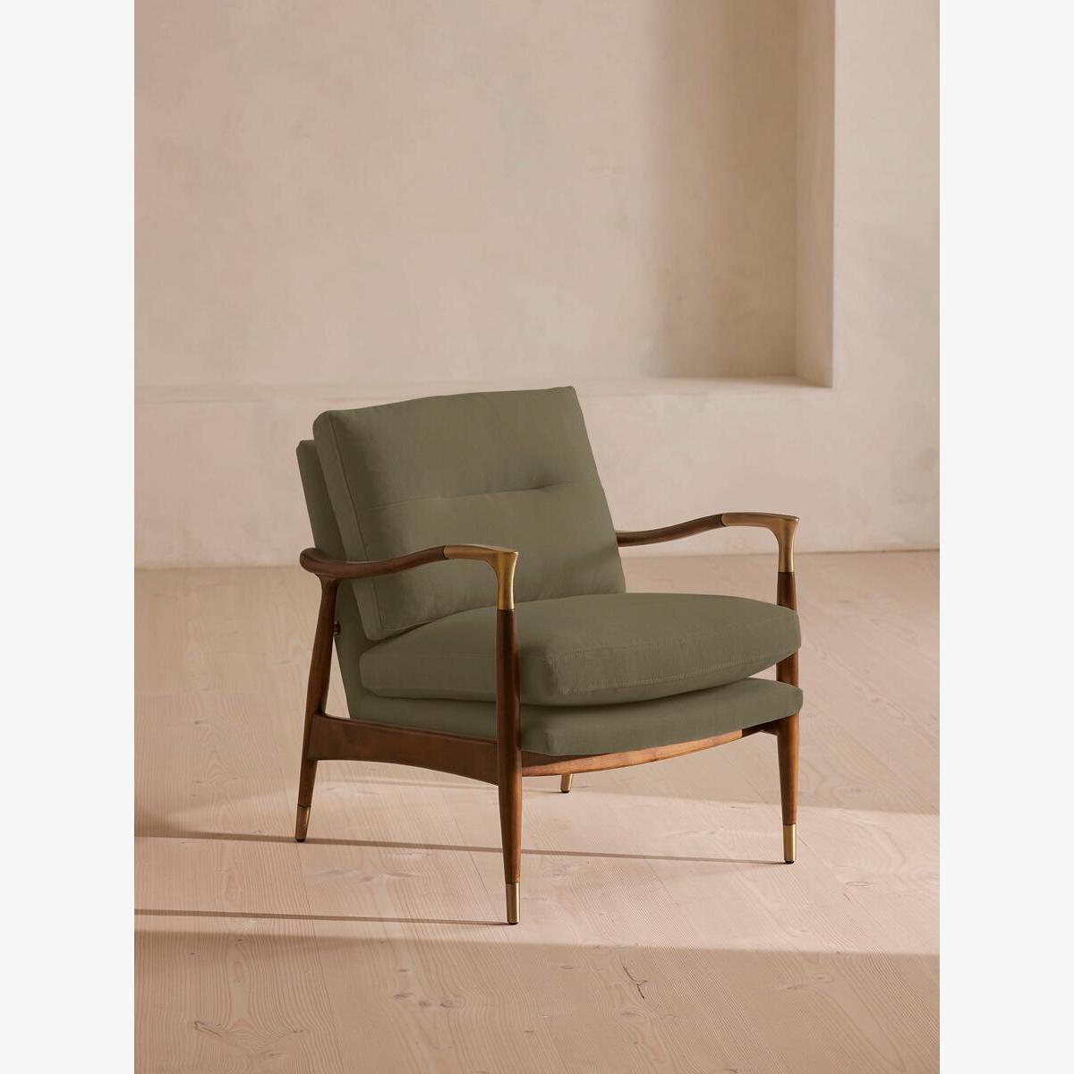 Taking cues from mid-century designs at Soho House 40 Greek Street, our Theodore armchair adds a focal point to any living space. The tapered wood frame is designed with a comfortable, deep-sit shape and brass cap details for a vintage feel. Down and feather-wrapped foam cushions in linen upholstery create further comfort for moments of relaxation. Handcrafted solid oak frame Cast brass-detailed arms Comfortable deep-sit shape Feather and down-wrapped foam cushions Linen upholstery Also available in other fabrics and colors Inspired by Soho House 40 Greek Street