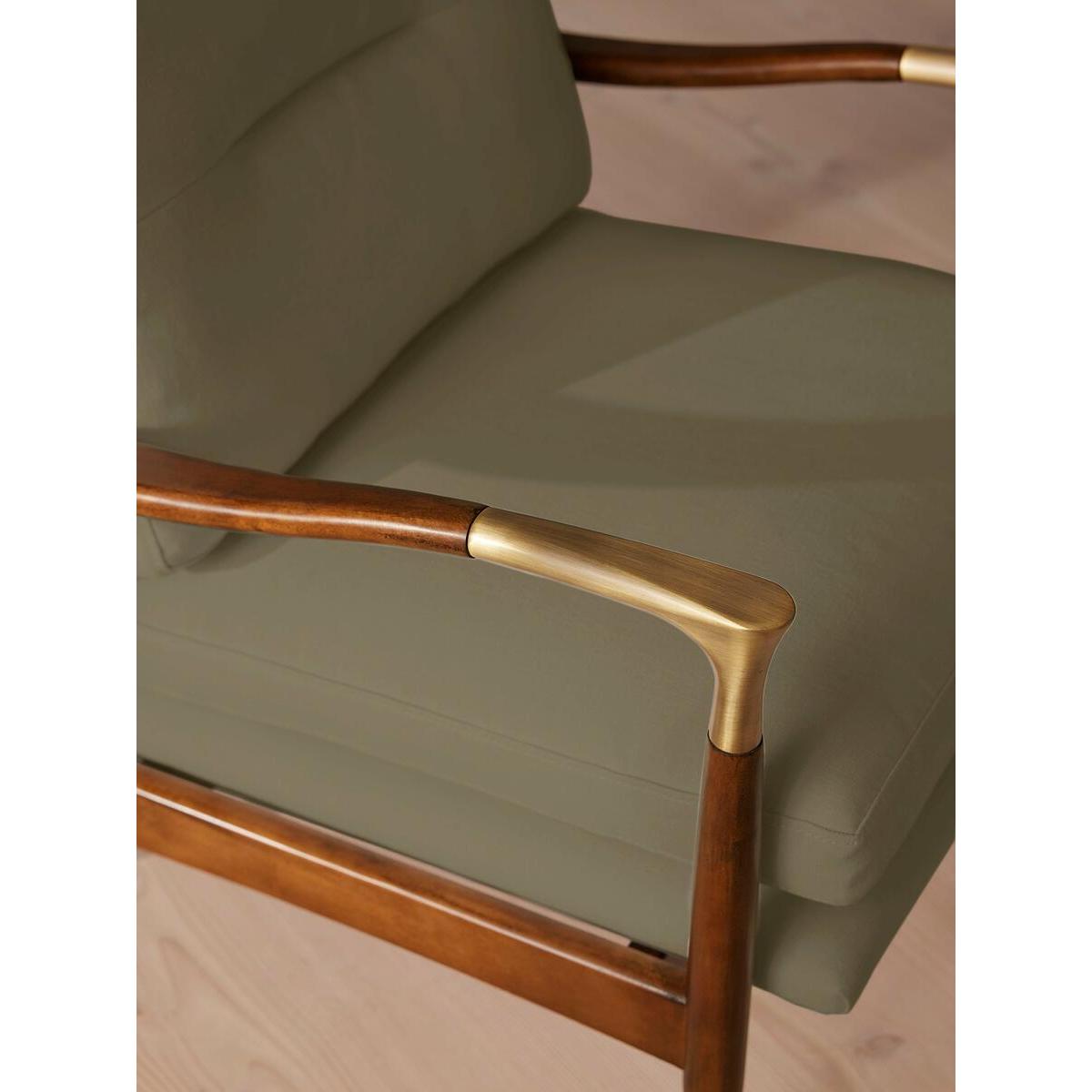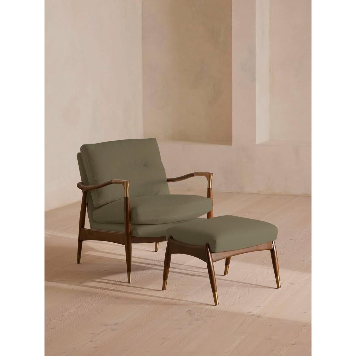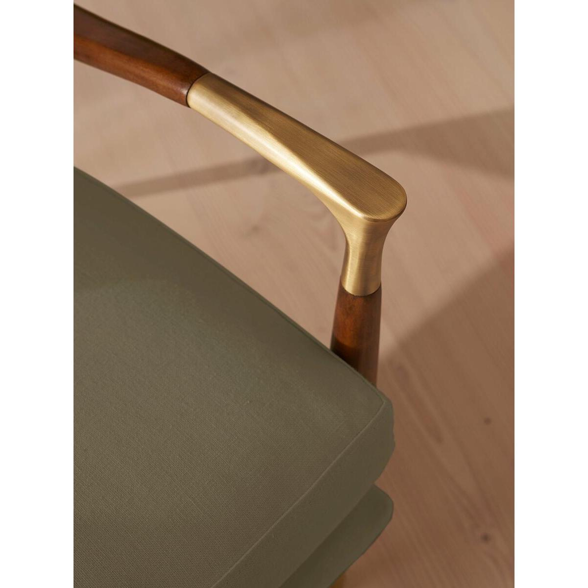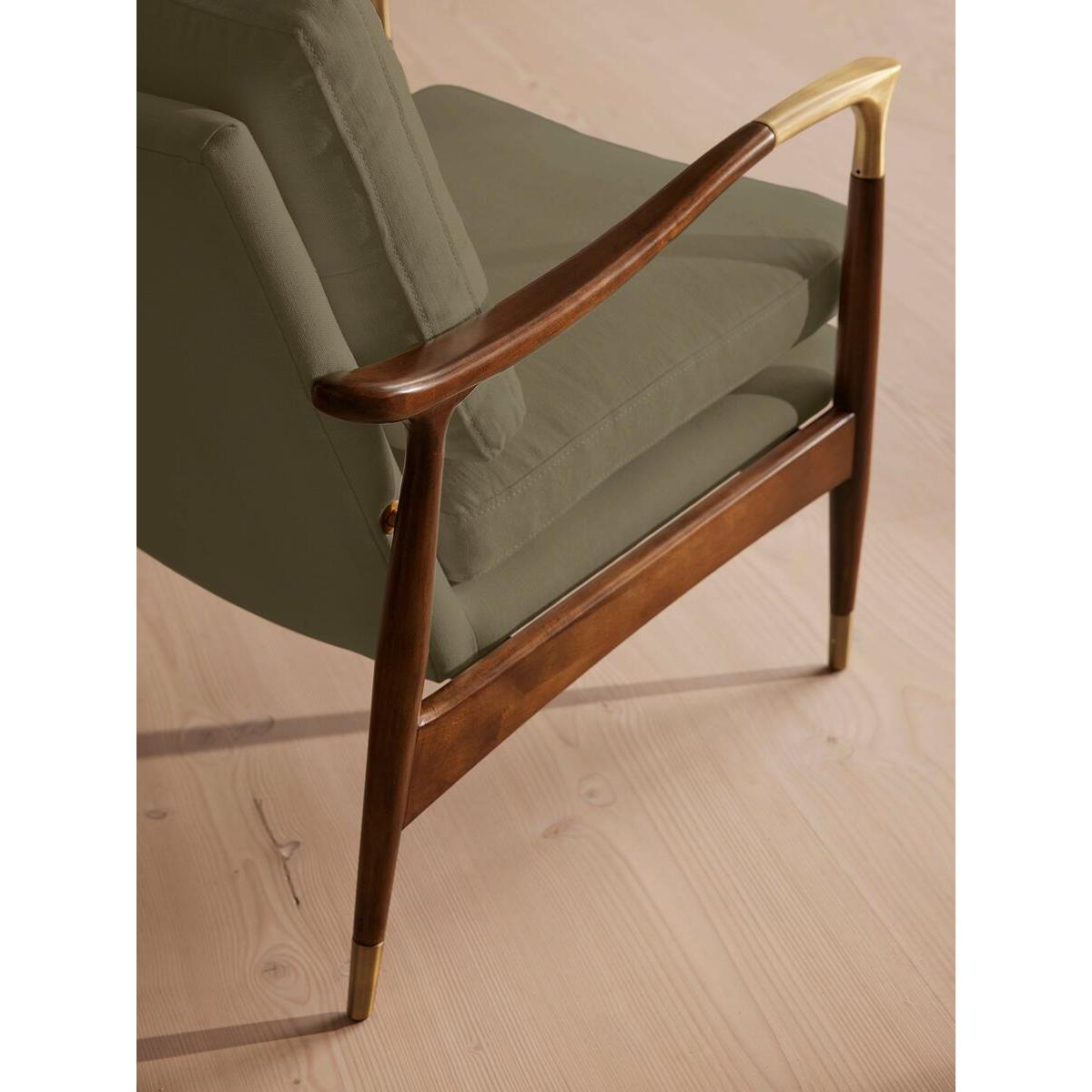Taking cues from mid-century designs at Soho House 40 Greek Street, our Theodore armchair adds a focal point to any living space. The tapered wood frame is designed with a comfortable, deep-sit shape and brass cap details for a vintage feel. Down and feather-wrapped foam cushions in linen upholstery create further comfort for moments of relaxation. Handcrafted solid oak frame Cast brass-detailed arms Comfortable deep-sit shape Feather and down-wrapped foam cushions Linen upholstery Also available in other fabrics and colors Inspired by Soho House 40 Greek Street
