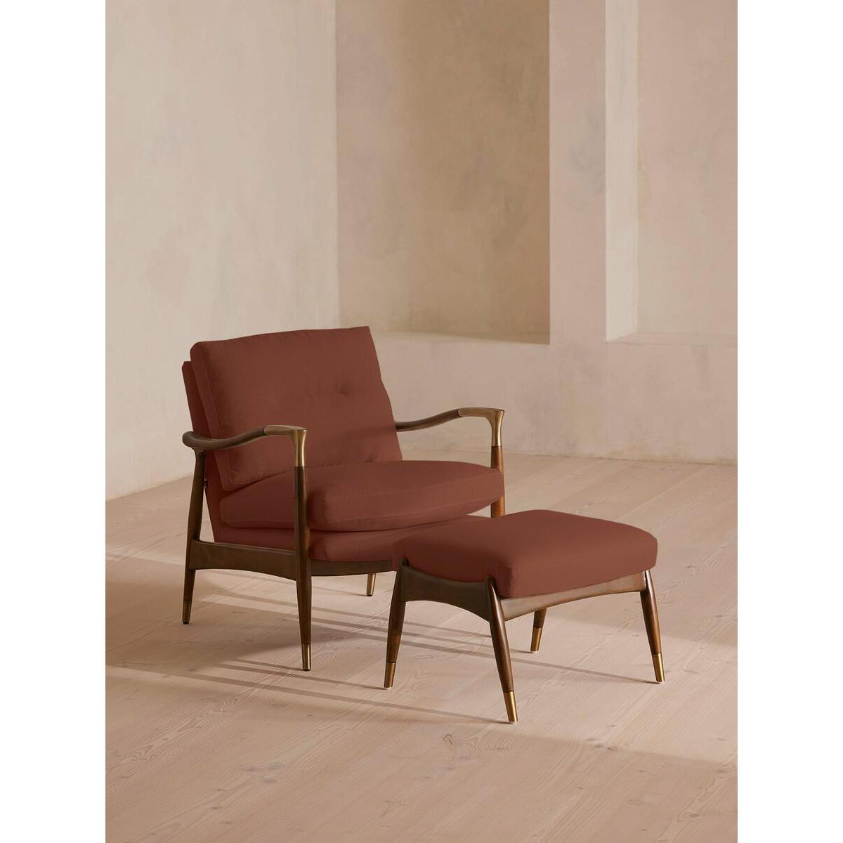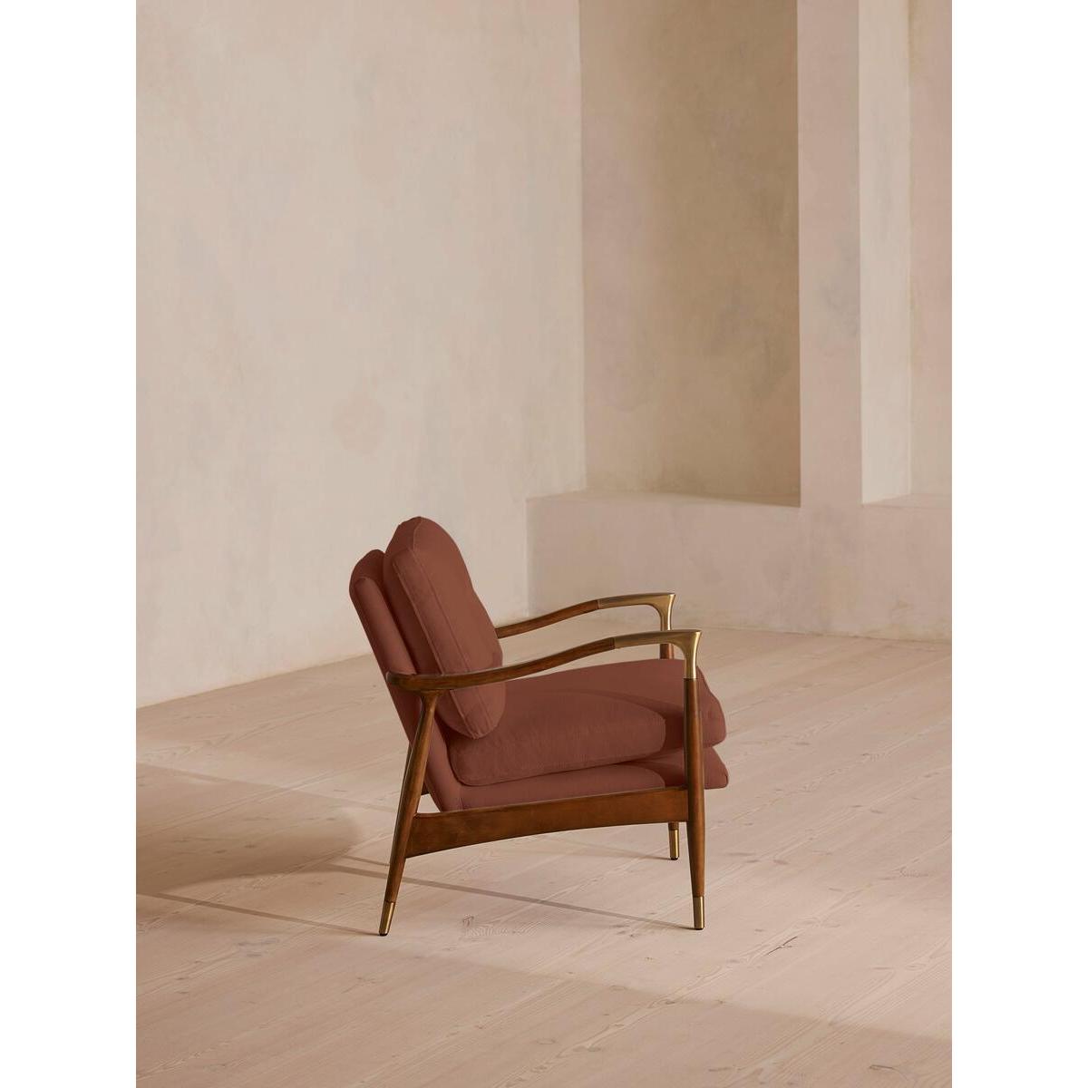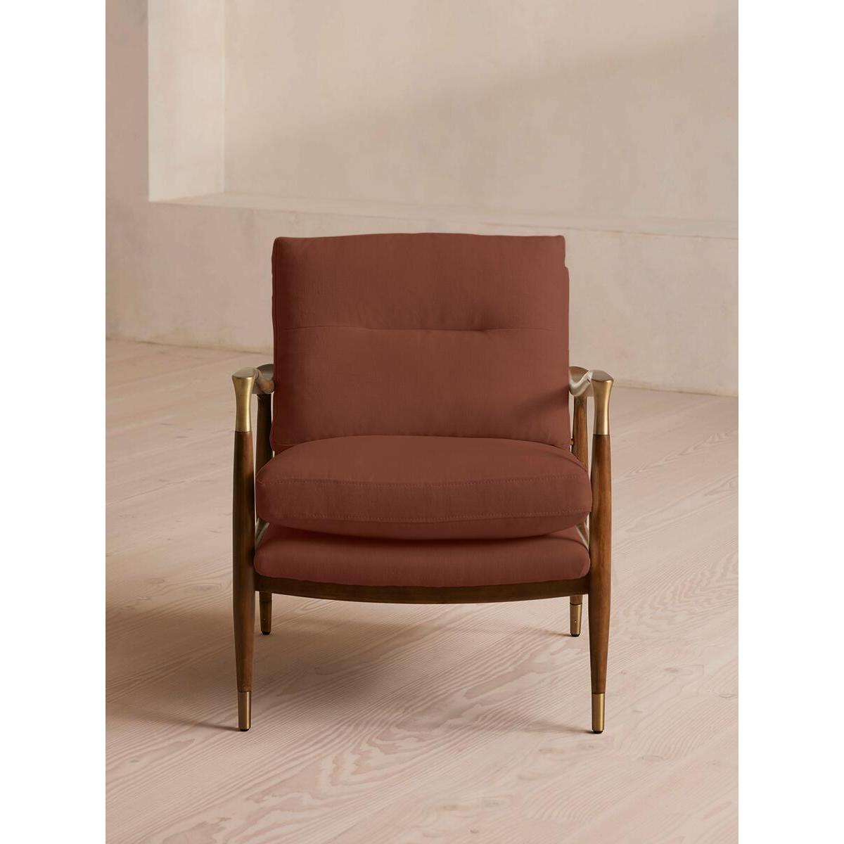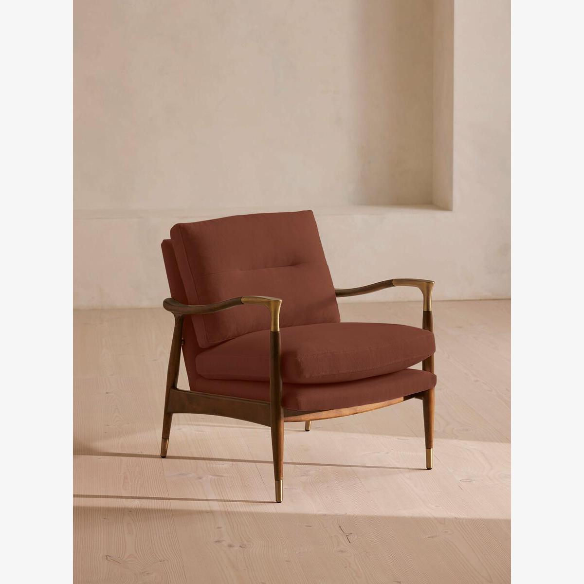 I love how this sienna-linen armchair balances a warm, earthy hue with a sleek timber frame and subtle brass detailing - it instantly lifts a living room without overwhelming the scheme. It suits mid-century, Scandi or transitional interiors, but also works as a statement in a pared-back minimalist space. For styling, place it beside a slim side table topped with a sculptural lamp or stack of design books, then anchor the setting with a neutral rug and a textured throw draped casually over one arm. A simple floor plant nearby will complete the look without competing for attention.