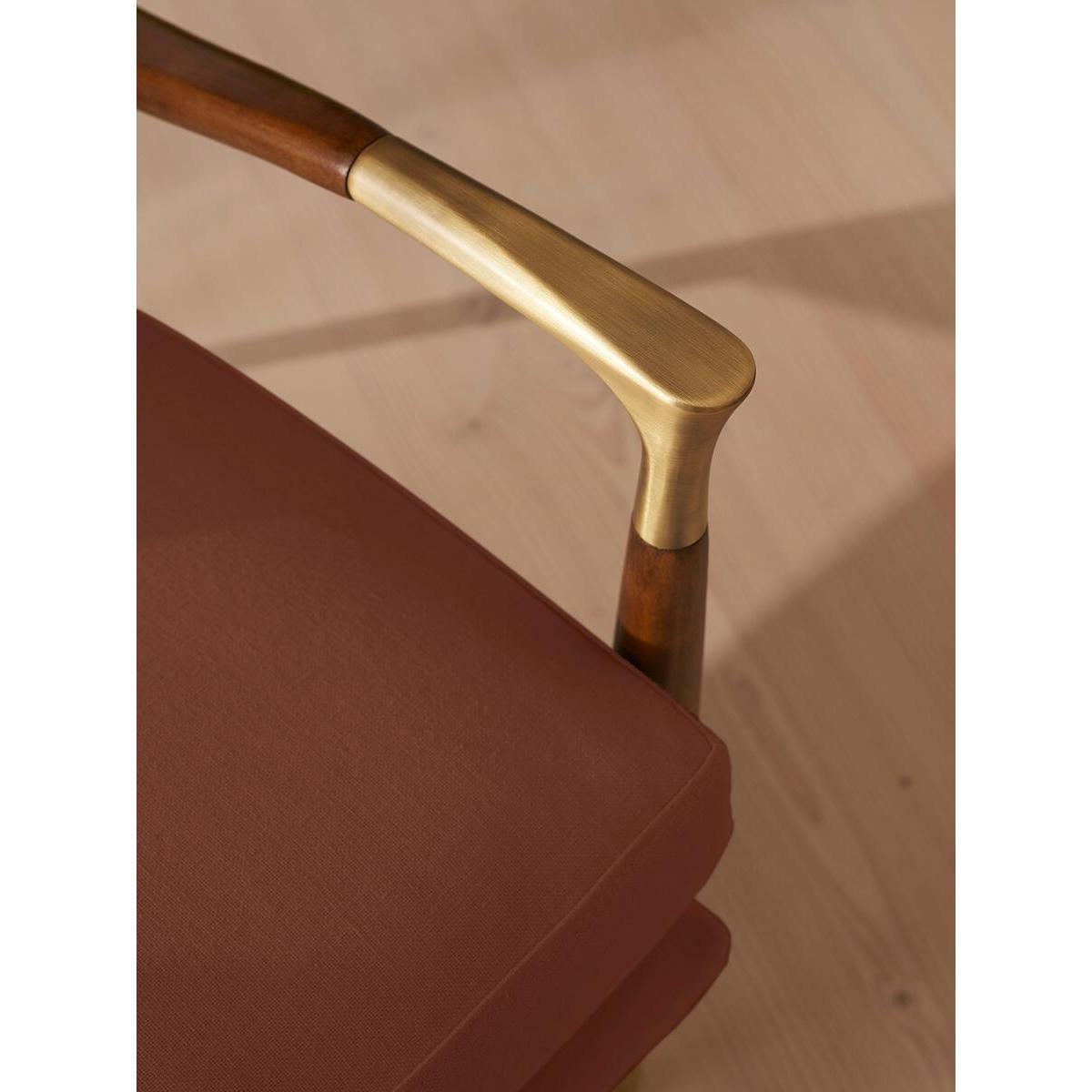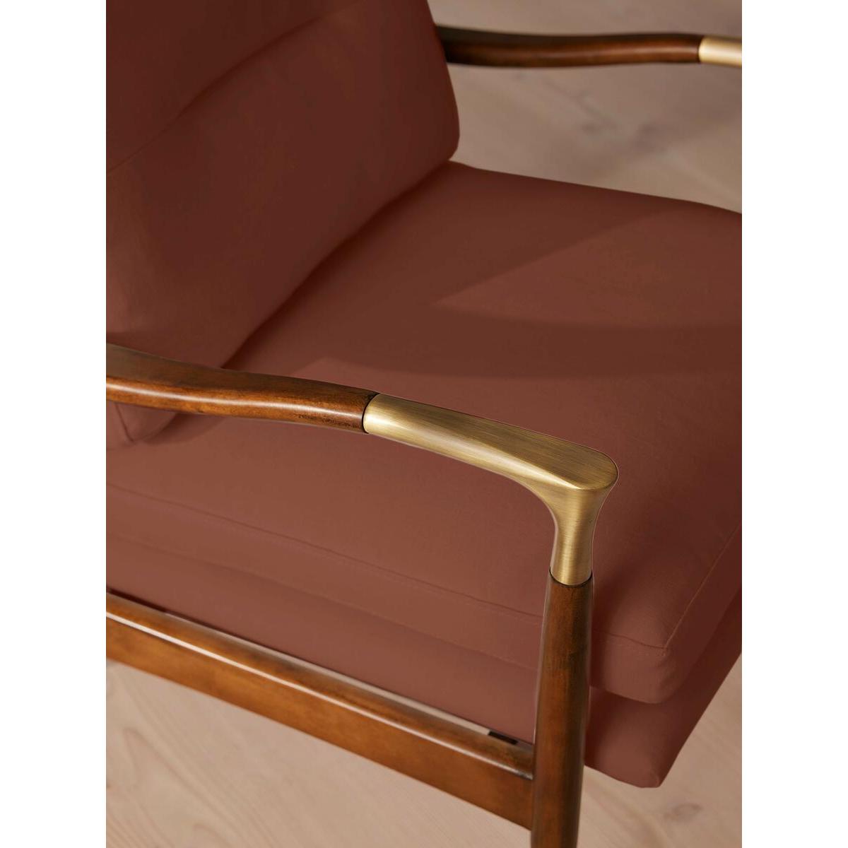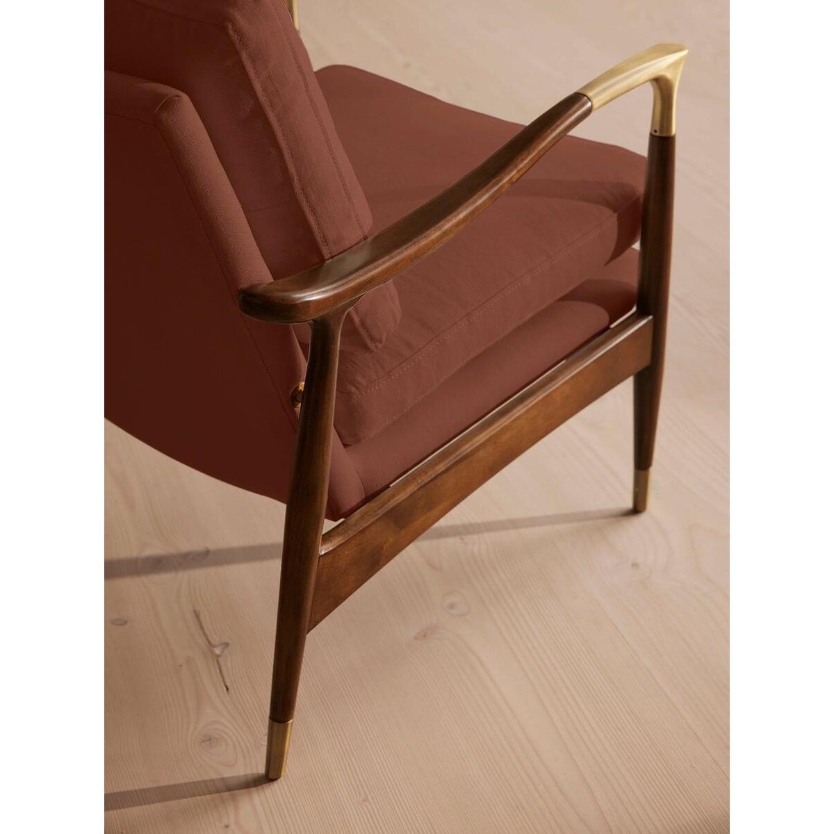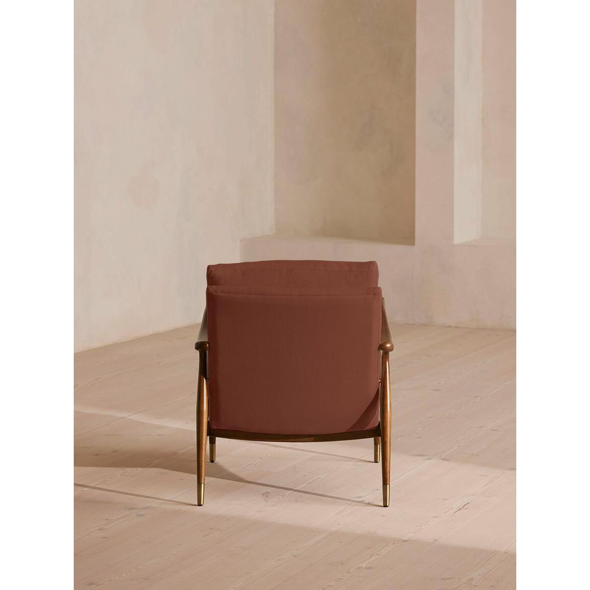 I love how this sienna-linen armchair balances a warm, earthy hue with a sleek timber frame and subtle brass detailing - it instantly lifts a living room without overwhelming the scheme. It suits mid-century, Scandi or transitional interiors, but also works as a statement in a pared-back minimalist space. For styling, place it beside a slim side table topped with a sculptural lamp or stack of design books, then anchor the setting with a neutral rug and a textured throw draped casually over one arm. A simple floor plant nearby will complete the look without competing for attention.