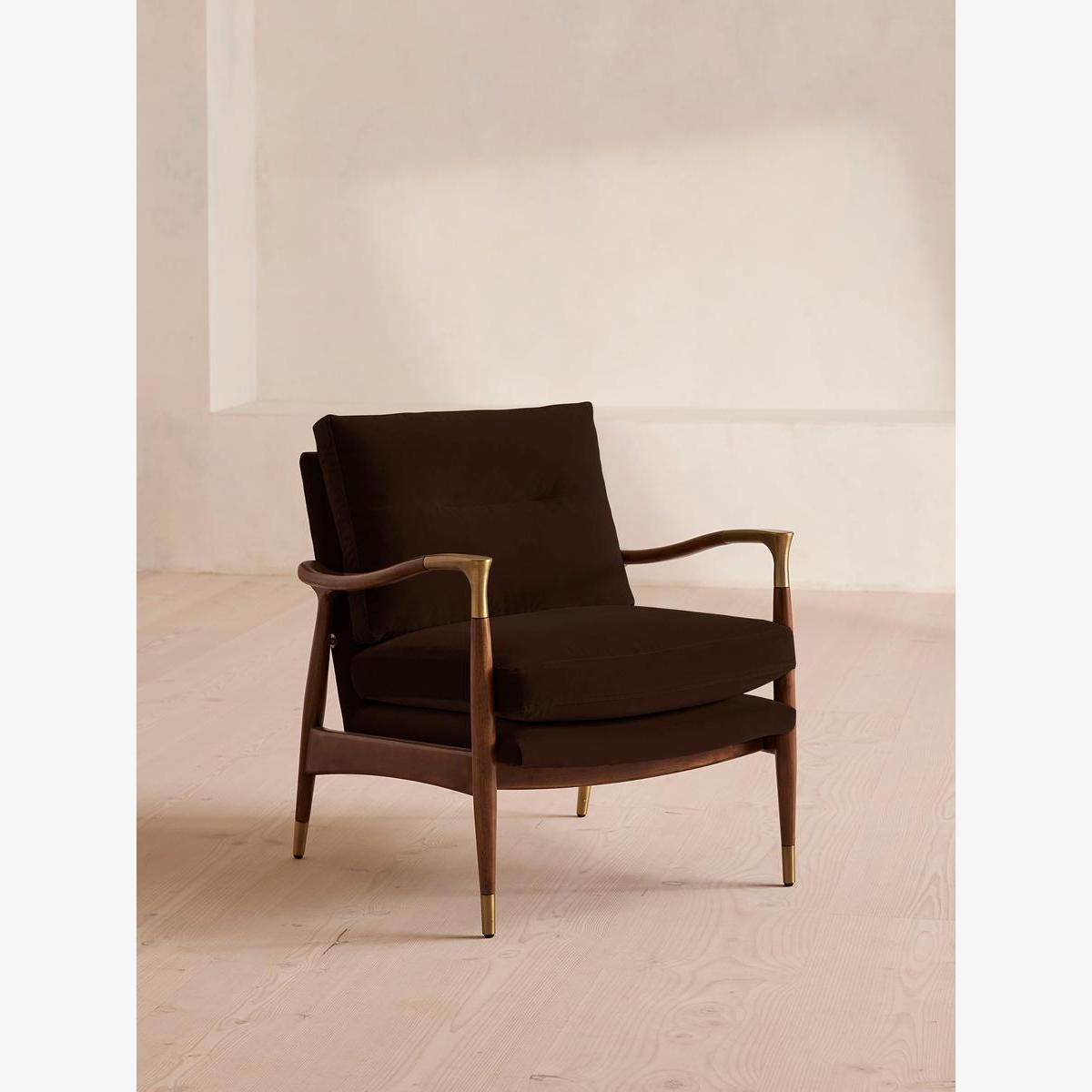 I’m a fan of this chocolate-brown velvet armchair for its clean lines and rich tone - the brass-tipped legs and walnut frame add a subtle mid-century nod without feeling fussy. Its low, open profile makes it ideal for both snug reading corners and more spacious, airy living rooms. Pair it with a textured wool rug and a simple side table in oak or marble. A neutral linen or muted terracotta cushion will lift the seat without competing with the velvet, while a light sheepskin throw softens the look and invites you to settle in.