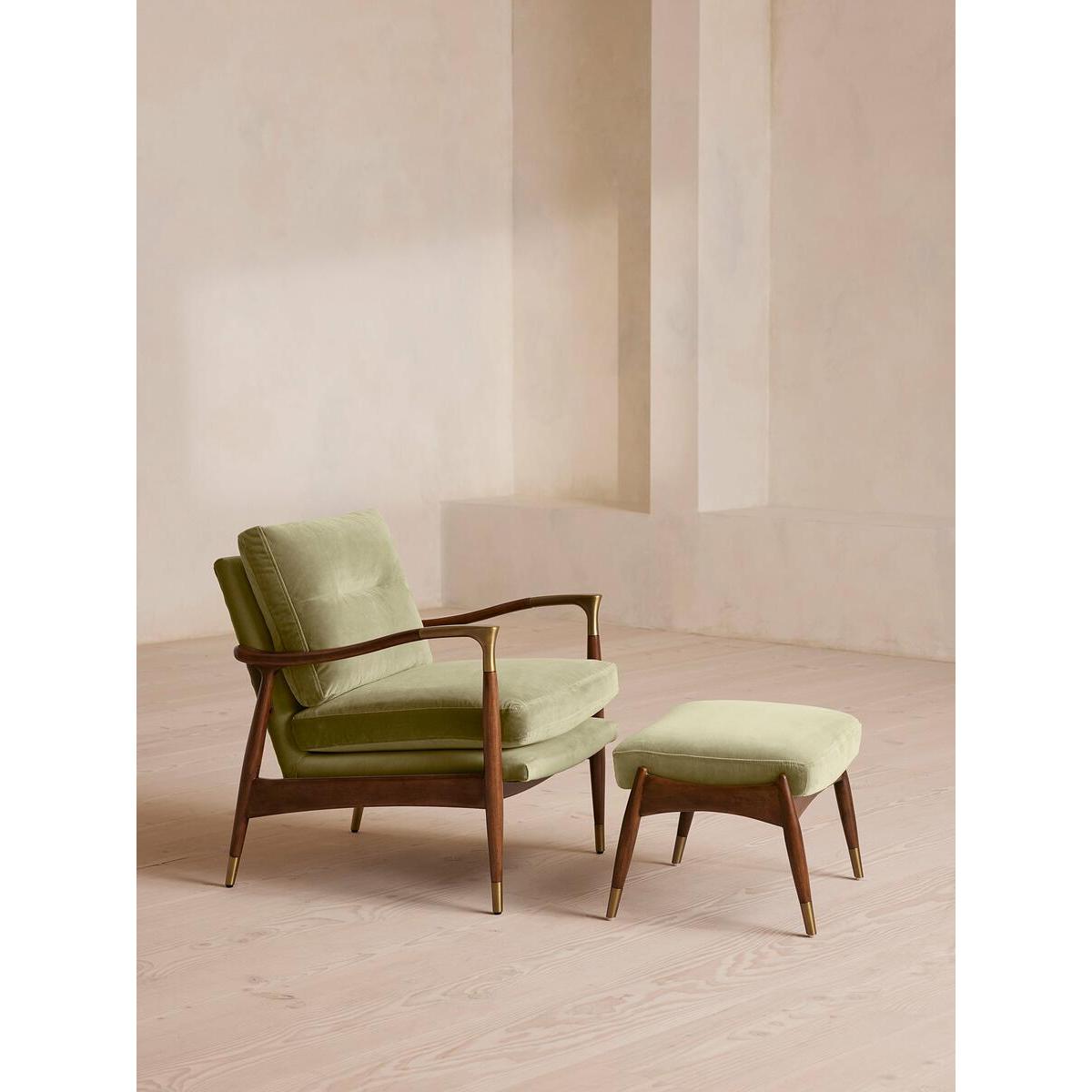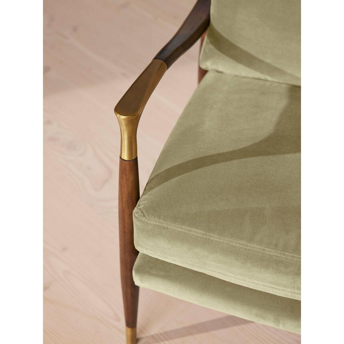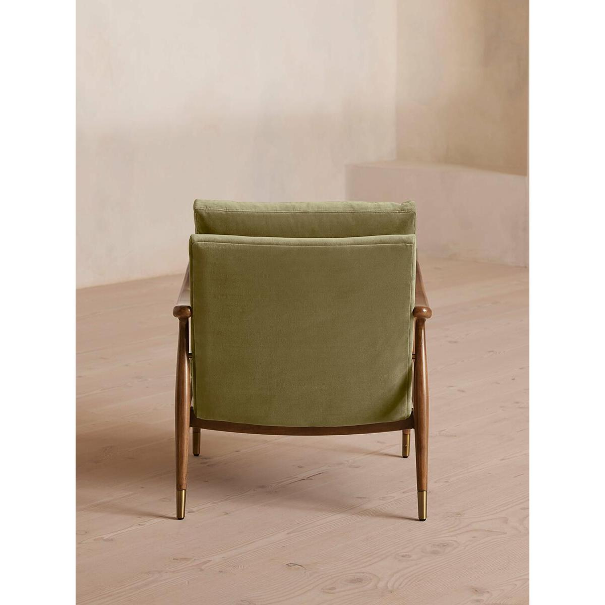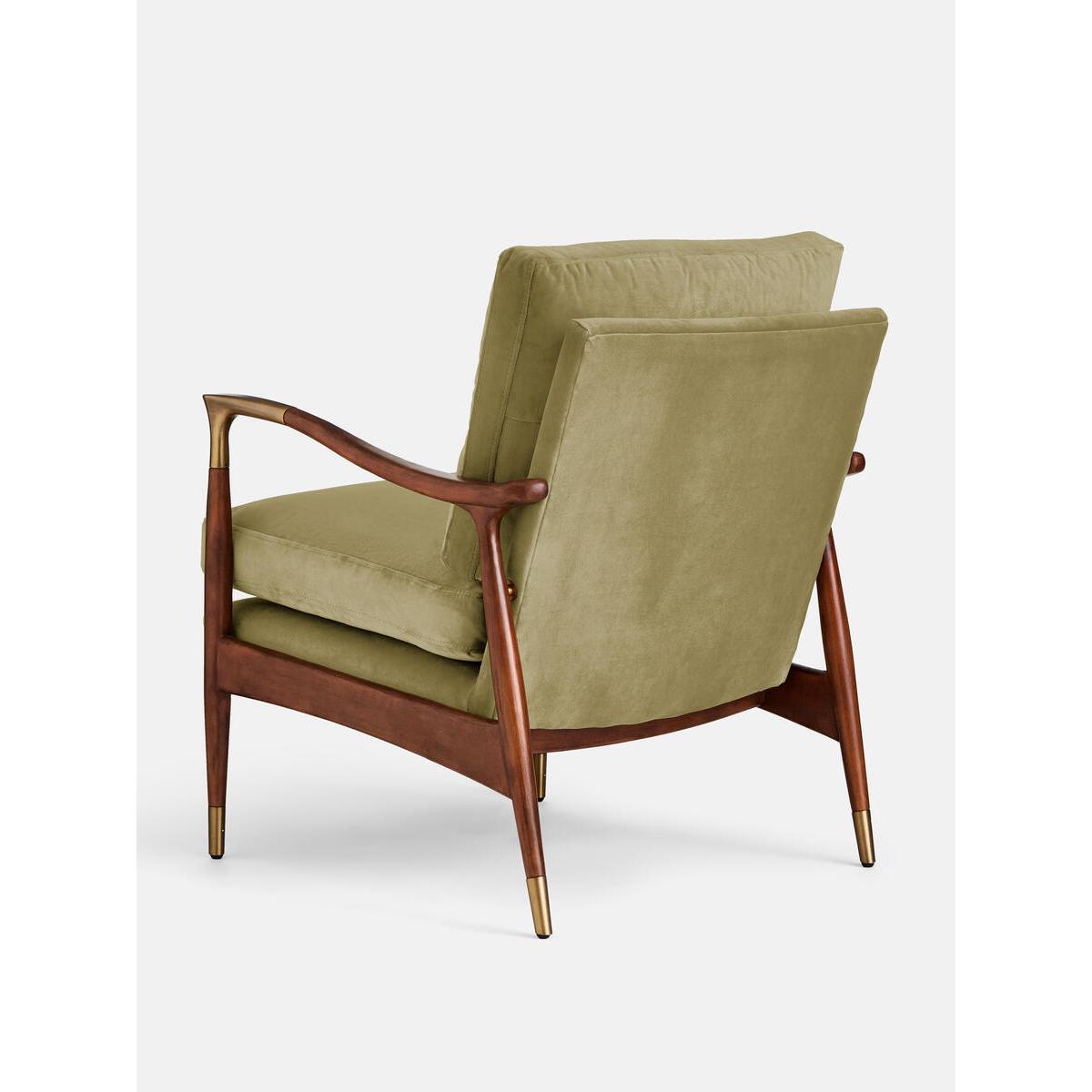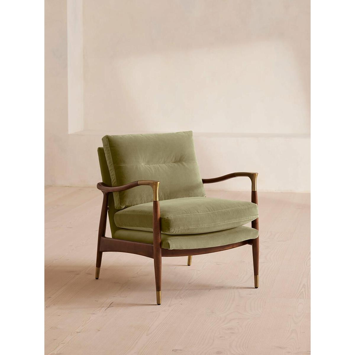 Taking cues from vintage designs at Soho House 40 Greek Street, our Theodore armchair will add a fresh focal point to your living space. A comfortable, deep-sit shape with down and feather-wrapped foam cushions is upholstered in lichen velvet, while the tapered birch wood frame and brass detail on the arms complement its clean lines. Tapered birch wood frame armchair Brass-detailed arms Upholstered in lichen cotton velvet Feather and down-wrapped foam cushions Also available in other fabrics and colourways Inspired by Soho House 40 Greek Street