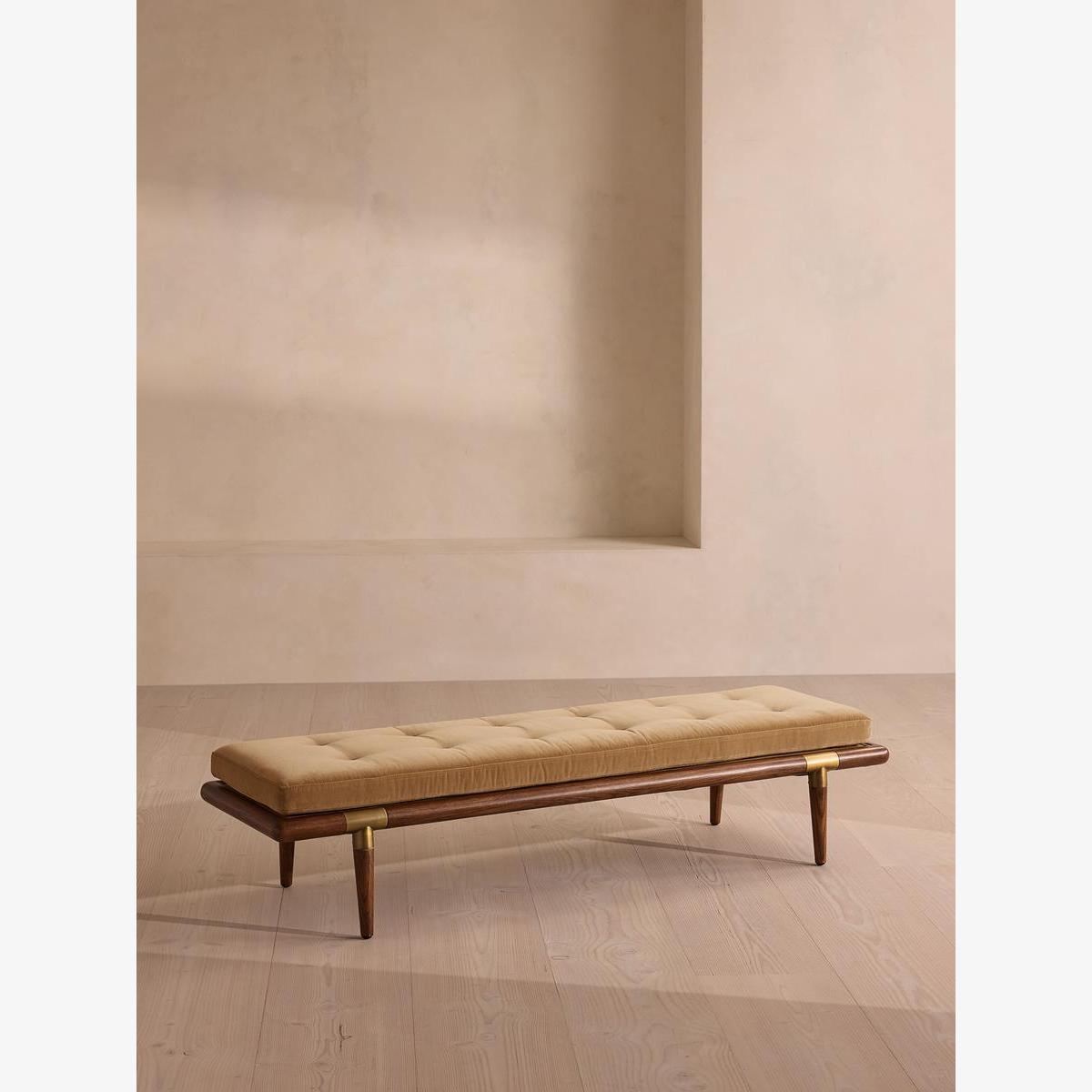 A blind-tufted, feather-wrapped seat cushion is upholstered in velvet to create a wide silhouette made for relaxing. Taking cues from Soho House 40 Greek Street with the brass detailing at the bottom of its birch and oakwood legs, this bench is designed to pair with the Theodore armchair or mix and match across the rest of our collection. Its blind-tufted, feather-wrapped seat cushion is upholstered in velvet and co-ordinates with a bolster cushion secured by a single strap.