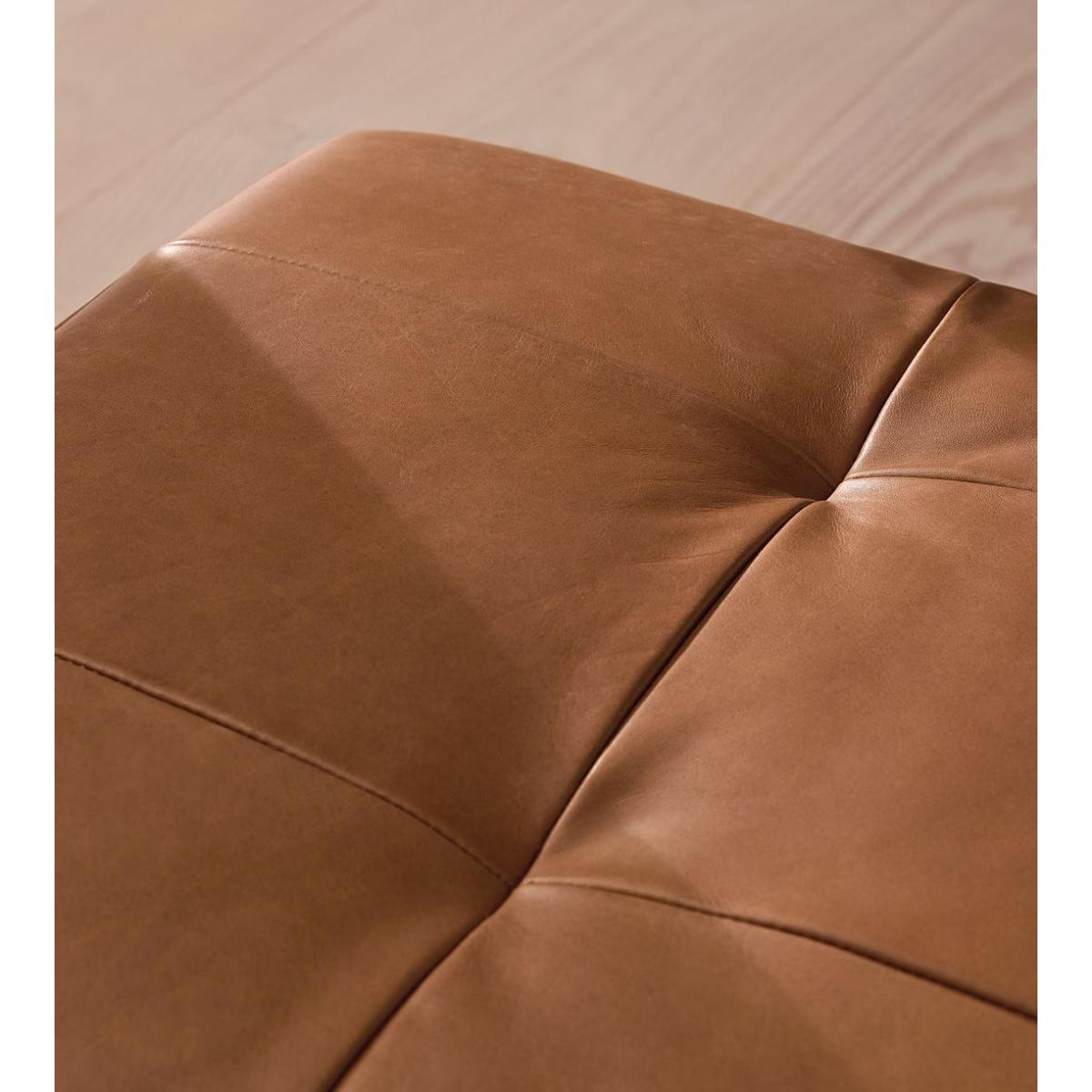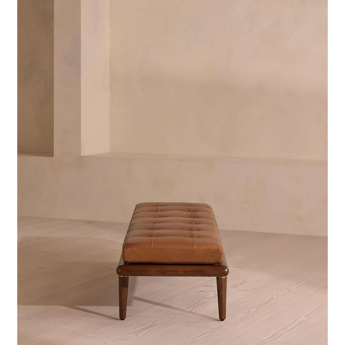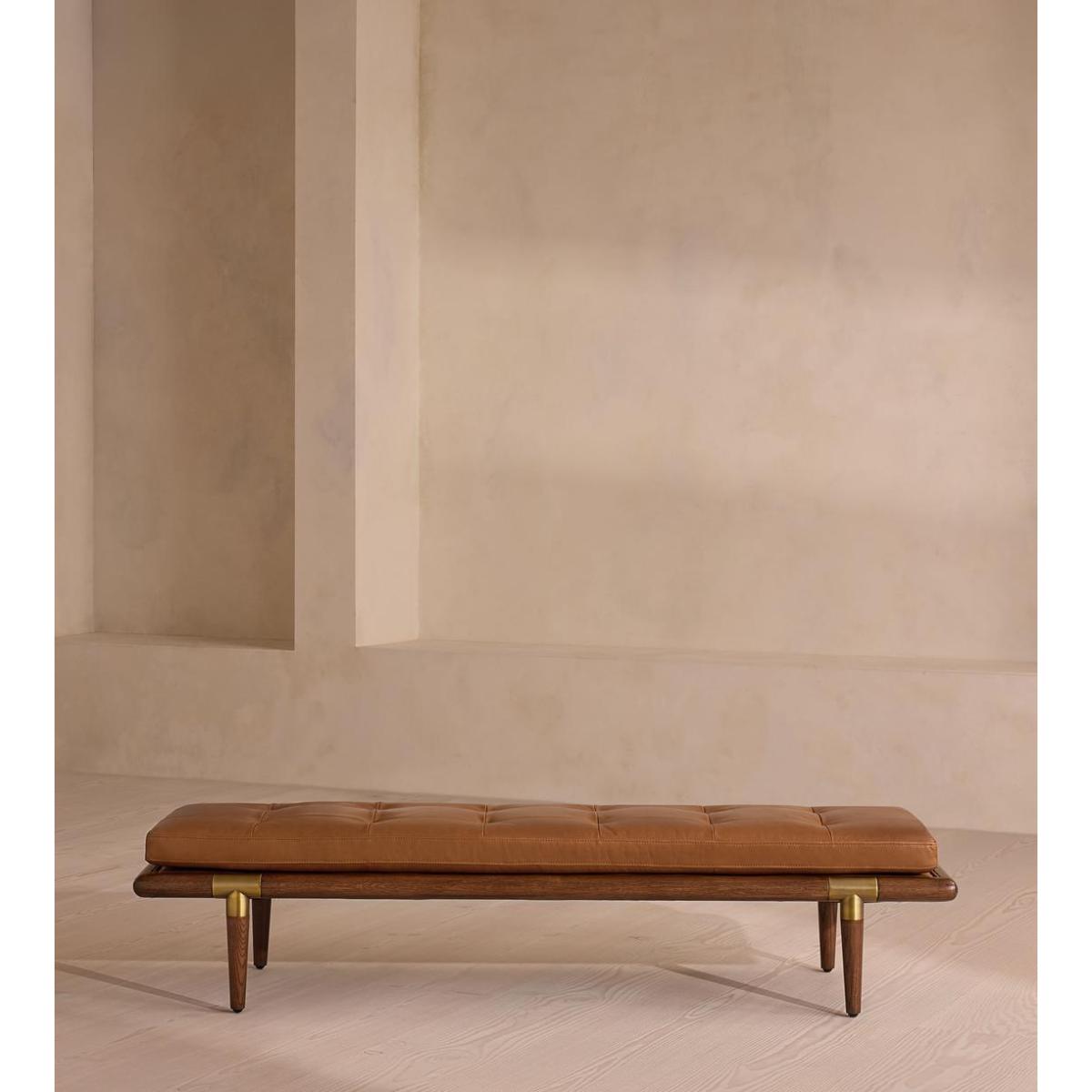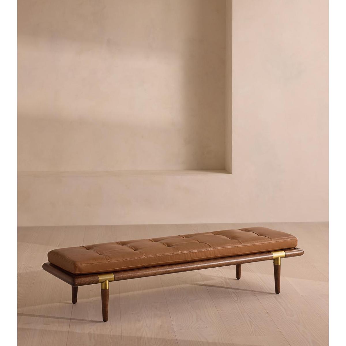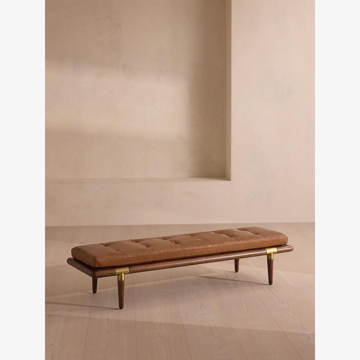 A blind-tufted, feather-wrapped seat cushion is upholstered in leather to create a wide silhouette made for relaxing. Taking cues from Soho House 40 Greek Street with the brass detailing at the bottom of its birch and oakwood legs, this bench is designed to pair with the Theodore armchair or mix and match across the rest of our collection. Its blind-tufted, feather-wrapped seat cushion is upholstered in leather and co-ordinates with a bolster cushion secured by a single strap.