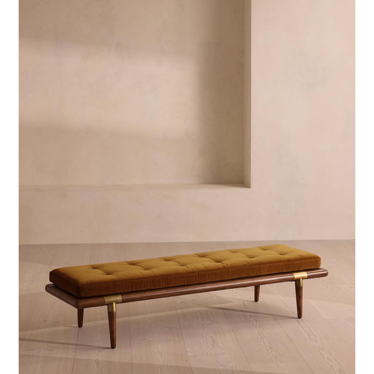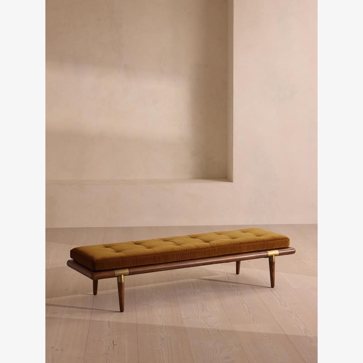A blind-tufted, feather-wrapped seat cushion is upholstered in velvet to create a wide silhouette made for relaxing. Taking cues from Soho House 40 Greek Street with the brass detailing at the bottom of its birch and oakwood legs, this bench is designed to pair with the Theodore armchair or mix and match across the rest of our collection. Its blind-tufted, feather-wrapped seat cushion is upholstered in velvet and co-ordinates with a bolster cushion secured by a single strap.