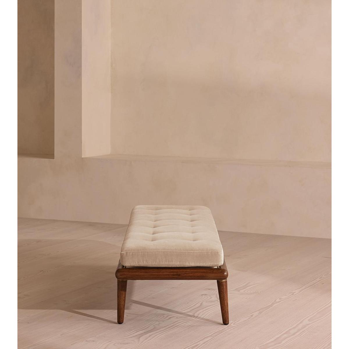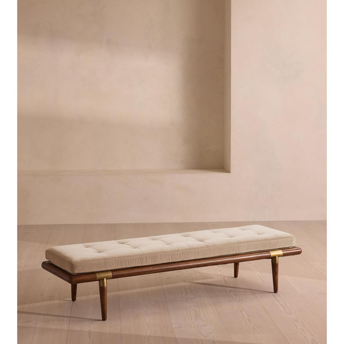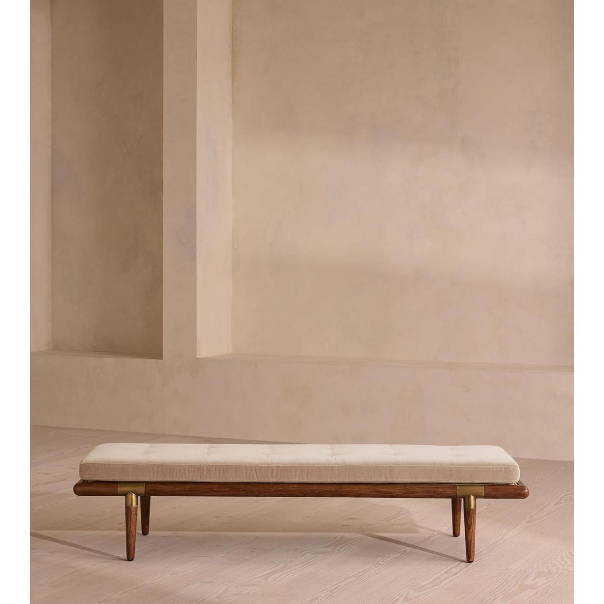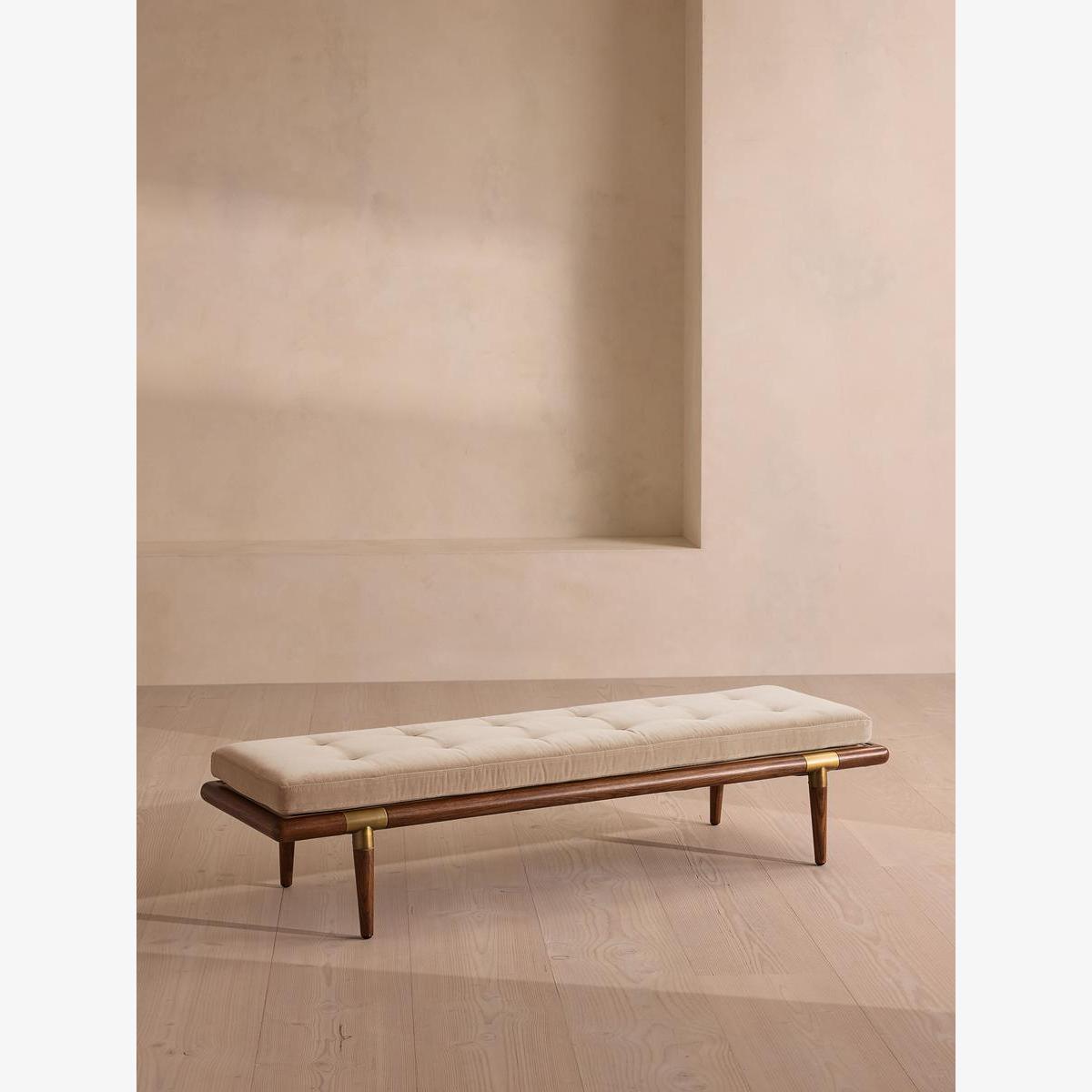 A blind-tufted, feather-wrapped seat cushion is upholstered in velvet to create a wide silhouette made for relaxing. Taking cues from Soho House 40 Greek Street with the brass detailing at the bottom of its birch and oakwood legs, this bench is designed to pair with the Theodore armchair or mix and match across the rest of our collection. Its blind-tufted, feather-wrapped seat cushion is upholstered in velvet and co-ordinates with a bolster cushion secured by a single strap.