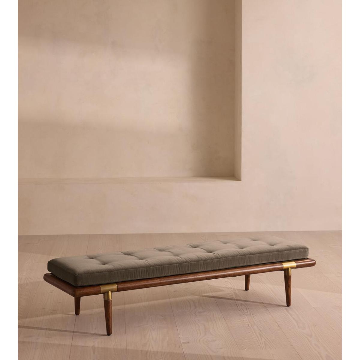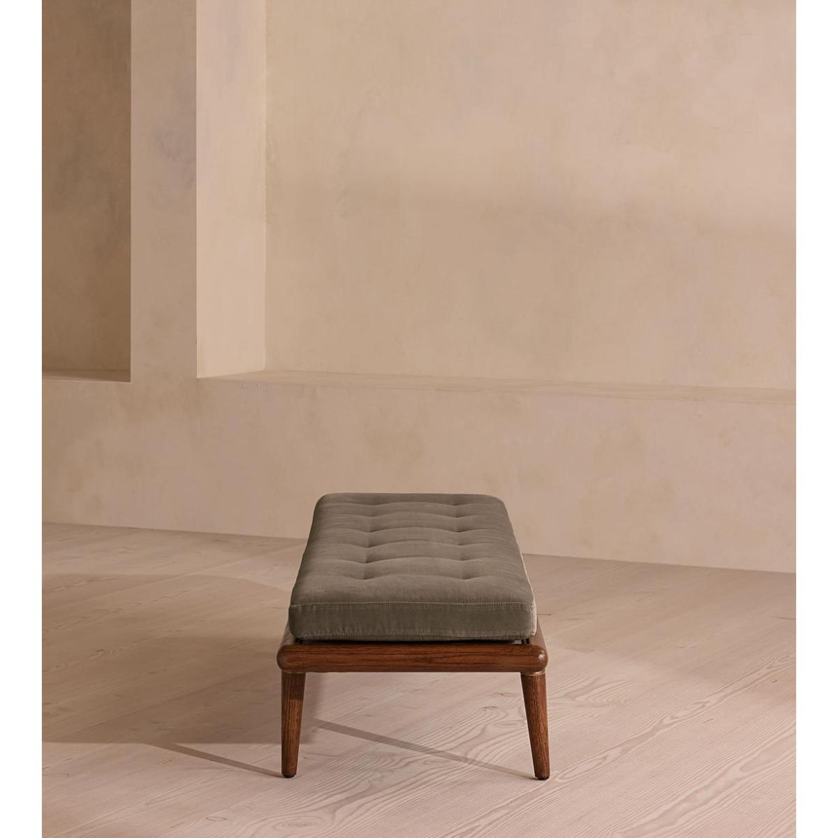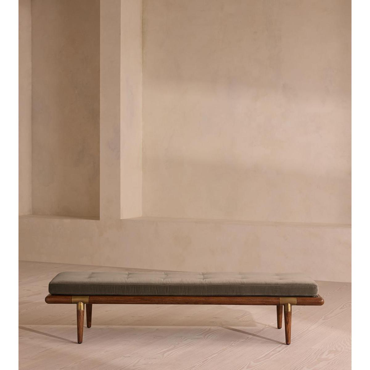 A blind-tufted, feather-wrapped seat cushion is upholstered in velvet to create a wide silhouette made for relaxing. Taking cues from Soho House 40 Greek Street with the brass detailing at the bottom of its birch and oakwood legs, this bench is designed to pair with the Theodore armchair or mix and match across the rest of our collection. Its blind-tufted, feather-wrapped seat cushion is upholstered in velvet and co-ordinates with a bolster cushion secured by a single strap.