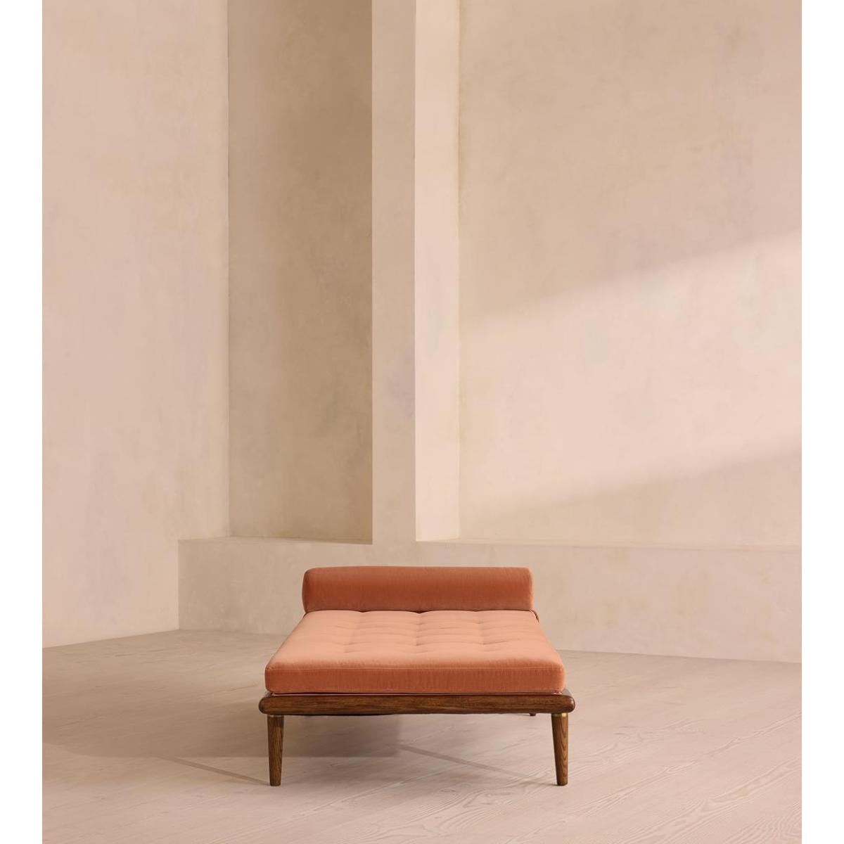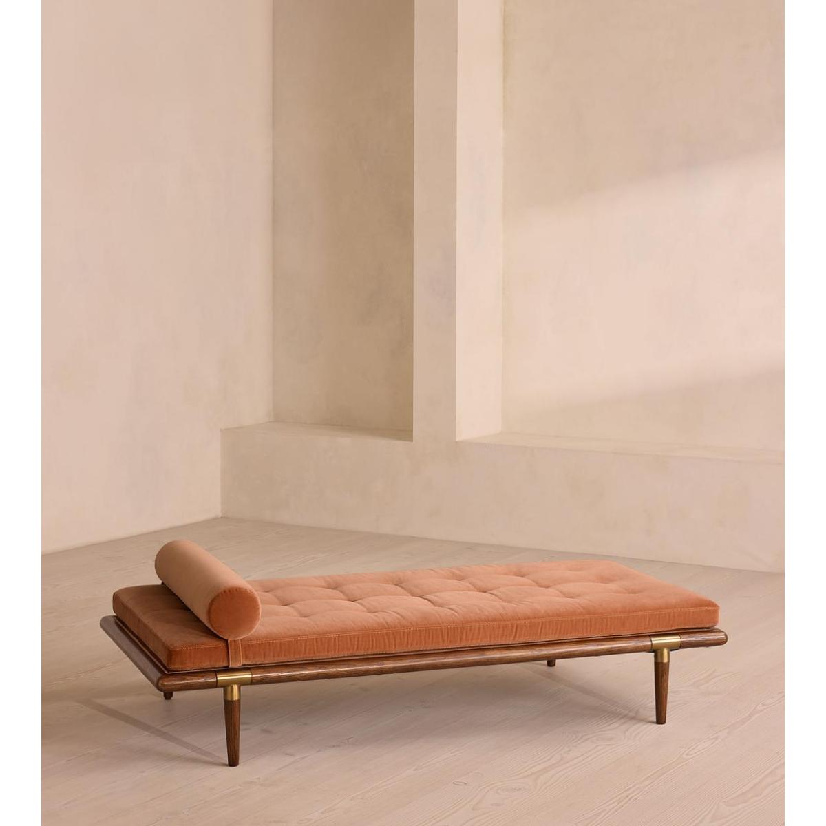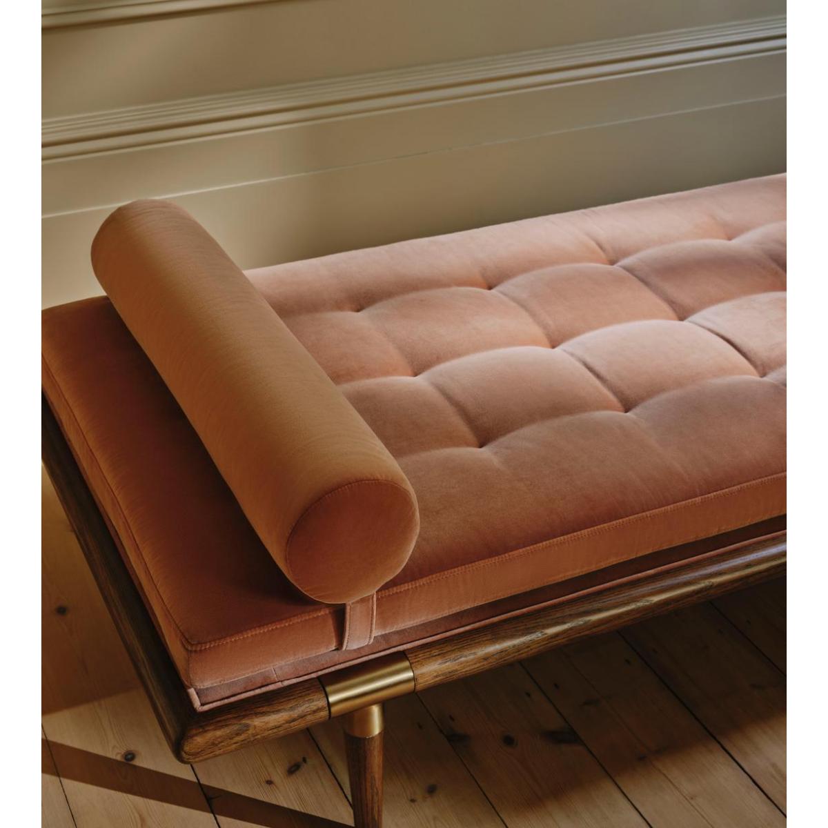 Tapered legs carved from birch and oak are paired with a comfortable, feather-wrapped cushion upholstered in velvet. Designed to co-ordinate with the Theodore armchair or mix and match across the rest of our collection, this daybed pairs a tapered birch and oak frame with velvet upholstery. Taking cues from the interiors of Soho House 40 Greek Street, it's finished with brass detailing on the legs and a comfortable, feather-wrapped foam cushion.