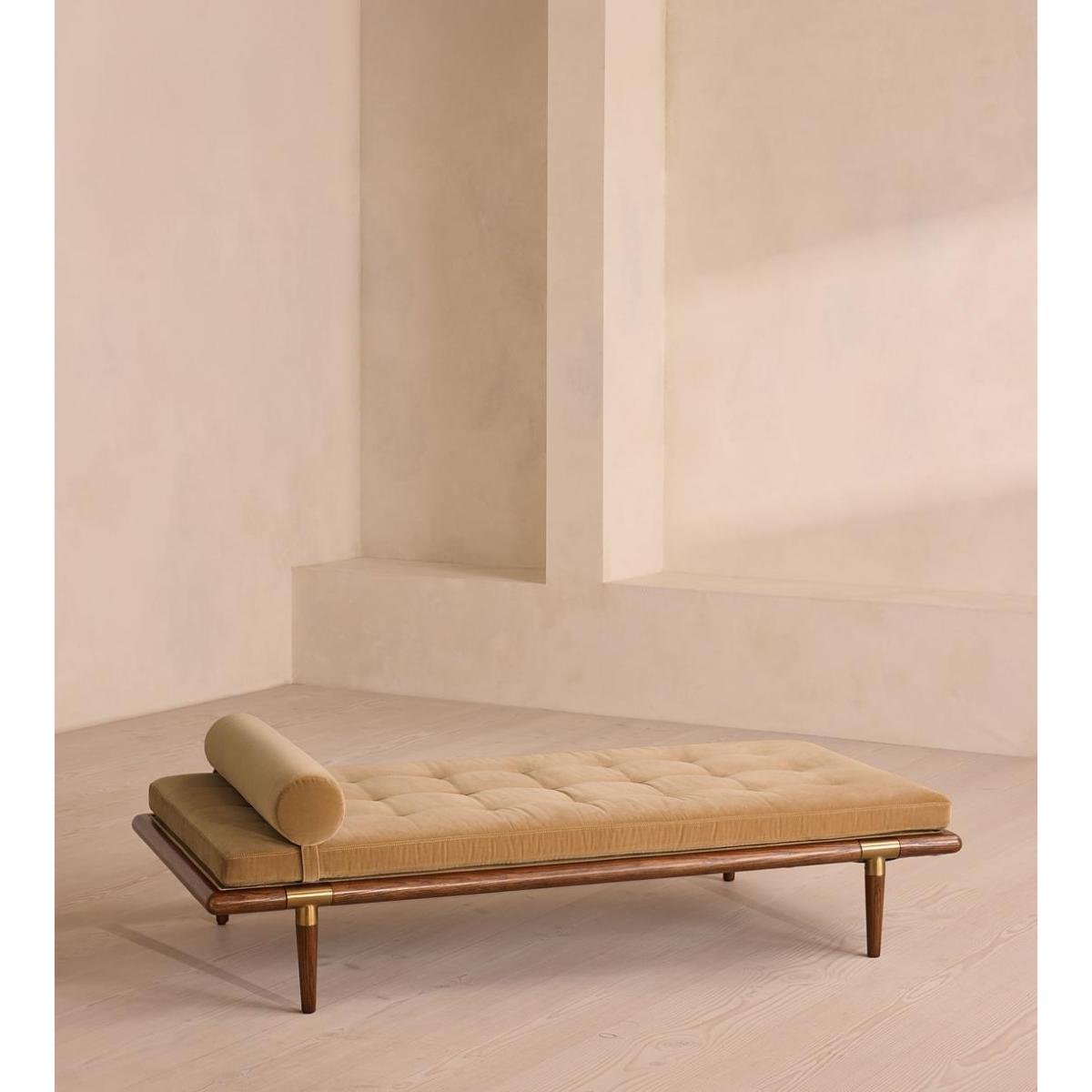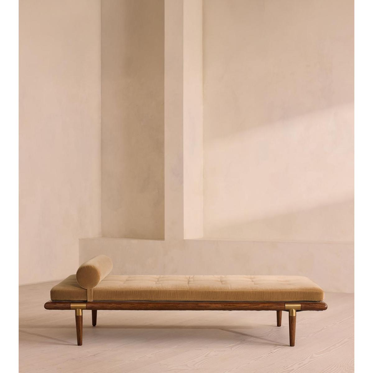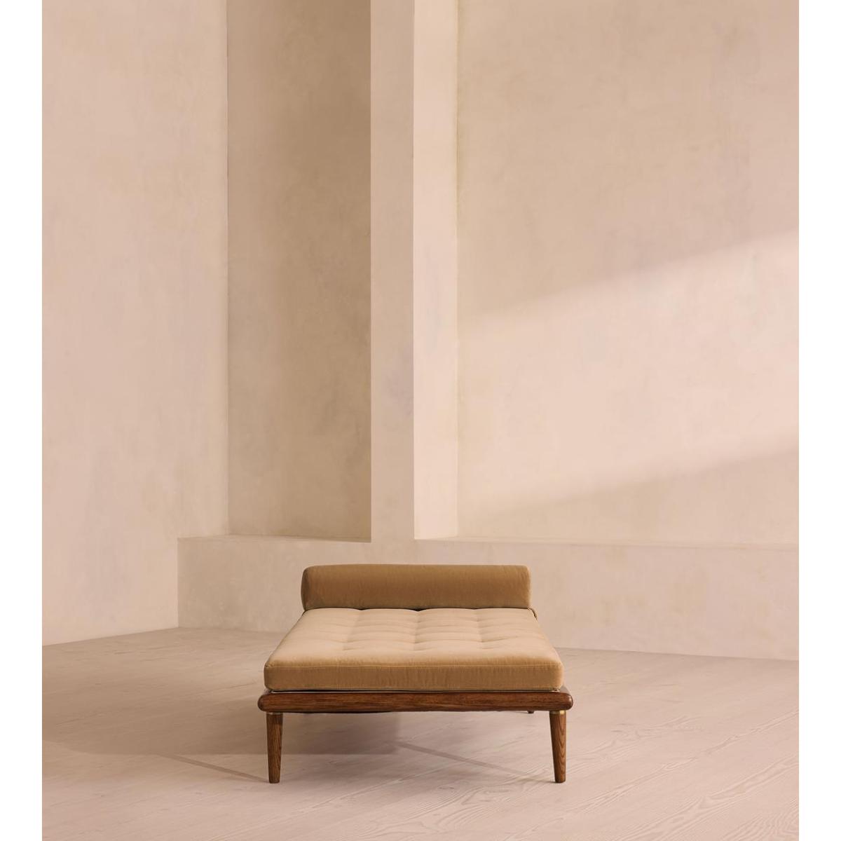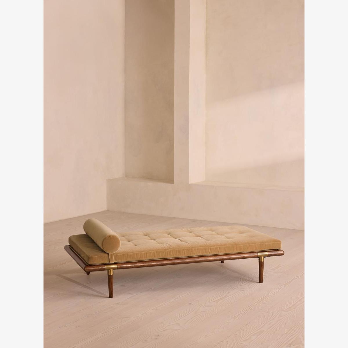 Tapered legs carved from birch and oak are paired with a comfortable, feather-wrapped cushion upholstered in velvet. Designed to co-ordinate with the Theodore armchair or mix and match across the rest of our collection, this daybed pairs a tapered birch and oak frame with velvet upholstery. Taking cues from the interiors of Soho House 40 Greek Street, it's finished with brass detailing on the legs and a comfortable, feather-wrapped foam cushion.