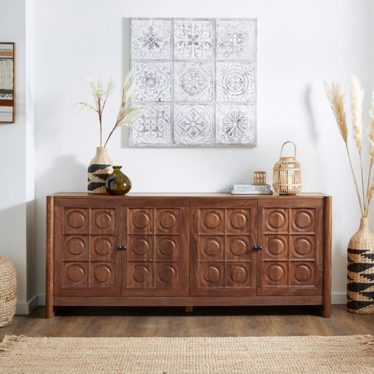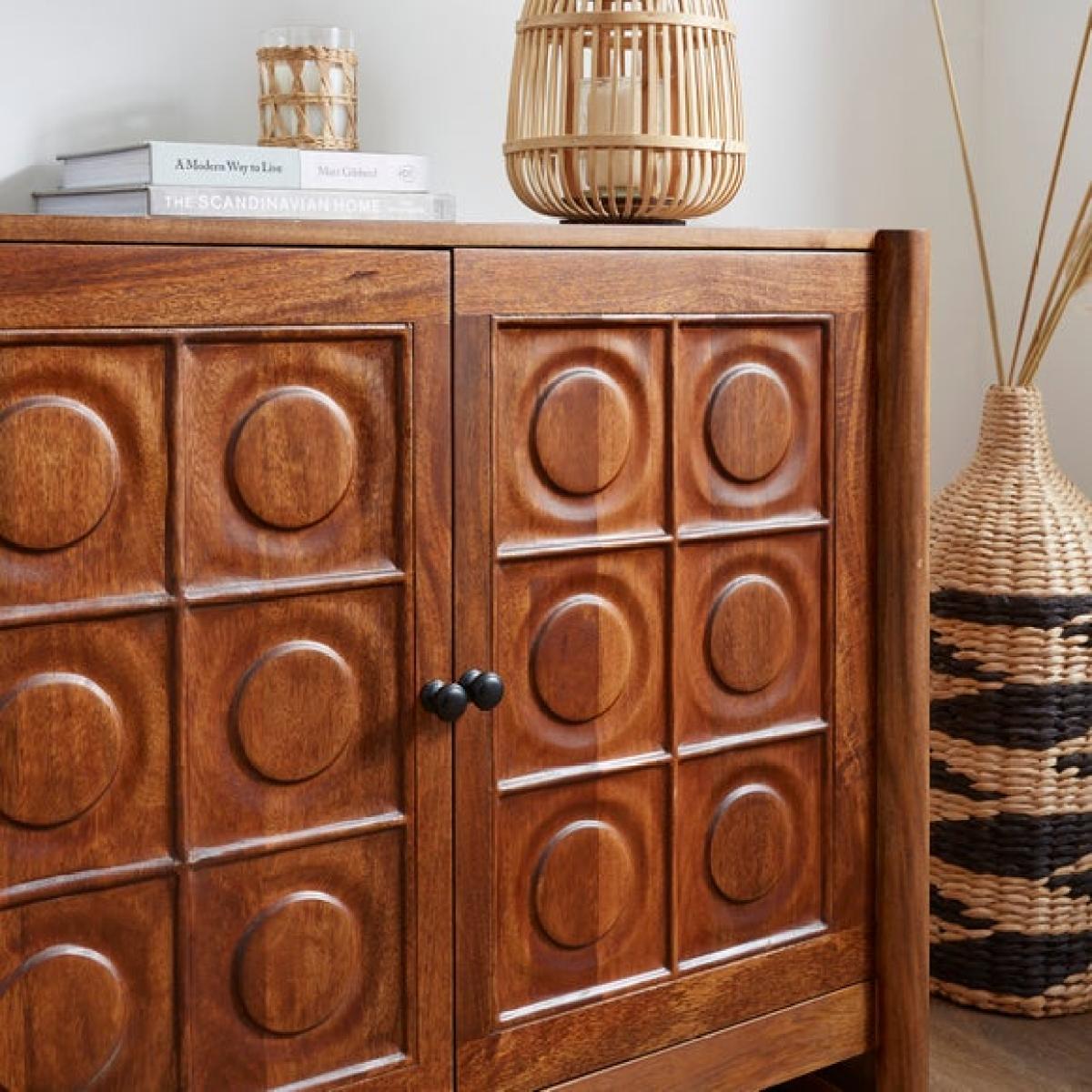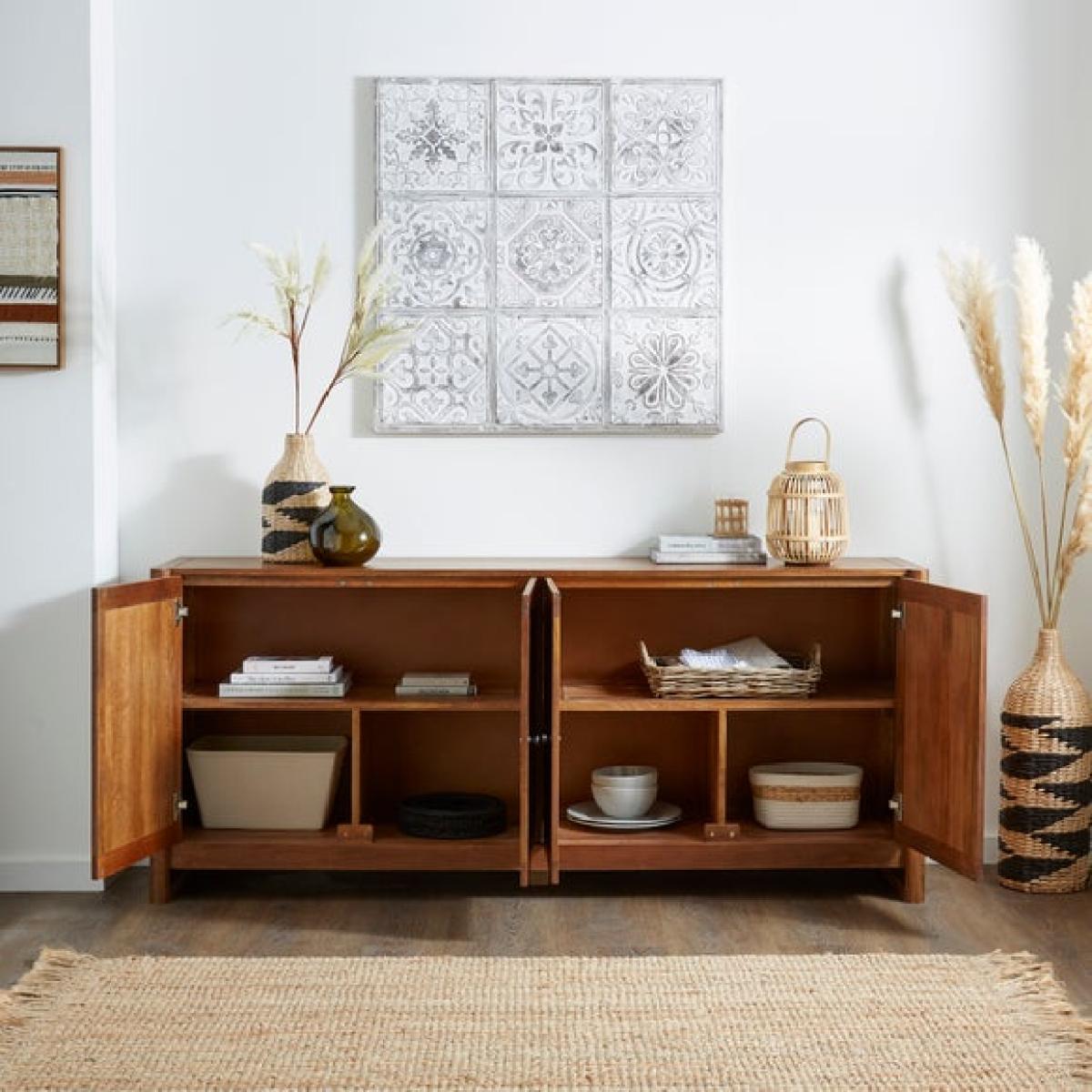 I love this sideboard for its bold, substantial presence and the warm, natural appeal of mango wood. It's versatile enough to suit a range of interiors, from mid-century modern to Scandinavian or boho styles. The extra wide design makes it perfect for creating a focal point in a living room or dining space, while offering ample storage. For styling, I recommend adding a combination of decorative objects like ceramics or vases, along with practical items such as a tray or baskets for organisation. To keep the look balanced, pair it with textured rugs and understated wall art, letting the rich wood tone be the star of the scheme.
