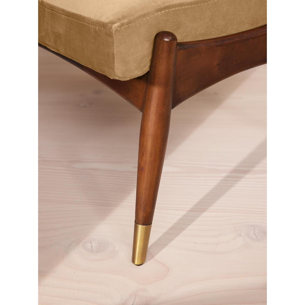 I love this piece because of its versatile design and rich velvet finish that adds a touch of luxury without feeling overly formal. The camel hue makes it an excellent anchor in both neutral and more colourful schemes, working well in mid-century modern, contemporary, or eclectic interiors. It’s great as a standalone accent or paired with a sofa to create a cosy reading nook. Practical styling tips include using it as a footrest in seating arrangements or as a statement piece at the foot of a bed. To keep it looking its best, consider placing it in low-traffic areas or using fabric protectors if it’s in a busier space. Its muted yet warm tone and sophisticated silhouette lend themselves to both casual and more refined settings.