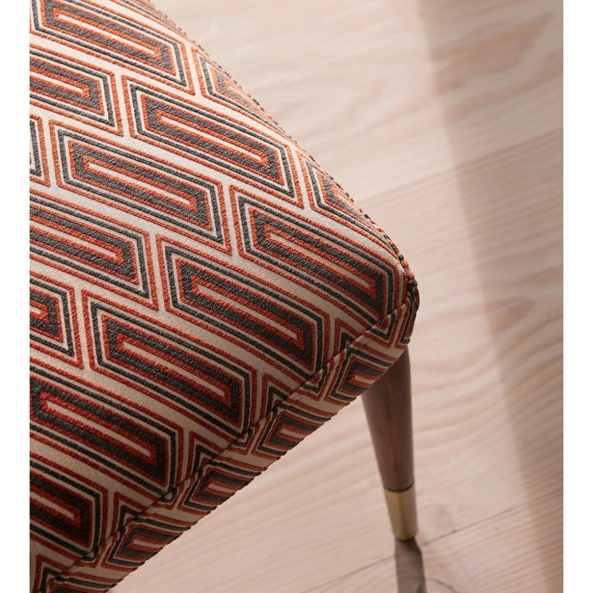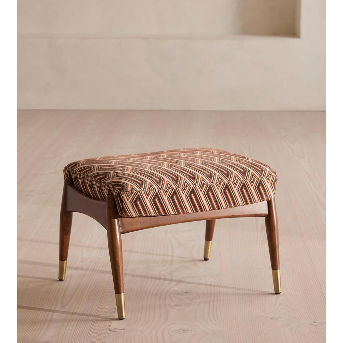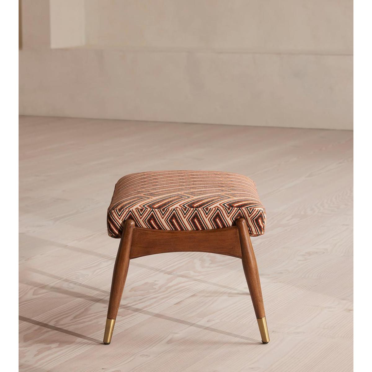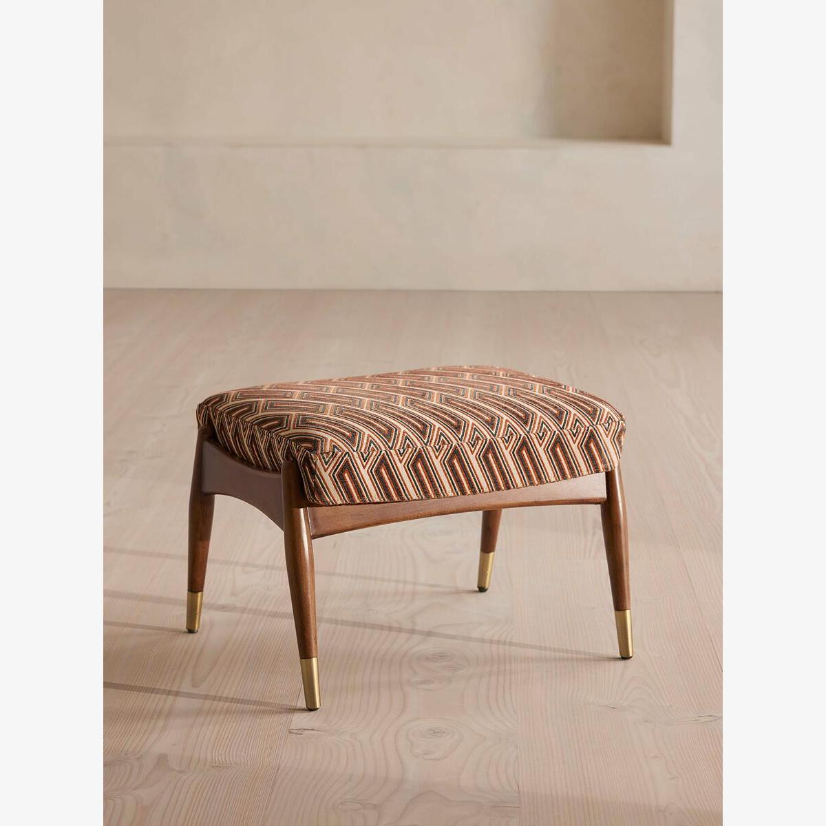 Taking cues from mid-century designs at Soho House 40 Greek Street, our Theodore footstool is the perfect partner to our Theodore armchair for a cosy seating set-up. The tapered wood frame features a feather-wrapped foam cushion for premium comfort when putting your feet up. This version is upholstered in a graphic Vende Jacquard fabric designed by our team for a piece that's unique to Soho House. Graphic-print footstool Tapered birch wood frame Brass cap feet Upholstered in Vende Jacquard fabric Feather and down-wrapped foam cushion Also available in other fabrics and colourways Partner with our Theodore armchair Inspired by Soho House 40 Greek Street