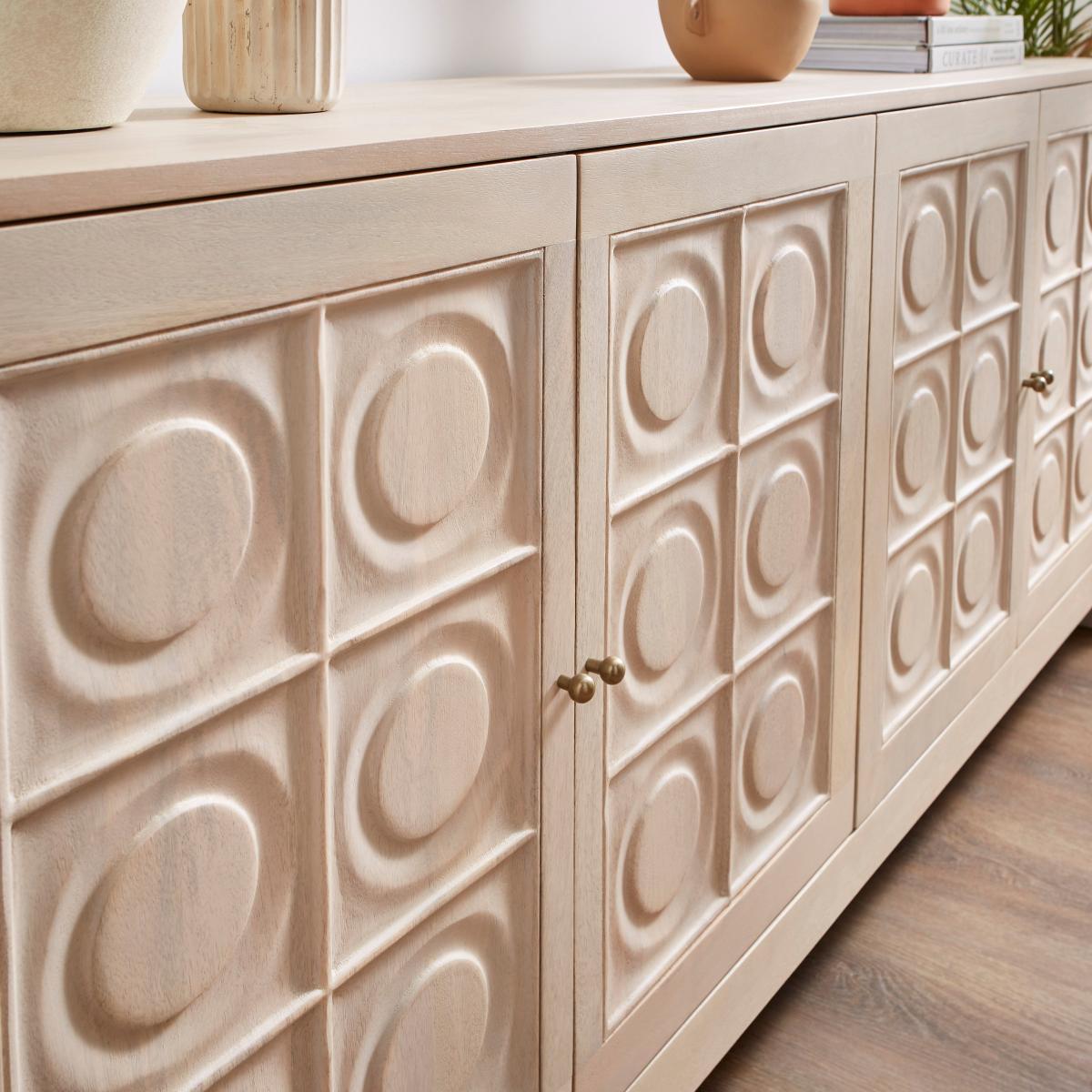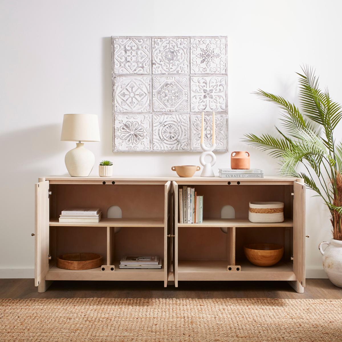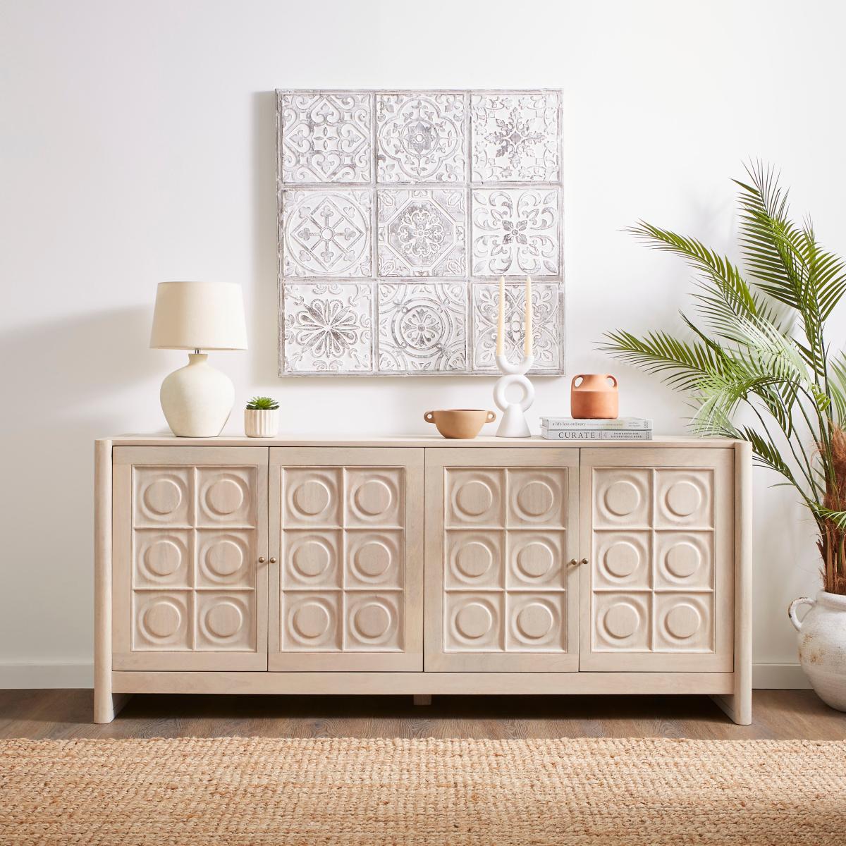 I’m a fan of this Theo sideboard for its clean whitewashed finish and subtle geometric detailing - it brings texture without overwhelming a space. It sits equally well in coastal, Scandinavian or modern farmhouse interiors thanks to its neutral hue and pared-back silhouette. To style, layer low ceramic vases or a small lamp on one side and a stack of art books on the other for balance. Hang a square-format print or mirror above to echo the doors’ pattern, and tuck a woven jute or sisal runner underneath to ground the look. Inside, use it to stow tableware, linens or board games, keeping surfaces clutter-free and functional.