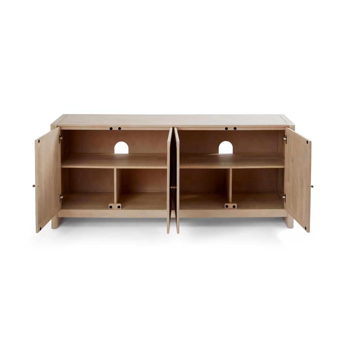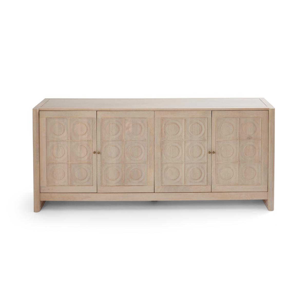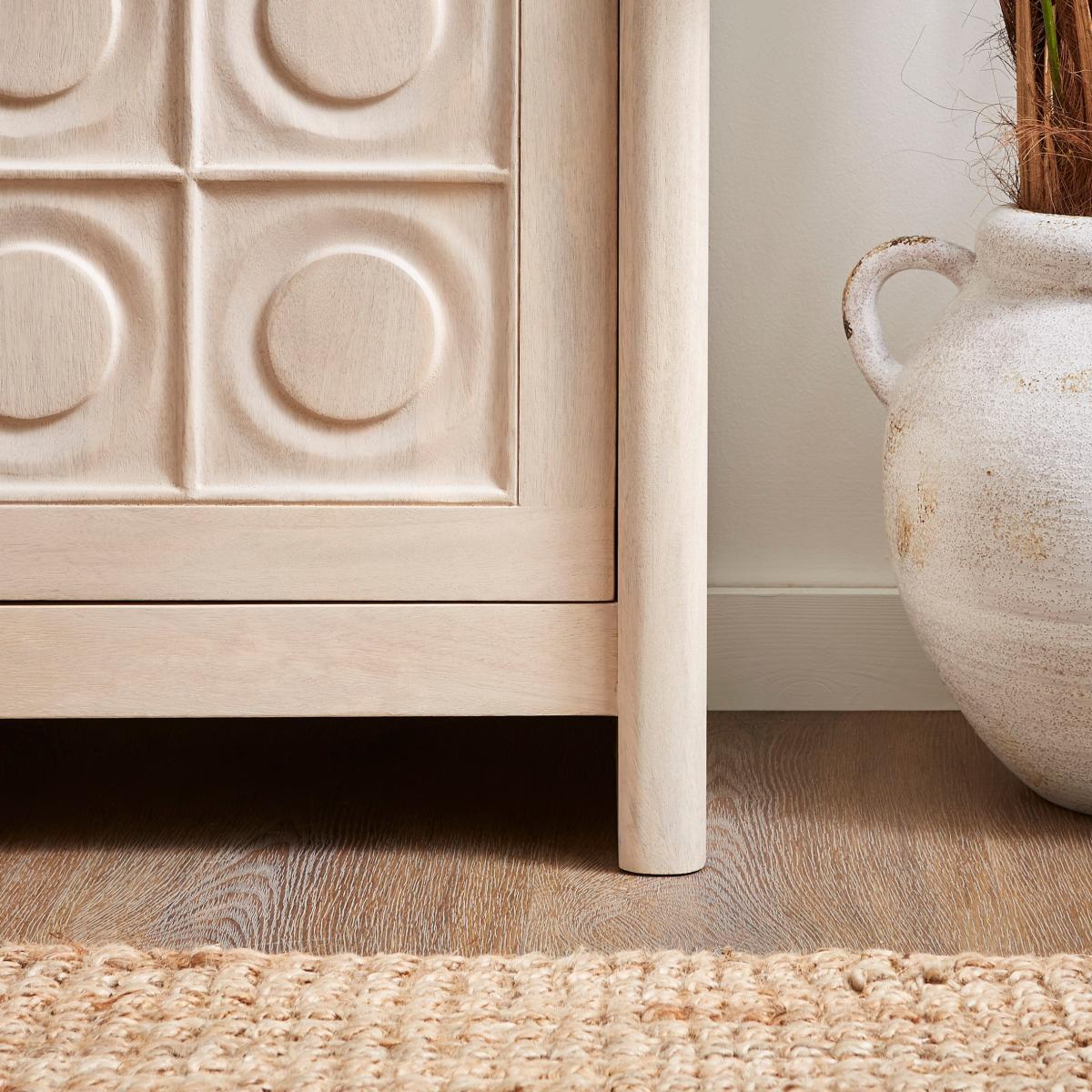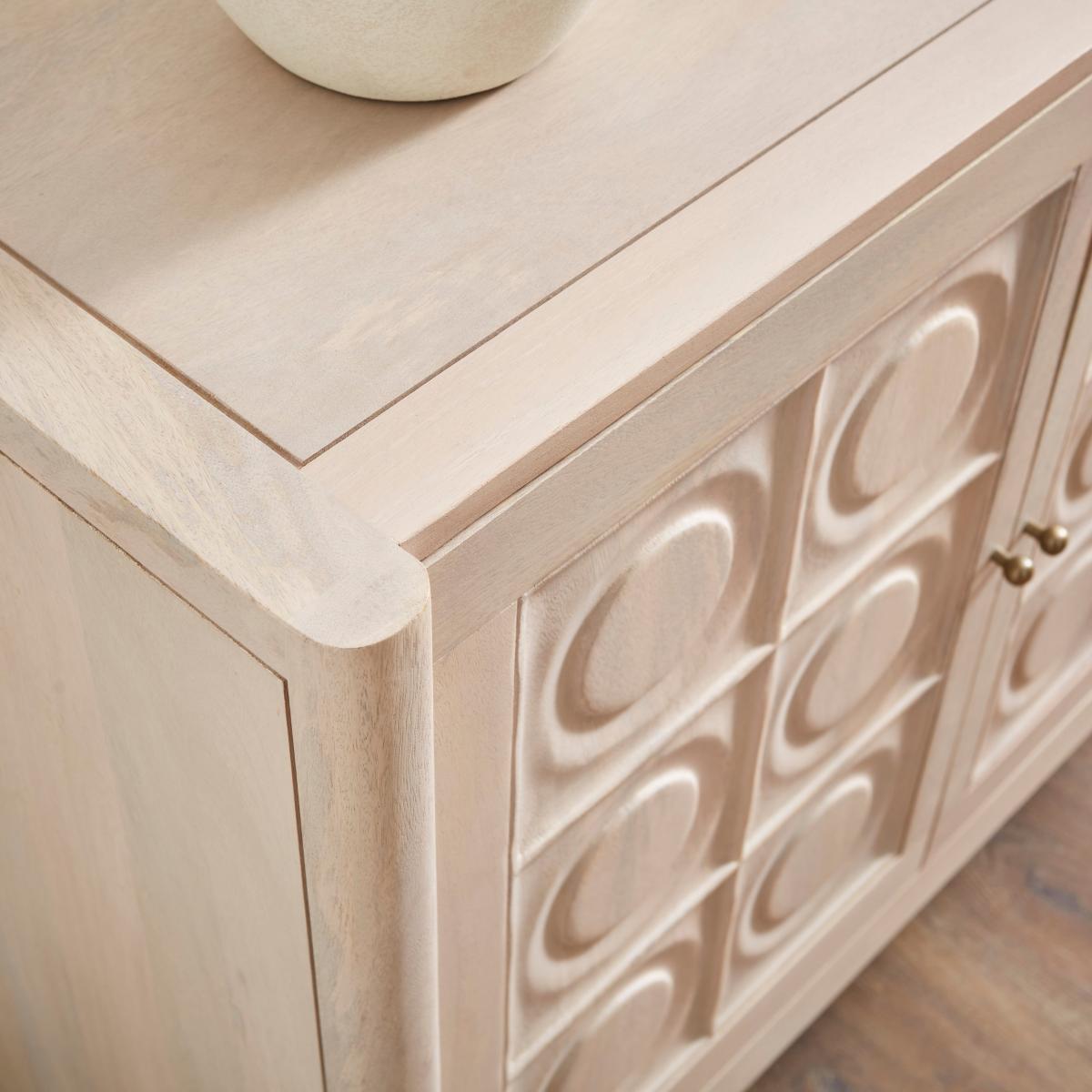 I’m a fan of this Theo sideboard for its clean whitewashed finish and subtle geometric detailing - it brings texture without overwhelming a space. It sits equally well in coastal, Scandinavian or modern farmhouse interiors thanks to its neutral hue and pared-back silhouette. To style, layer low ceramic vases or a small lamp on one side and a stack of art books on the other for balance. Hang a square-format print or mirror above to echo the doors’ pattern, and tuck a woven jute or sisal runner underneath to ground the look. Inside, use it to stow tableware, linens or board games, keeping surfaces clutter-free and functional.