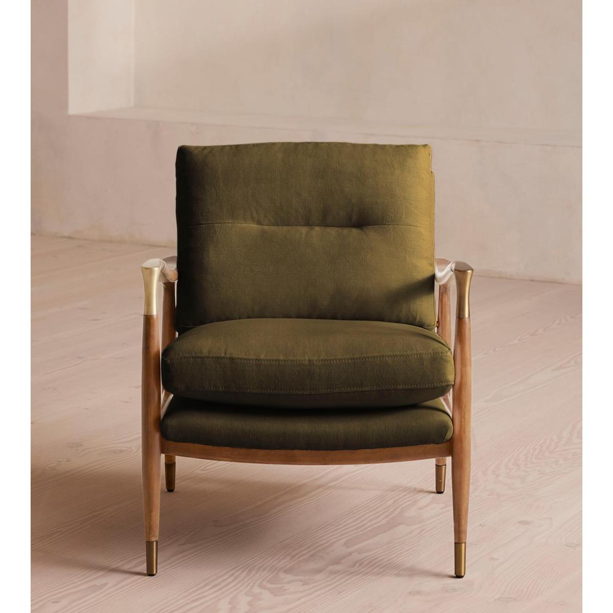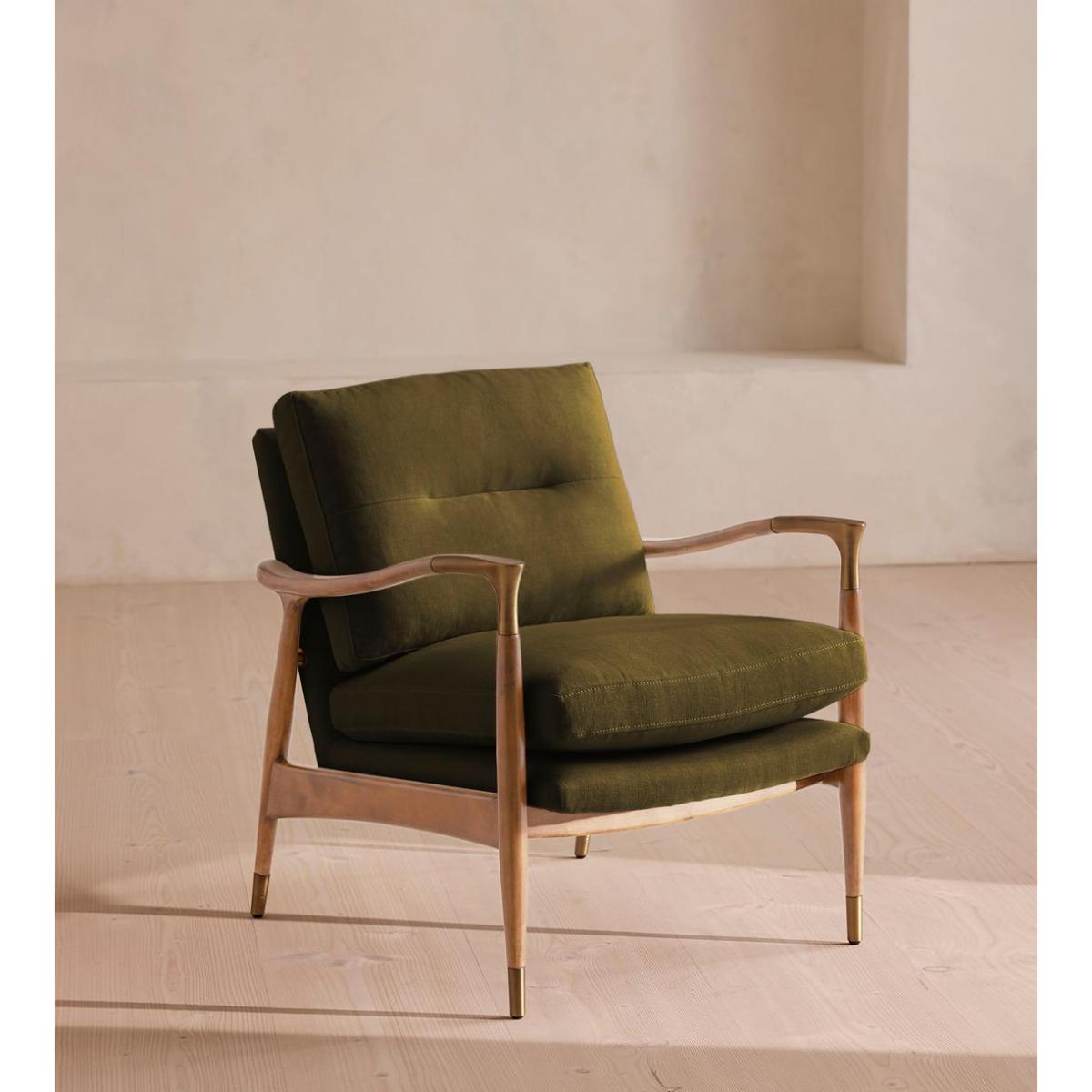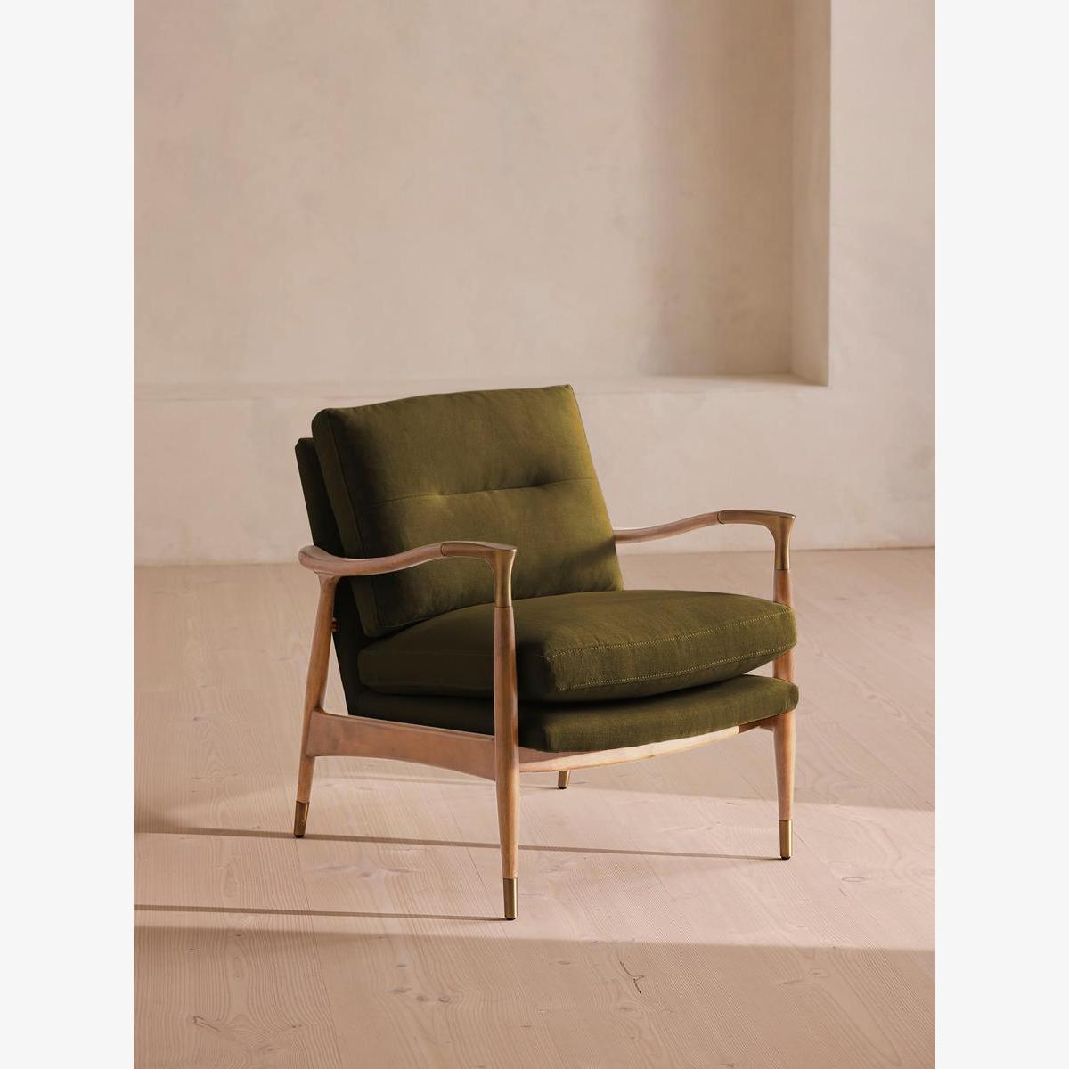 I love this armchair for its classic yet versatile style. The linen in olive adds a touch of understated elegance, making it a great piece for both contemporary and traditional interiors. It works particularly well in relaxed living rooms, reading nooks, or even as a statement piece in a sophisticated bedroom. For styling, consider pairing it with textured cushions or layered throws in neutral or earthy tones to complement the linen. Its wooden frame lends itself to pairing with other natural materials like rattan or brass, creating a warm and inviting space. Practical tips include placing it near a good reading light or window to make the most of its cosy appeal.