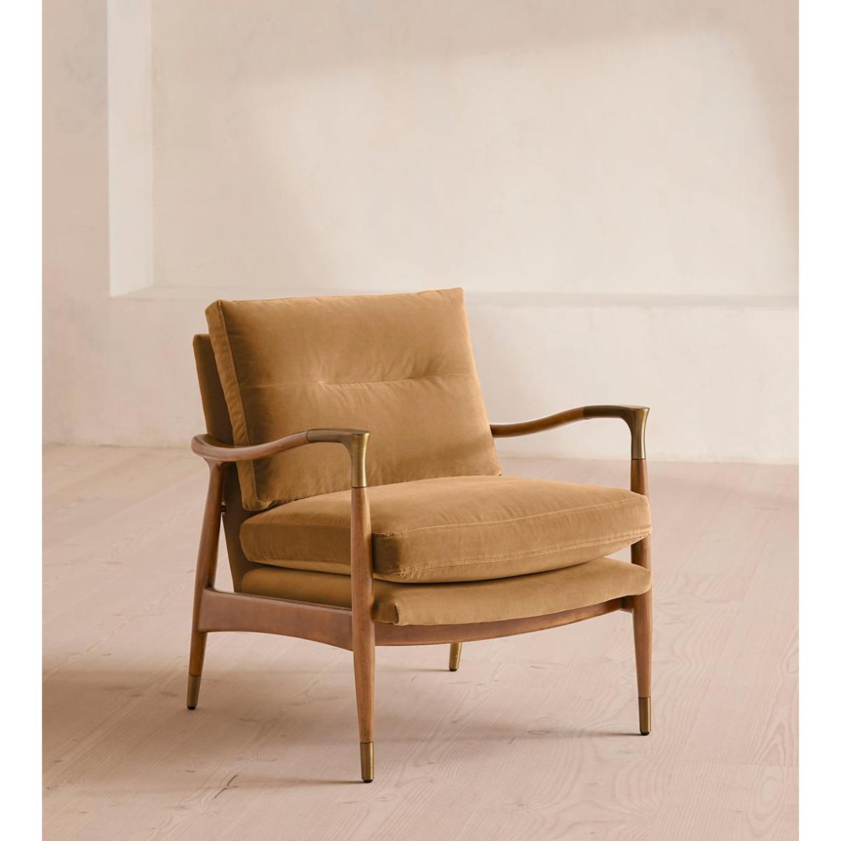 I love this armchair for its classic yet versatile design; the warm Camel velvet adds a touch of luxury that works well in both contemporary and traditional interiors. It's a great choice for living rooms or reading nooks, especially when paired with neutral tones or warm woods. Practical styling tips include layering with textured cushions or contrasting throws to add depth, or placing it near a statement lamp or side table for an inviting, functional corner. Its understated elegance makes it adaptable, so it integrates seamlessly into schemes with mid-century, Scandinavian, or eclectic influences.
