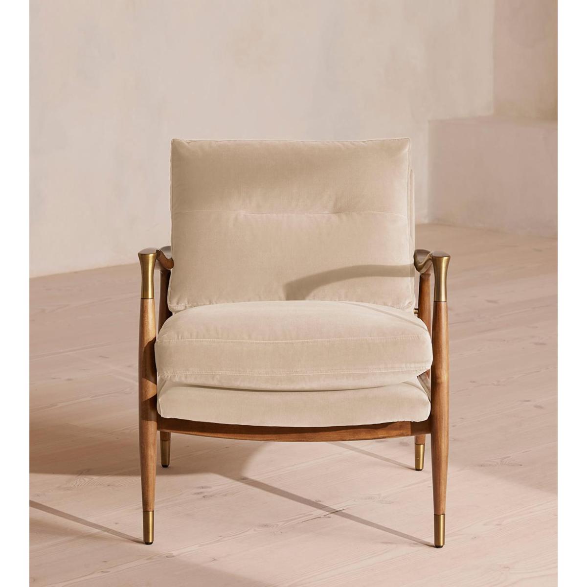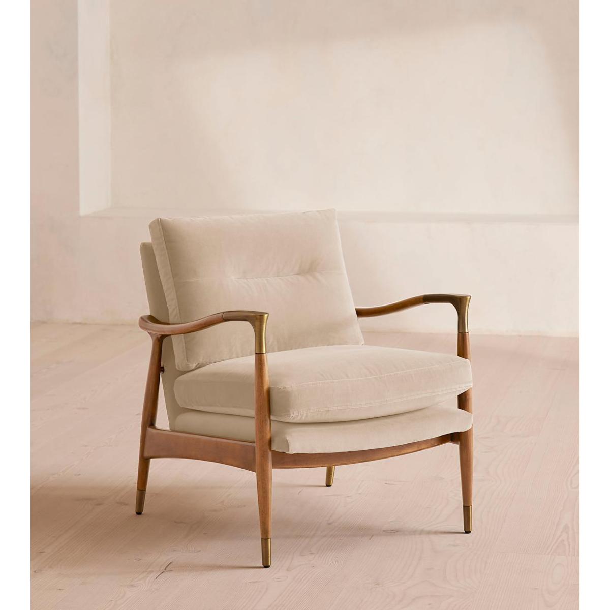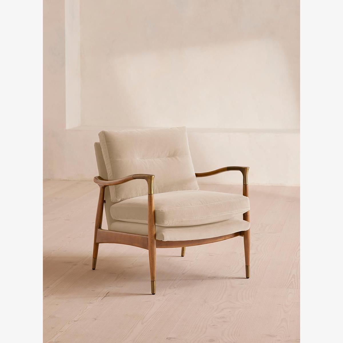 I love this armchair for its timeless mix of classic and contemporary appeal. The velvet upholstery in porcelain adds a soft, refined touch that works well in both traditional and modern interiors. It's particularly versatile-ideal for a cosy reading nook, a stylish lounge, or as an accent piece in a bedroom. Practical styling tips include pairing it with neutral or pastel-toned accessories to highlight the velvet's subtle sheen, and layering with textured cushions for added comfort and visual interest. Its wooden framework brings warmth and lends itself perfectly to Scandinavian or mid-century inspired interiors, but it can also serve as a statement piece in more eclectic schemes. Overall, it's a smart, elegant choice that balances comfort with sophistication.