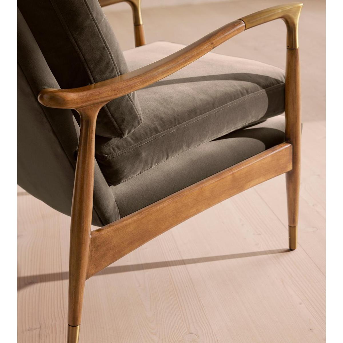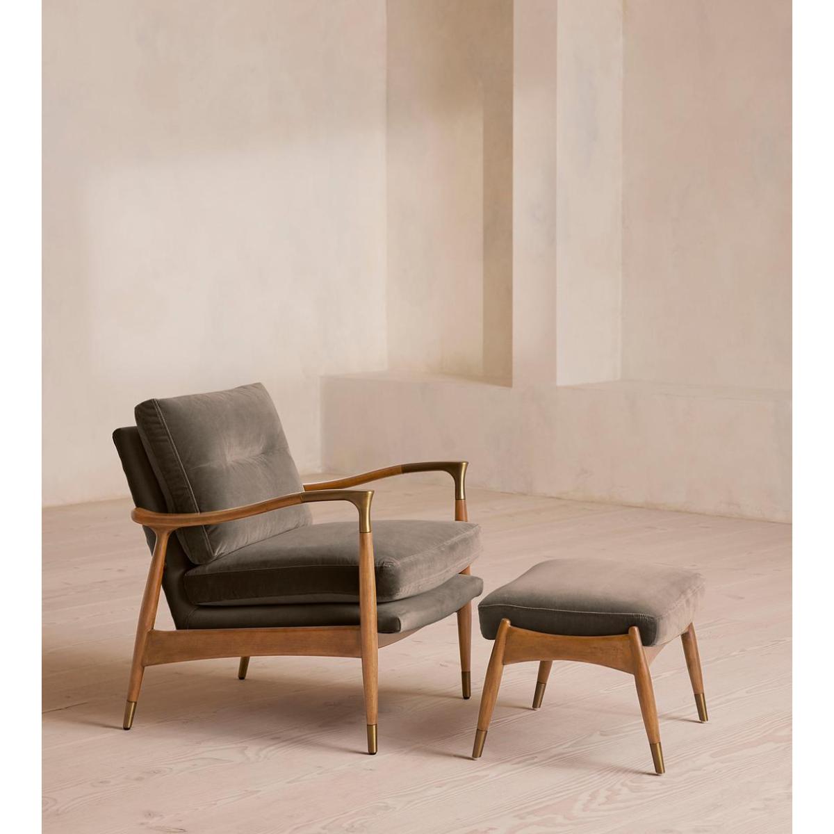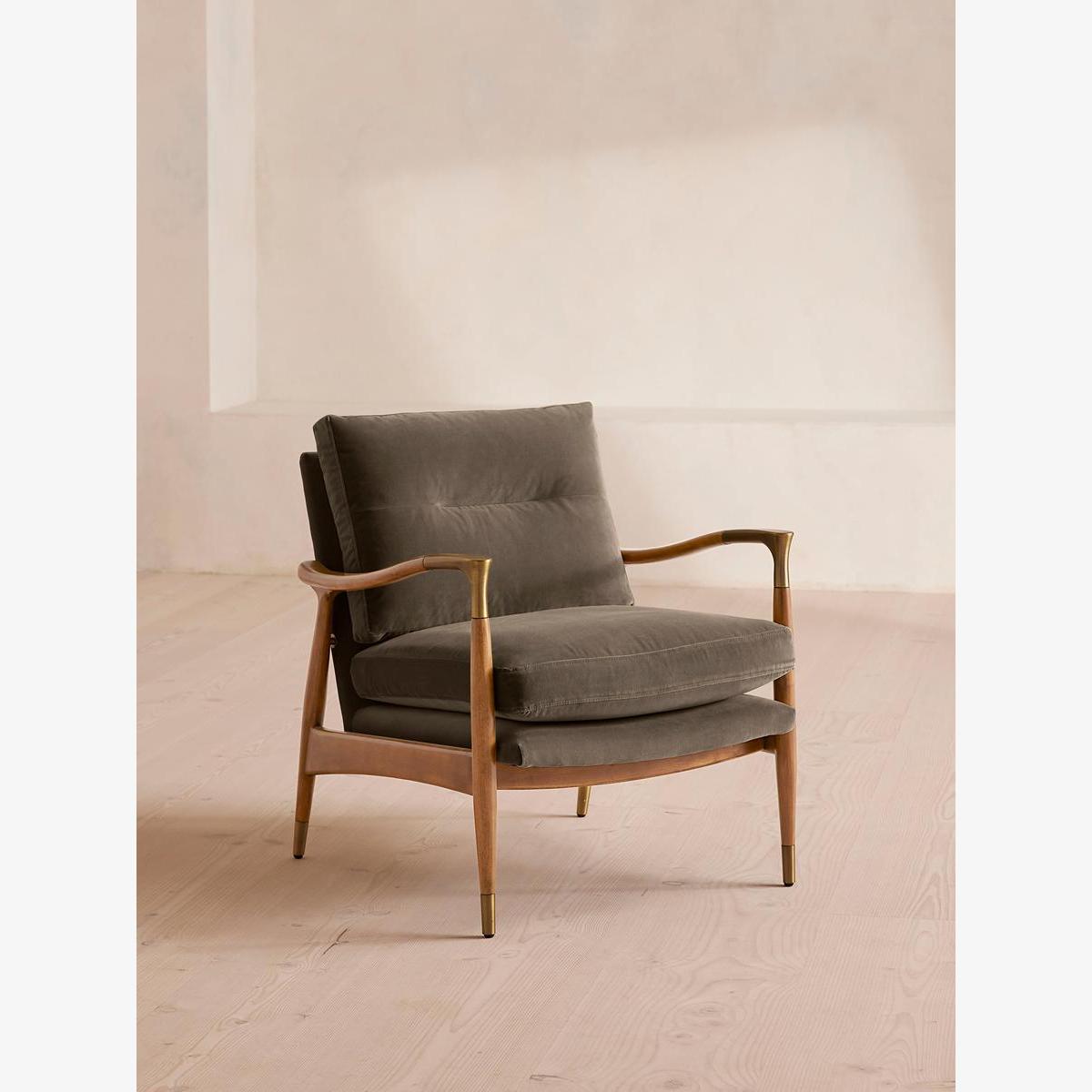 I love this armchair for its timeless appeal and sophisticated mix of materials. The taupe velvet adds a luxurious touch, while the wooden frame provides a warm, natural finish that works beautifully in both modern and traditional interiors. It’s a versatile piece that can anchor a living room corner or serve as a statement in a bedroom seating area. To style around it, consider pairing with textured cushions or a throw to enhance its plush appeal, and keep surrounding decor neutral or earthy to let the chair’s understated elegance shine through. Its compact size also makes it a practical choice for smaller spaces, offering comfort and style without overwhelming the room.