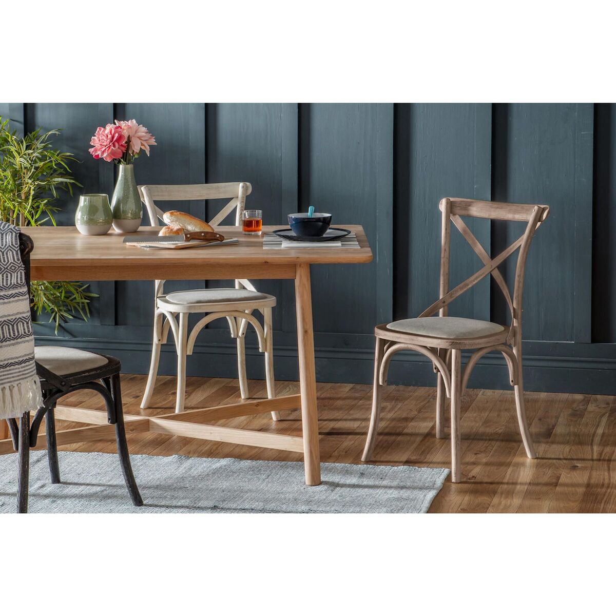 I’m a fan of these oak dining chairs for their clean lines and cross-back detail, which add character without overpowering a room. The natural finish works beautifully in Scandinavian, coastal or modern farmhouse schemes and blends with both whitewashed and darker wood tables. For styling, angle them slightly outwards at each end of a dining table to create a relaxed feel, then layer on neutral linen seat pads or lightly patterned cushions for comfort and a subtle textural contrast. They also pair well with a jute rug underneath to balance the warmth of the wood.