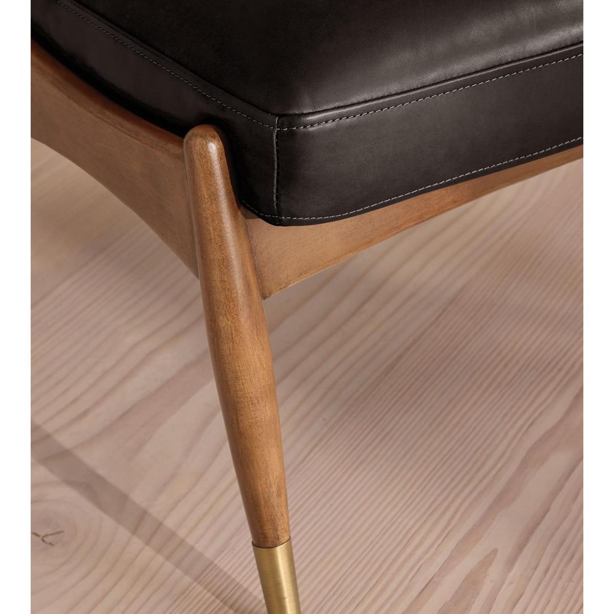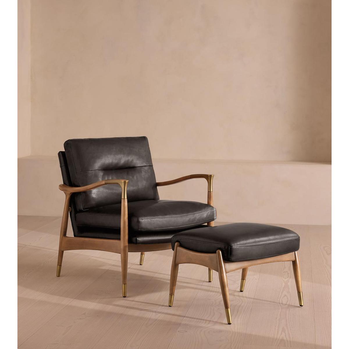 Tapered legs carved from oak are paired with a comfortable, feather-wrapped cushion upholstered in leather. Designed to co-ordinate with our Theodore armchair or mix and match across the rest of our collection, this footstool pairs a tapered oak wood frame with leather upholstery. Taking cues from the interiors of Soho House 40 Greek Street, it's finished with brass detailing on the legs and a comfortable, feather-wrapped foam cushion that acts as an extra seat or a place to put your feet up.