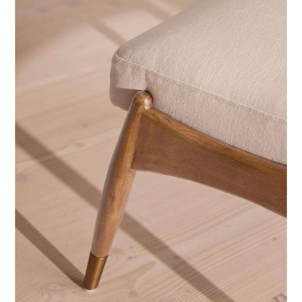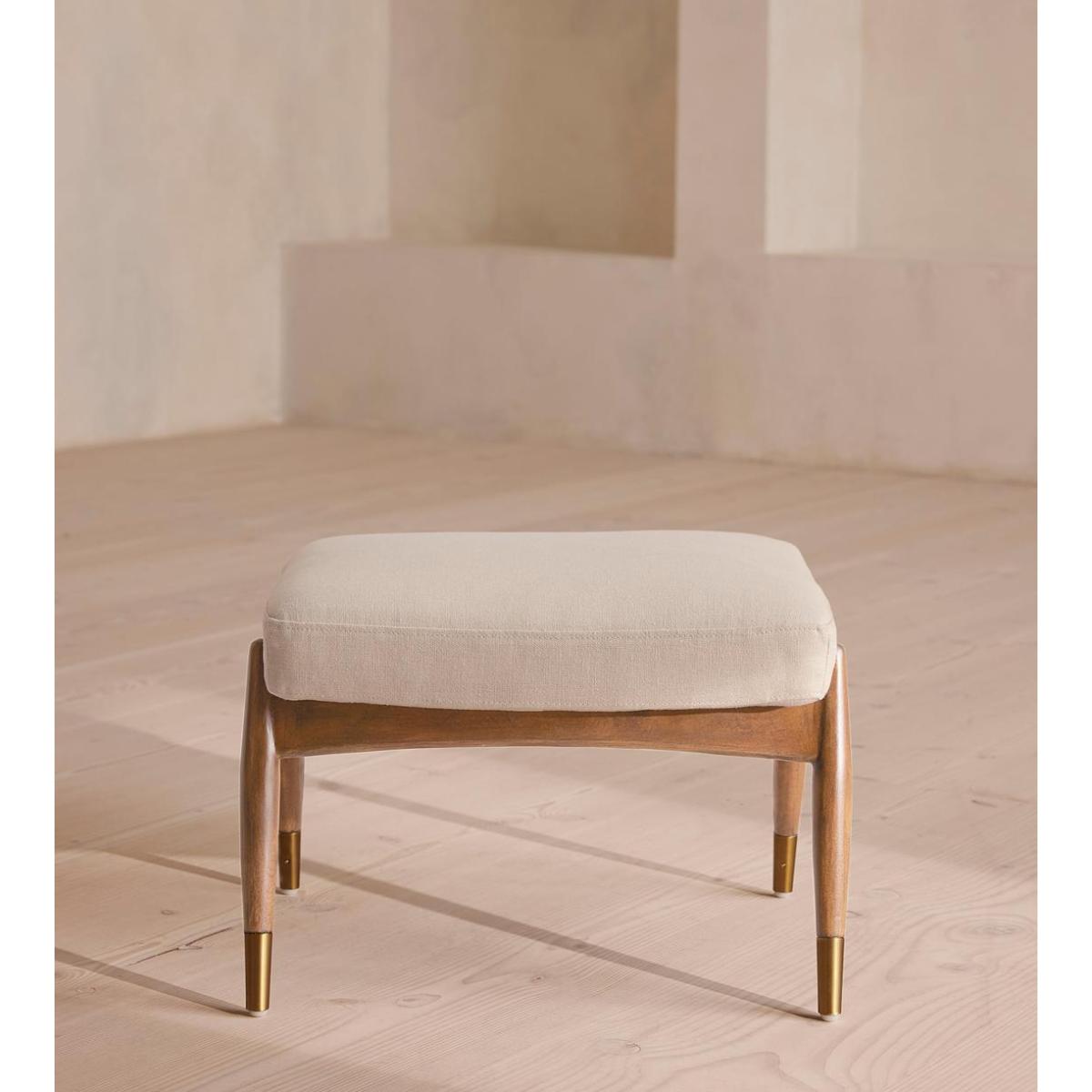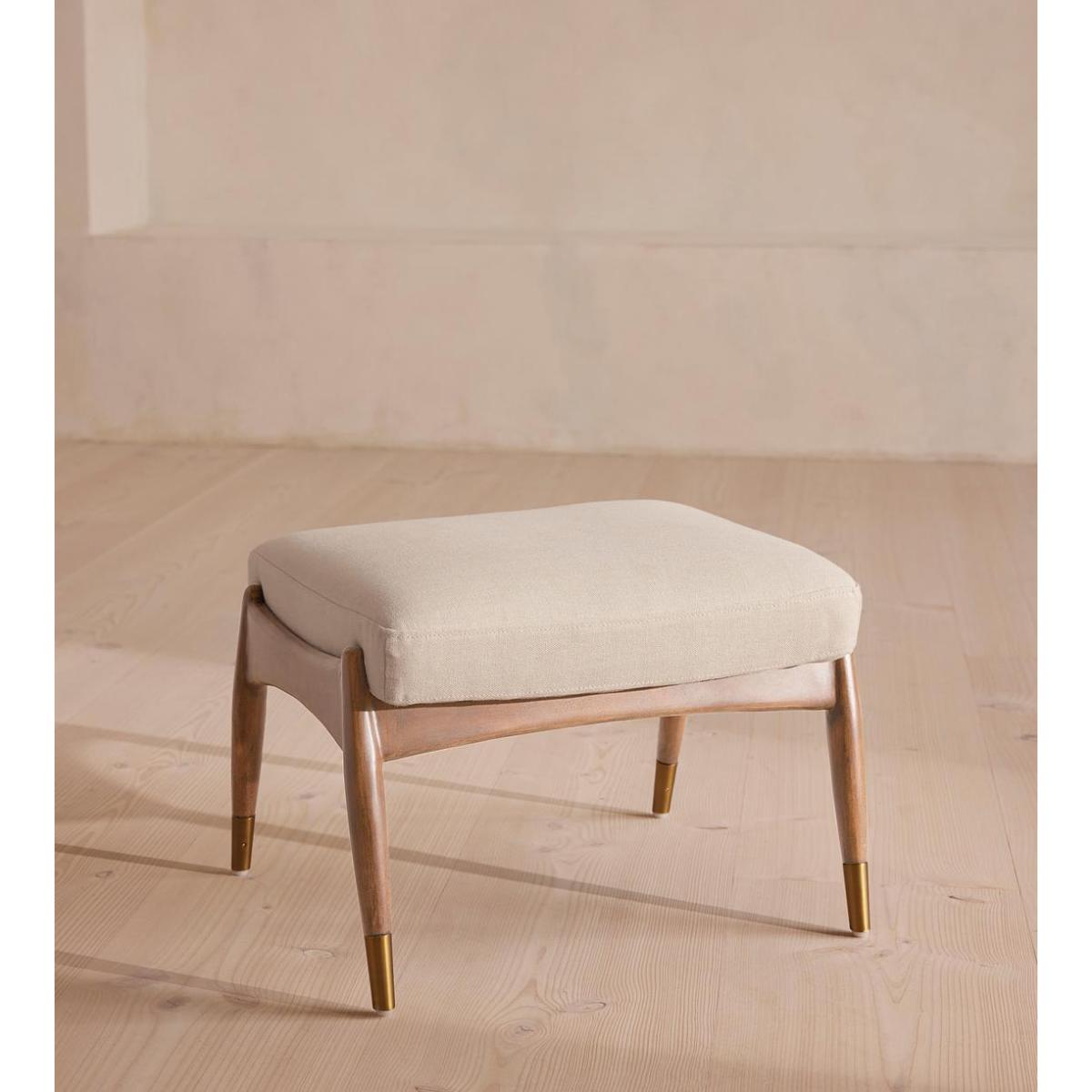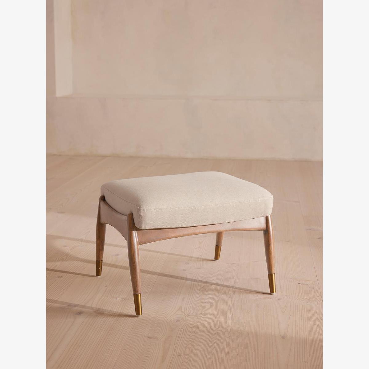 Tapered legs carved from oak are paired with a comfortable, feather-wrapped cushion upholstered in linen. Designed to co-ordinate with our Theodore armchair or mix and match across the rest of our collection, this footstool pairs a tapered oak wood frame with linen upholstery. Taking cues from the interiors of Soho House 40 Greek Street, it's finished with brass detailing on the legs and a comfortable, feather-wrapped foam cushion that acts as an extra seat or a place to put your feet up.