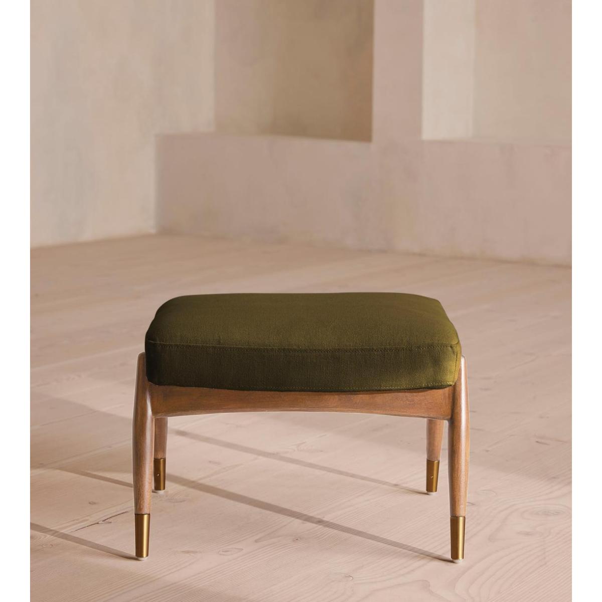 Tapered legs carved from oak are paired with a comfortable, feather-wrapped cushion upholstered in linen. Designed to co-ordinate with our Theodore armchair or mix and match across the rest of our collection, this footstool pairs a tapered oak wood frame with linen upholstery. Taking cues from the interiors of Soho House 40 Greek Street, it's finished with brass detailing on the legs and a comfortable, feather-wrapped foam cushion that acts as an extra seat or a place to put your feet up.