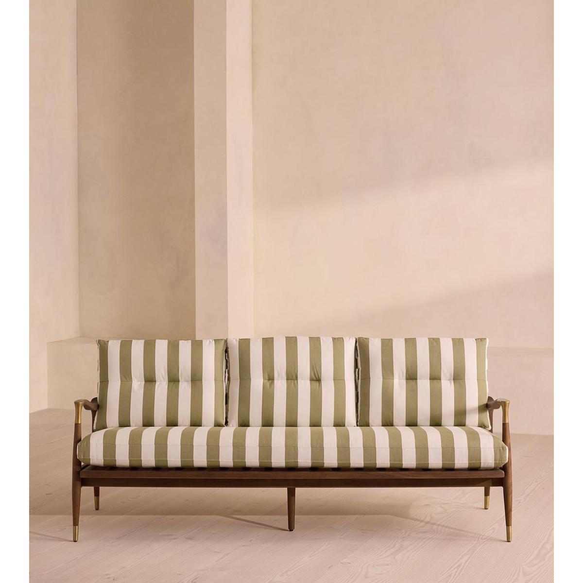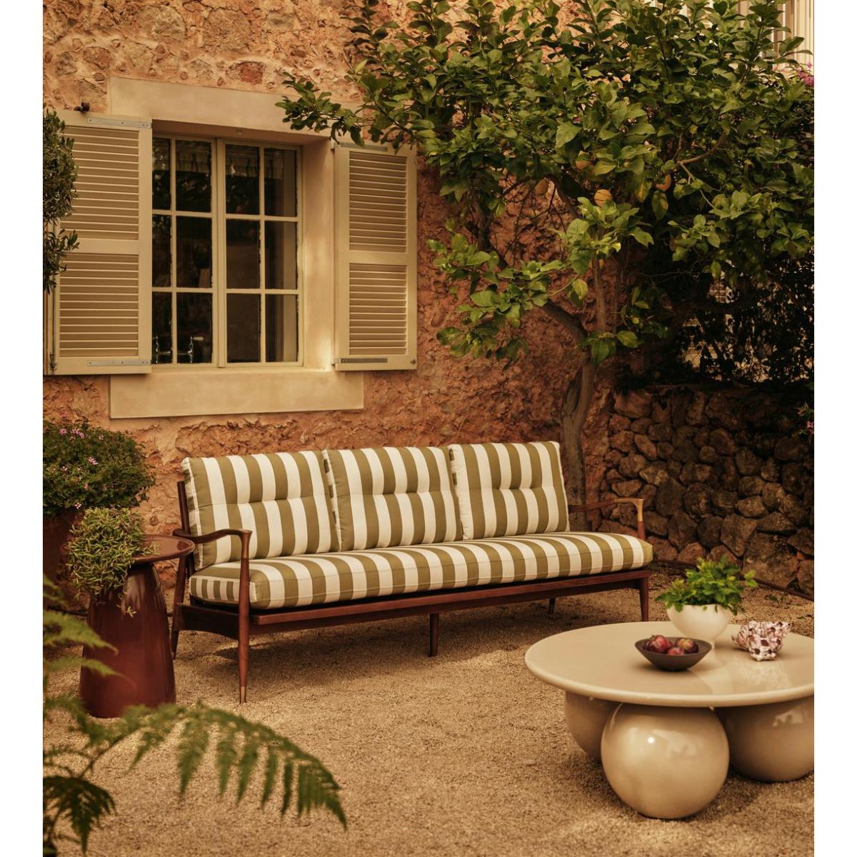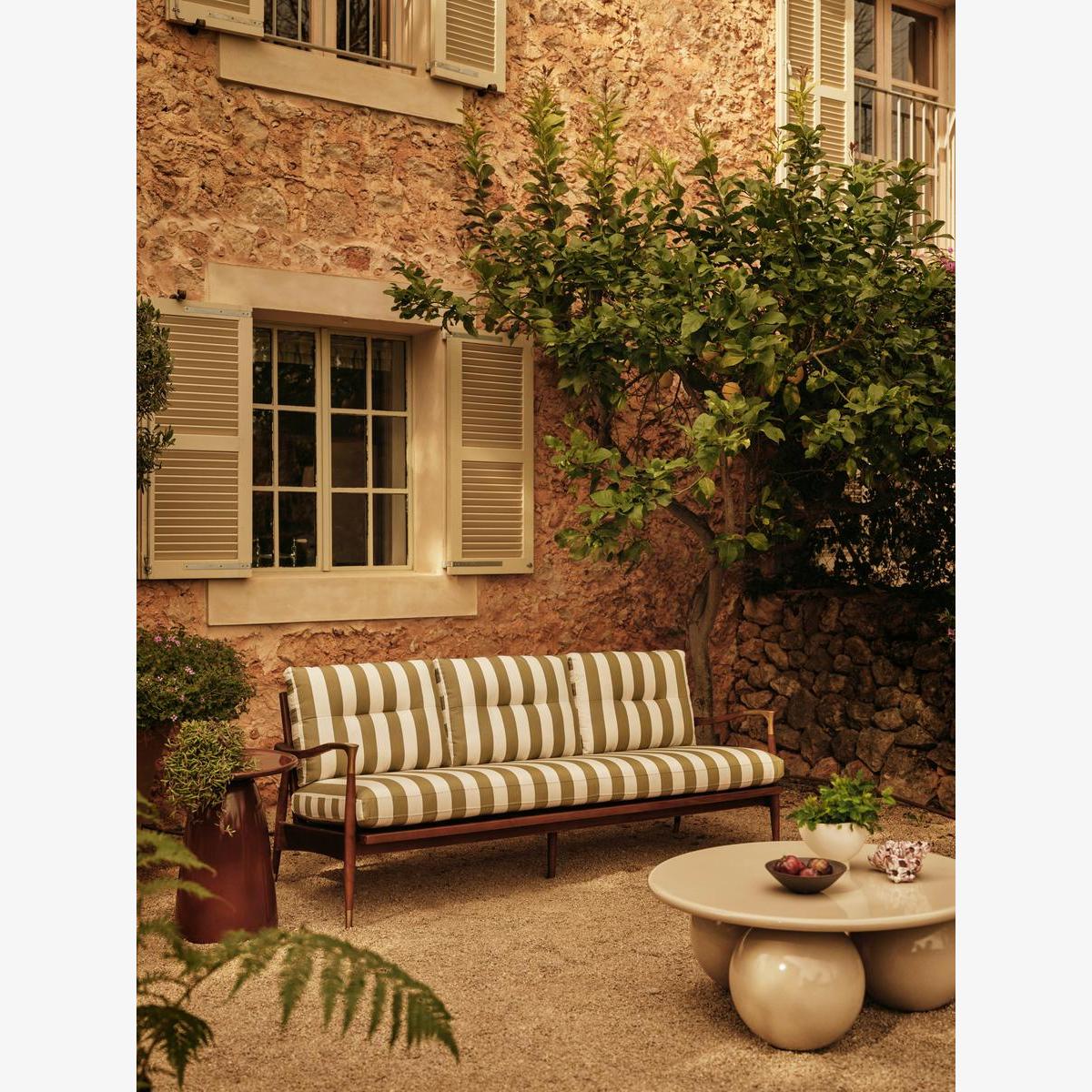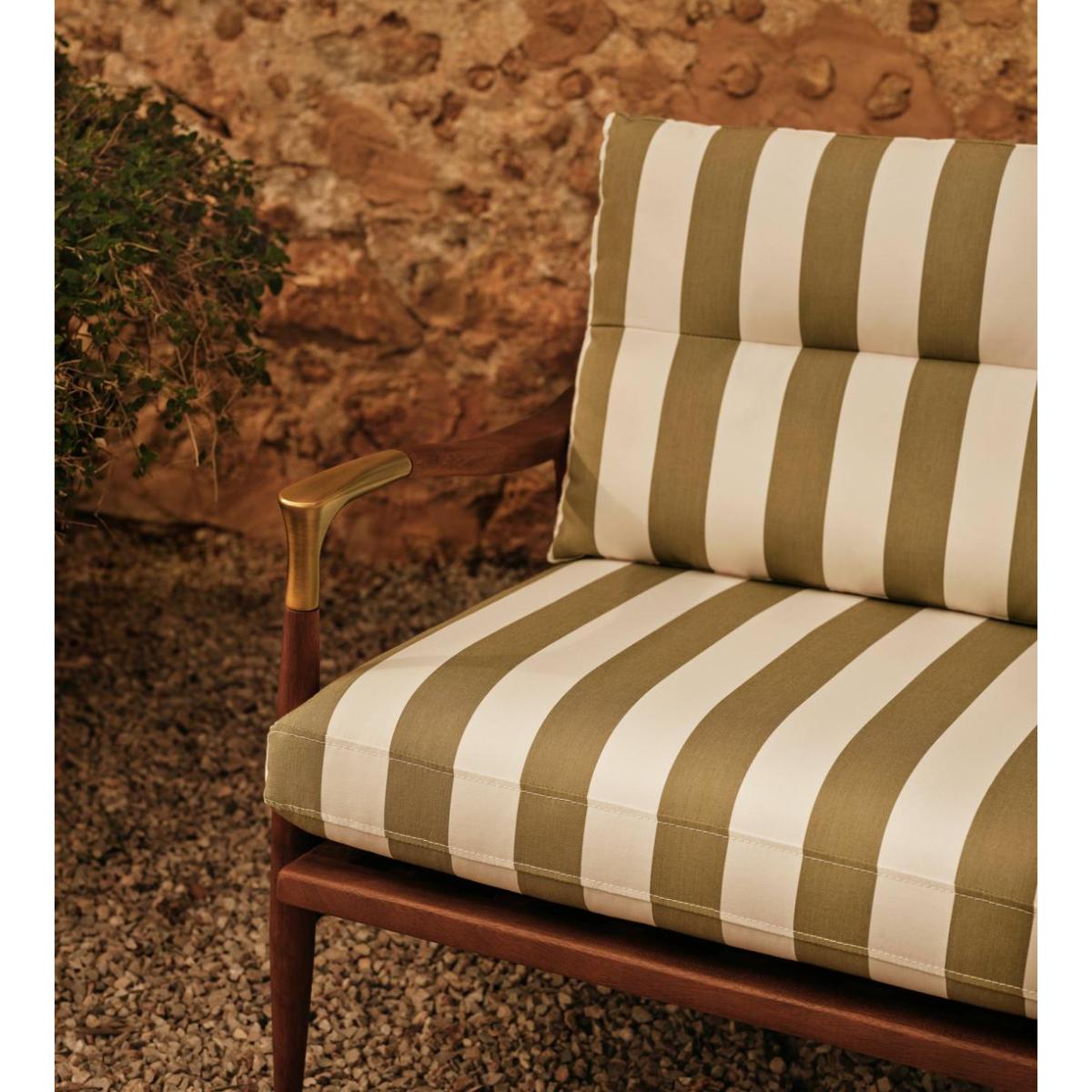 A well-known House style reimagined for your garden. The handcrafted frame is fitted with cushions upholstered in our Babington stripe fabric. Taking cues from the designs seen in Soho House 40 Greek Street, our Theodore sofa is now reimagined as part of your outdoor set-up. It combines cushions wrapped in white and green striped upholstery with a durable frame handcrafted from dark-stained iroko wood and finished with brass-coloured detailing.