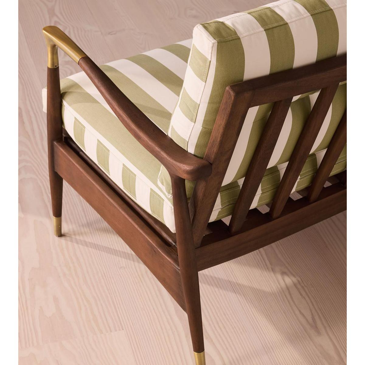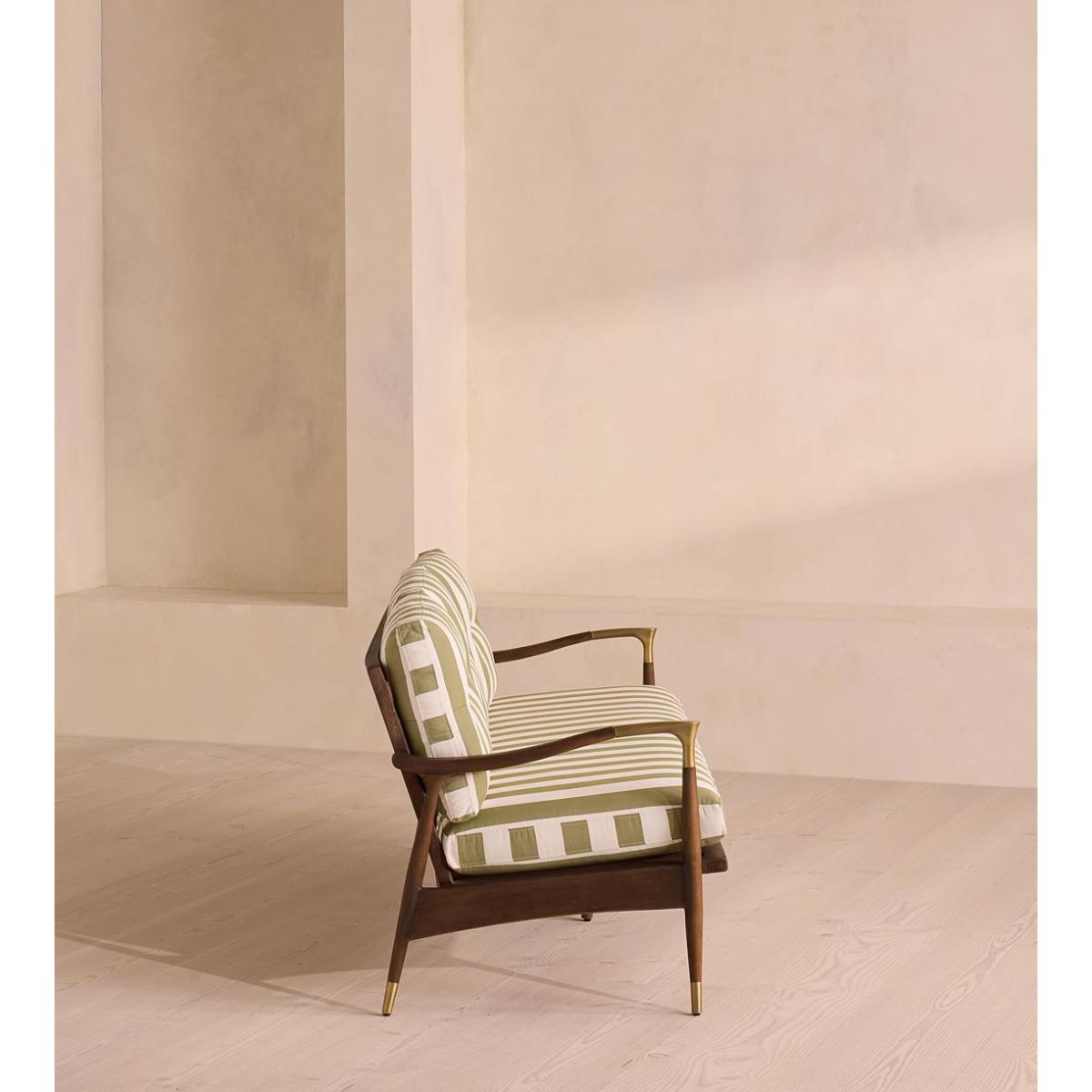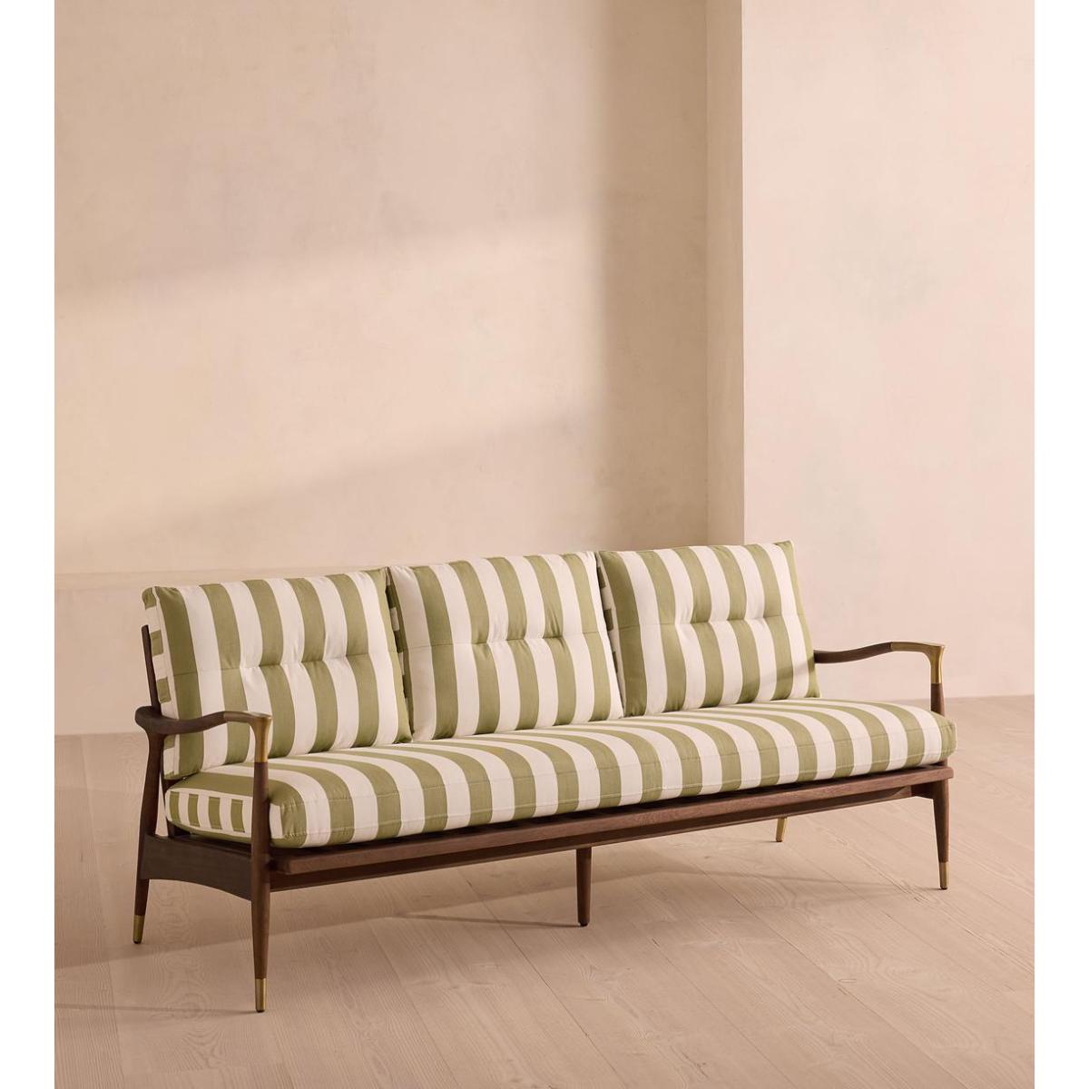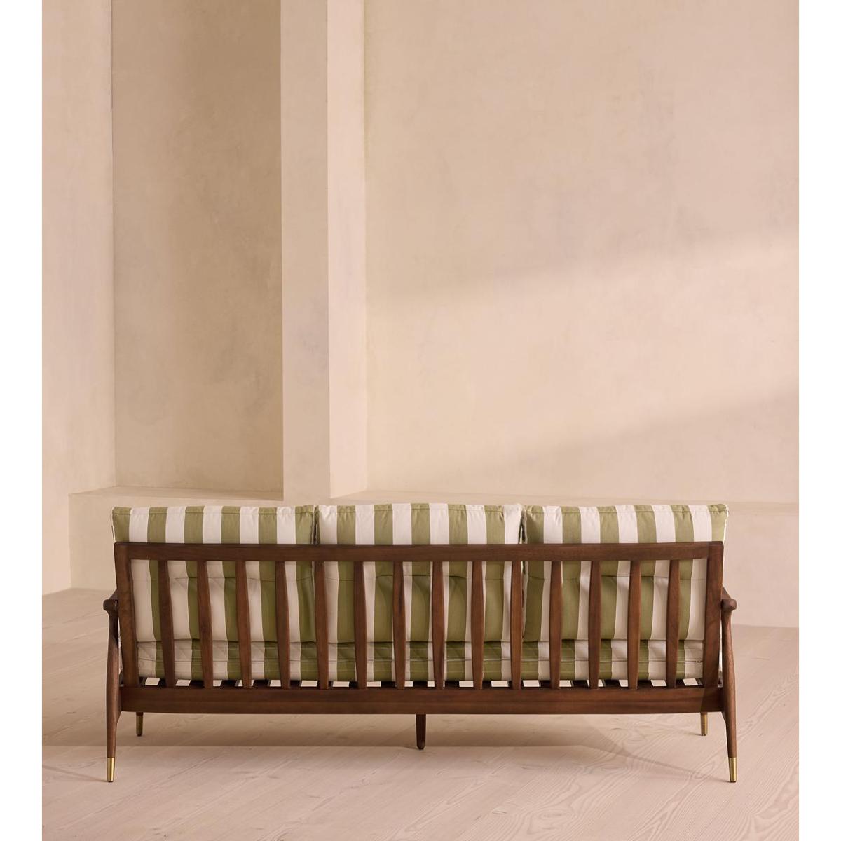 A well-known House style reimagined for your garden. The handcrafted frame is fitted with cushions upholstered in our Babington stripe fabric. Taking cues from the designs seen in Soho House 40 Greek Street, our Theodore sofa is now reimagined as part of your outdoor set-up. It combines cushions wrapped in white and green striped upholstery with a durable frame handcrafted from dark-stained iroko wood and finished with brass-coloured detailing.