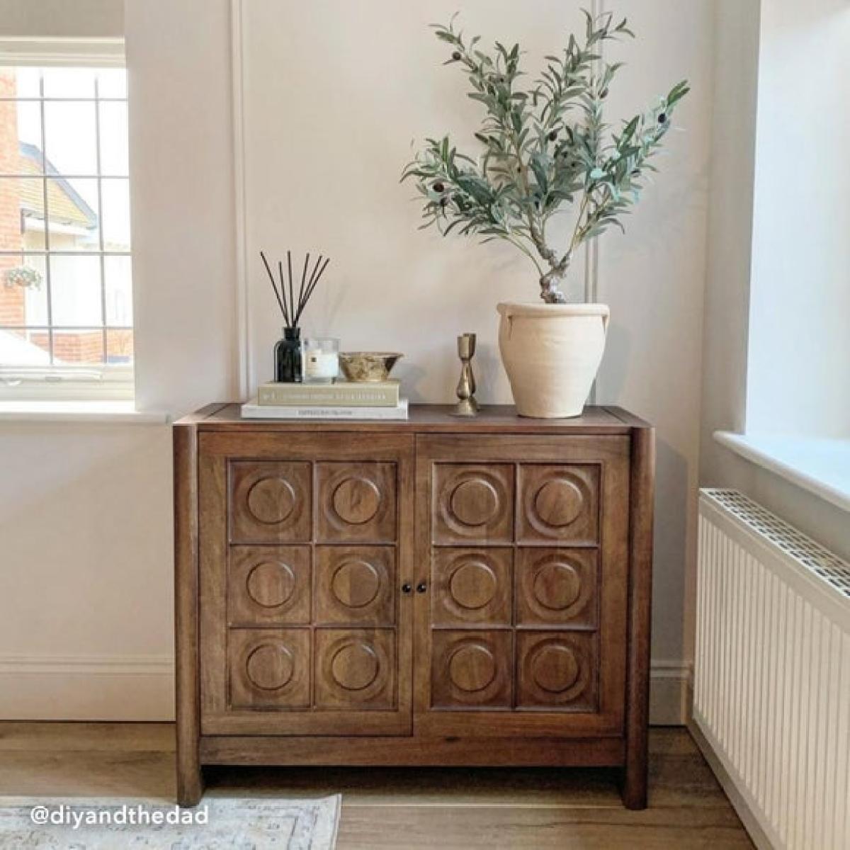 I love this sideboard for its warm mango wood finish, which adds instant character and a touch of natural charm to any space. It works particularly well in both rustic and modern interiors, thanks to its handcrafted feel and versatile design. Practical styling tips include using the top surface to display statement lighting or decorative objects like vases and bowls, while the internal storage is perfect for organising tableware, linens, or everyday essentials. Its size makes it a great focal point in living rooms, dining rooms, or hallways, and pairing it with contrasting textures like soft textiles or metal accents can create a balanced, inviting look.