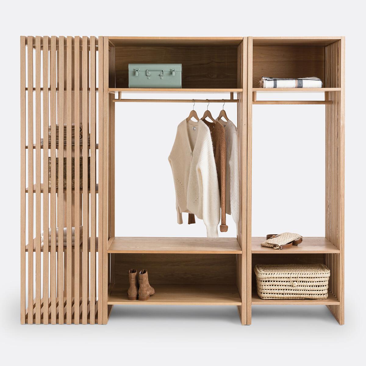 Create a unique dressing room with Theonie dressing modules. This well-designed wardrobe and shelf module allows for perfectly organised storage.Contemporary and functional, this unit has a reversible slatted wall from left to right according to your wishes. For a complete dressing room, combine it with other dressing modules from the Theonie range. Created by La Redoute Interiors. Product Details • 1 open wardrobe + 3 shelves (1 compartment at the top, 1 compartment at the bottom) • Structure in ash veneered MDF • FSC® certified wood • Openwork side slats in ash veneered MDF, dimensions. L2.5 x D3.5cm • Hanging rail in solid ash, diameter 2.5cm • Base in solid poplar • Nitrocellulose varnish finishDimensions. Overall • Width: 63cm • Height: 190cm • Depth: 53cm • Weight: 28kg. Usable space • Hanging space : L60 x H100cm • 2 compartments : L60 x H34 x D52cm • Base height: 15.5cmDelivery:. Assembly required. Available for home delivery. Note! Please check that all access points are large enough to accommodate your delivery (doors, stairs, lifts). • WOOD FROM SUSTAINABLY MANAGED FORESTS. FSC® certified wood comes from forests that are environmentally, socially and economically well managed. Dimensions and weight of parcel1 parcel • L198 x H16 x D61cm. 30kg