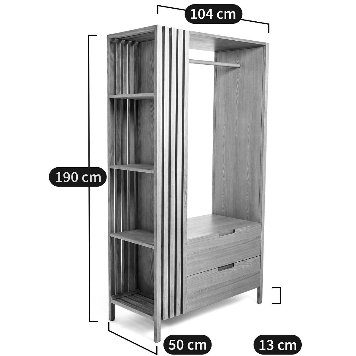 This well-thought-out wardrobe allows for perfectly organised storage. Its storage column open on the side will accommodate your accessories or decorative items. Product Details • Open wardrobe + 2 large drawers at the bottom. • 1 open storage column, with slats, with 4 fixed shelves, to be fixed to the right or left of the unit. • Pre-assembled unit and shelves in ash veneered MDF. • Side slats in ash veneered poplar: Dimensions 2.5 x 3.5cm. • Wardrobe bar in solid ash, diameter 3cm. • Base in solid poplar. • FSC® certified wood • Nitrocellulose varnish finish. • Soft closing system on the drawers (soft closing).Dimensions. Overall • Width: 104cm • Height: 190cm • Depth: 50cm. Usable space • Slatted column dimensions: L45 x D23.6 x H176.9cm • Height between shelves from the bottom: 43cm, 43cm, 43cm, 36cm • Size of 2 drawers: L74.6 x D50 x H23.8cm • Usable size of 2 drawers: L67 x D33.5 x H12.3cm • Dimensions of hanging unit:L75 x D50 x H112.7cm • Base height: 13cm • Weight: 67.9kgDelivery:. Delivered for self-assembly. It will be delivered to your door. Note! Please check that all access points are large enough to accommodate your delivery (doors, stairs, lifts). • WOOD FROM SUSTAINABLY MANAGED FORESTS. FSC® certified wood comes from forests that are environmentally, socially and economically well managed. Dimensions and weight of parcels2 parcels • L203 x D61.5 x H35.5cm. 40.35kg. • L84.5 x D58.5 x H27.5cm. 35.8kg.
