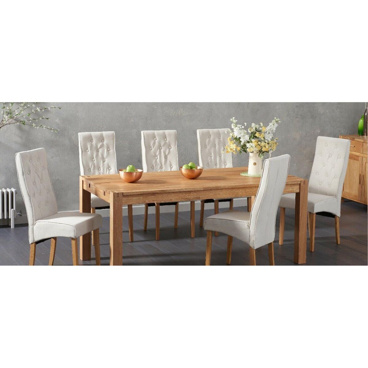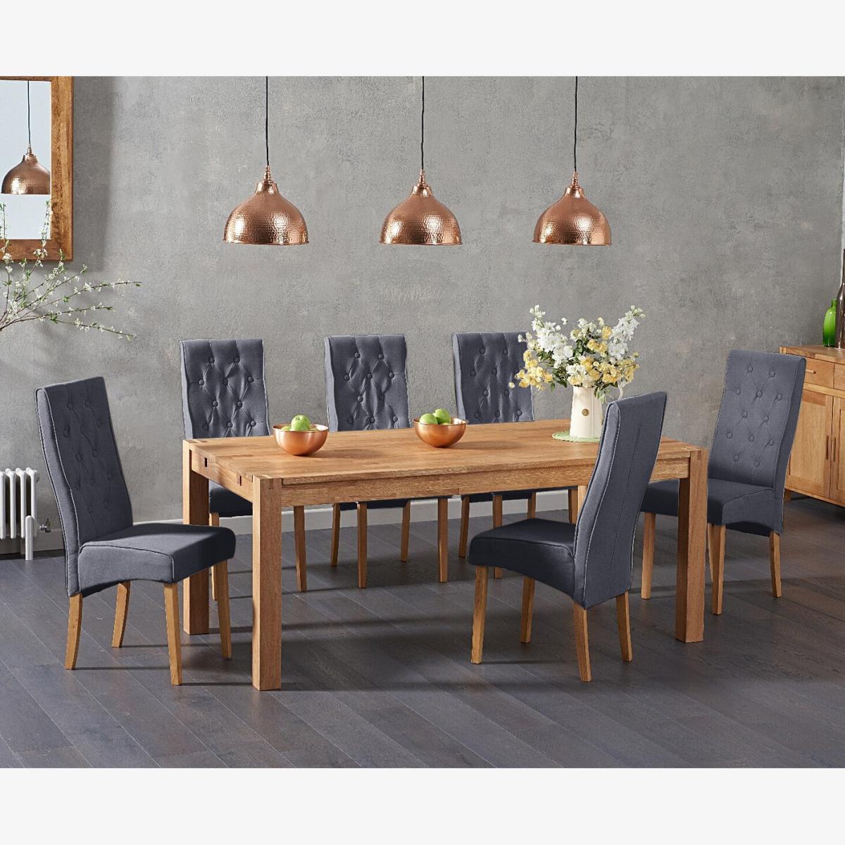Thetford 180cm Solid Oak Dining Table with Maya Fabric Chairs features beautiful solid oak strengthened with finger joints for robust and versatile family tables.