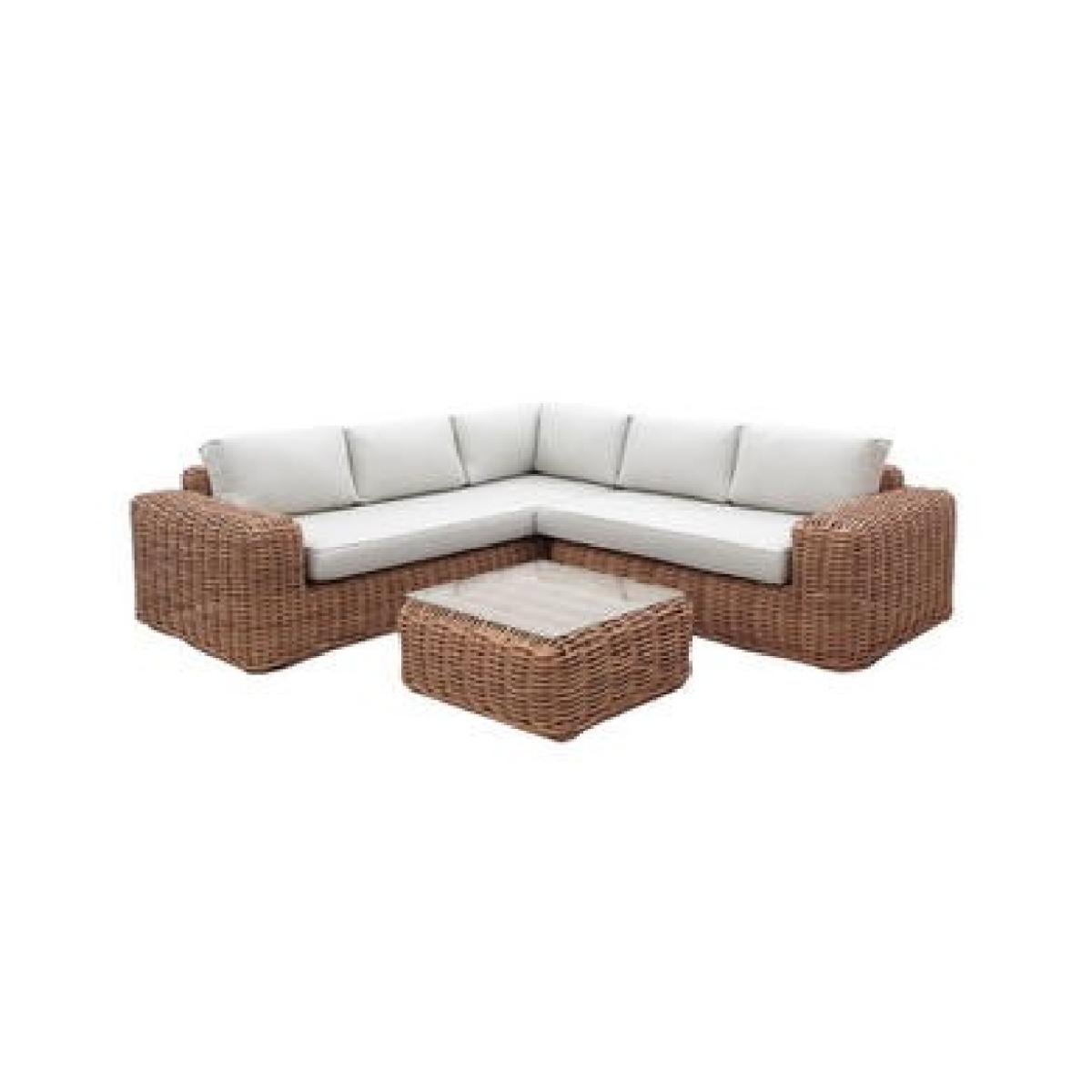 All about me Enhance any outdoor space or conservatory with this stylish corner sofa set. Its rounded silhouette creates an inviting, cosy space for you to relax and socialise. Accompanied by a matching coffee table to place your drinks and snacks, you'll be set up well into the evening. Finished in a waterproof and UV-resistant wicker weave, contrasting upholstery and a tempered glass table top, it'll make a stunning addition to your home all year round. Enhance the life of your garden furniture- This product has been designed to be used outdoors. To make the most of your furniture, we recommend that you store it indoors, move it to a sheltered position or protect it by covering it up in bad weather and over the winter period. Why not invest in one of our garden stores? They keep upholstery, such as cushions, dry to prevent mould or mildew from forming. Need to know Coffee table dimensions:W76 x D76 x H33 cm 3-seater sofa dimensions:W229 x D95 x H63 cm 2-seater sofa dimensions: W163 x D95 x H63 cm Max supported weight per seat: 120kg Overall weight: 106kg Seats: 5 Table thickness: 5mm Back cushion thickness: 21cm Seat cushion thickness: 15cm Colour: Natural and cream (upholstery) Finish:Wicker weave and upholstery Material: Synthetic woven rattan, steel (frames), fabric (upholstery), foam fill (cushions) and tempered glass (tabletop) For use: Indoors & outdoors (suitable for wooden floors) Assembly required: No Total number of boxes: 3 What's included? 1 x Coffee table 1 x 2-seater sofa 1 x 3-seater sofa 2 x Seat cushions (long) 6 x Back cushions