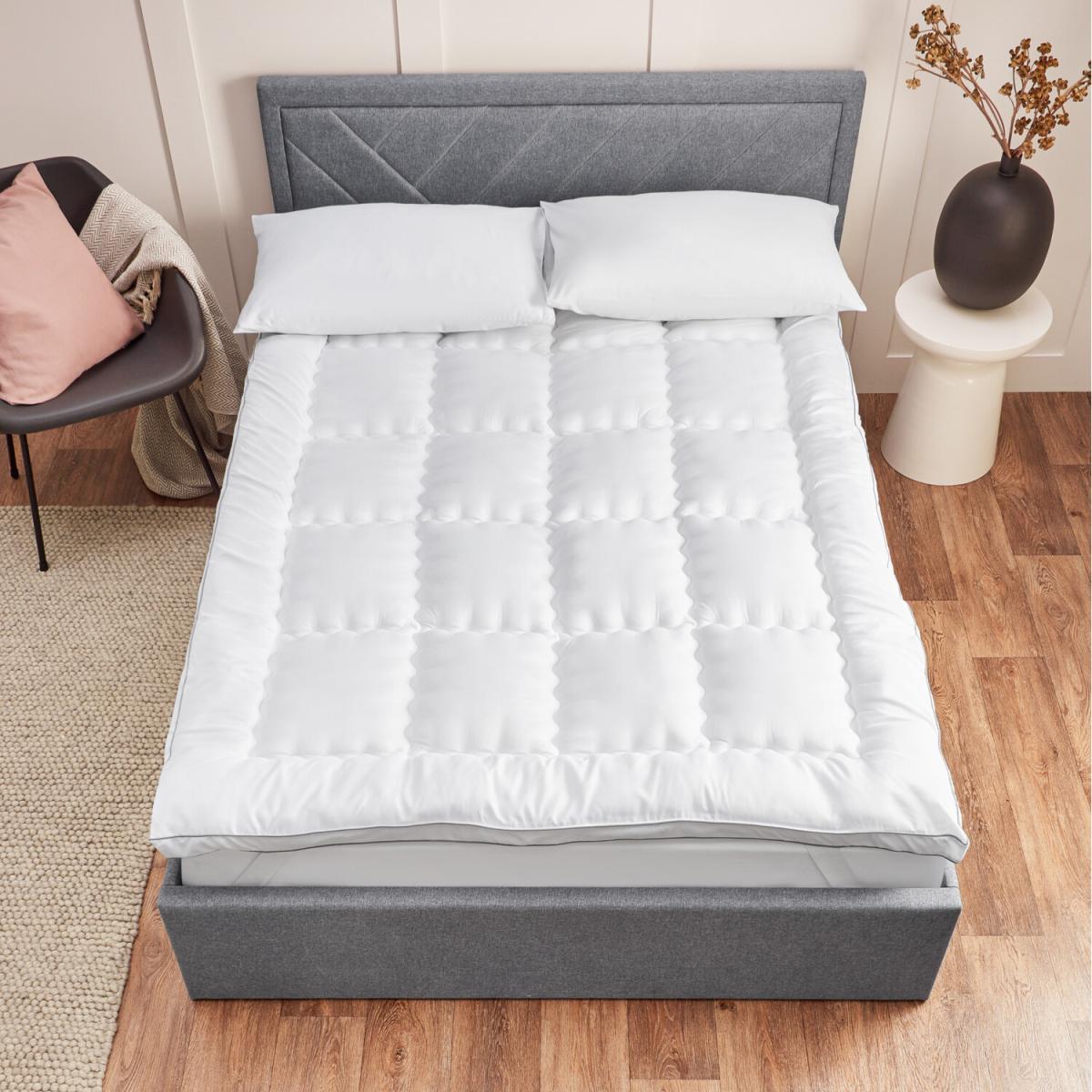 Thick mattress Topper lets you sink into deep sleep & wake up feeling rejuvenated. Supportive padding lets you sleep better & feel healthier. High grade 800gsm hollow fibre filling retains bounce making the mattress topper breathable, soft & fluffy. Air flow filling regulates temperature & keeps the mattress topper fresh. Add an extra layer of comfort to your bed, super soft topper ideal for sensitive skin. Plush square padding gives a luxurious feel similar to hotel bedding. Thick topper provides support to back, shoulders and hips suitable for all ages and sleeping positions. A cost effective solution to significantly upgrade the comfort of your old mattress. Available in single, small double, double & king size the mattress toper is also ideal for campervans, caravans, & sofa beds. High strength 4 side elasticated straps grip onto current mattress or bed base. These firmly hold mattress topper in place and keeps position through the night. Extra Double stitched quilting and straps to retain shape.