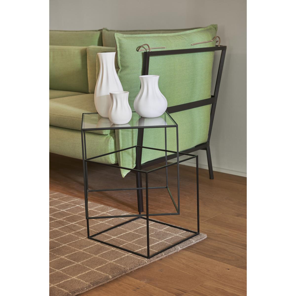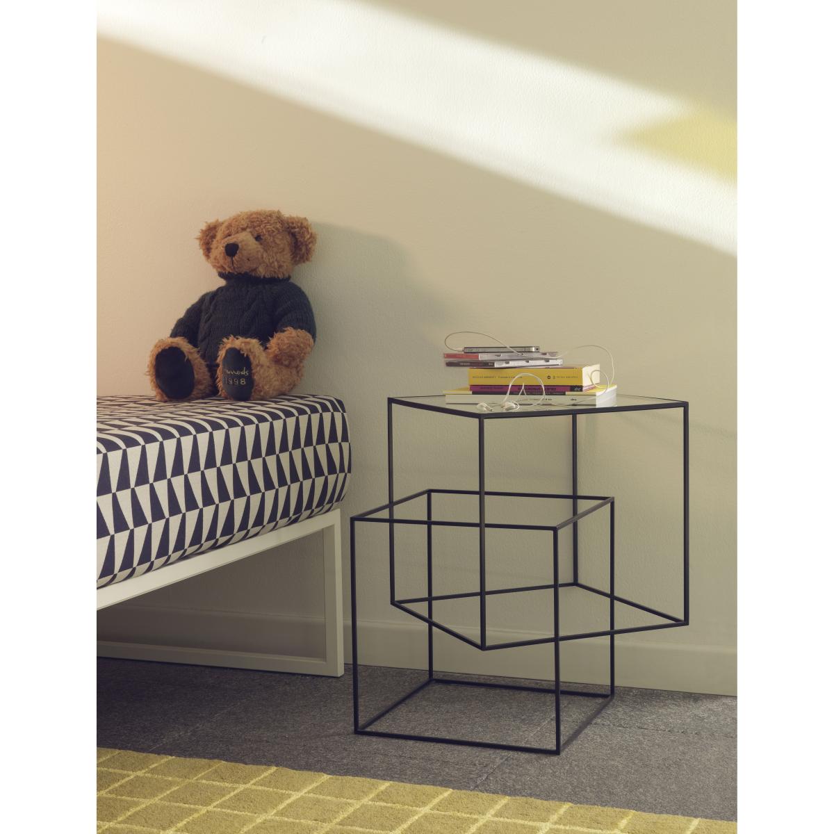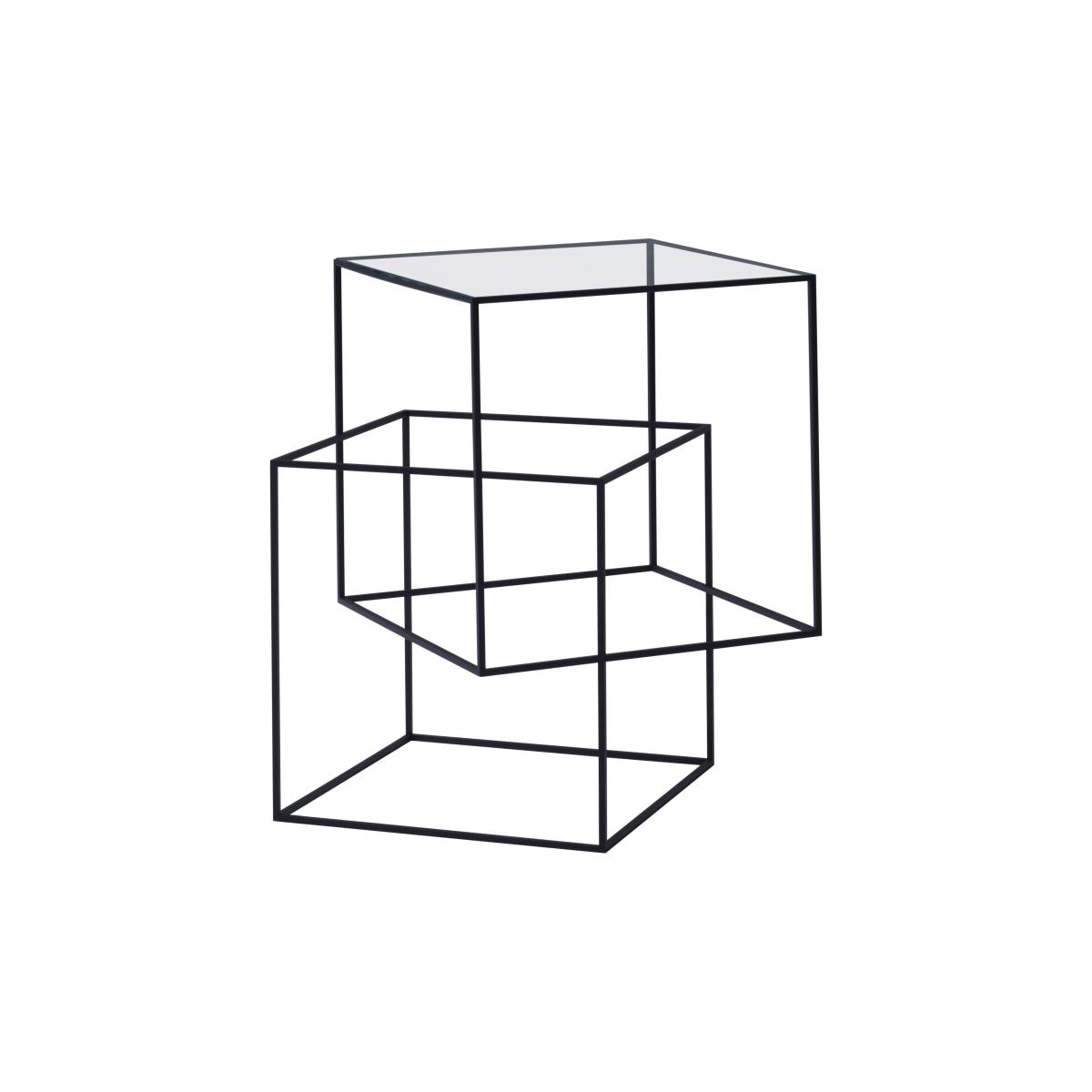 Japanese designer Nendo was inspired by the Japanese style to create a language rooted in his own time. This objective is reflected in clean forms, never lacking a touch of humour and friendliness. Nendo won the title of "Designer of the Year" at the Maison & Object show in January 2015, and his work garnered several international awards. His work is exhibited in the MoMA in New York, and in the Musée des Arts Décoratifs or the Centre Georges Pompidou in Paris. In 2011, Nendo stunned us again with "Thin Black Table": lightweight and spectacular, this side table is an ingenious appeal against the force of gravity. It's composed of two cubes, out of alignment, which are slotted into one another, creating the illusion of precarious balance. Mounted on a transparent glass tabletop, the upper cube doesn't touch the ground and appears to float. The tabletop appears to literally float mid-air, defying the laws of physics! The slender, black metal structure creates a series of geometric lines, angles and transparency, all suggestive of the designs of Escher's labyrinths. Playing with the perspective, the "Thin Black Table" side table disconcerts our references, throwing logic to the wind and flirting with absurdity. Nendo transforms a simple table into a complex and unique sculptural piece. Cultivating offsets, optical effects and interrogations, Nendo's creations stand out with their simple design, essential lines, and the sobriety of the materials which create the lightweight and ethereal form.